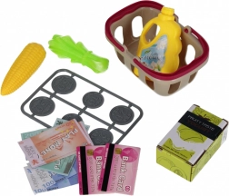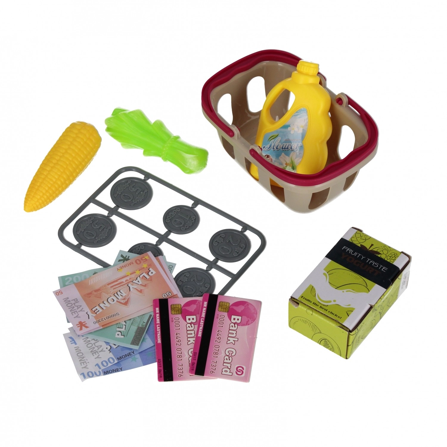 Bevat plastic etenswaren, een mandje, speelbankbiljetten en munten – alles wat nodig is voor compleet winkeltje spelen.