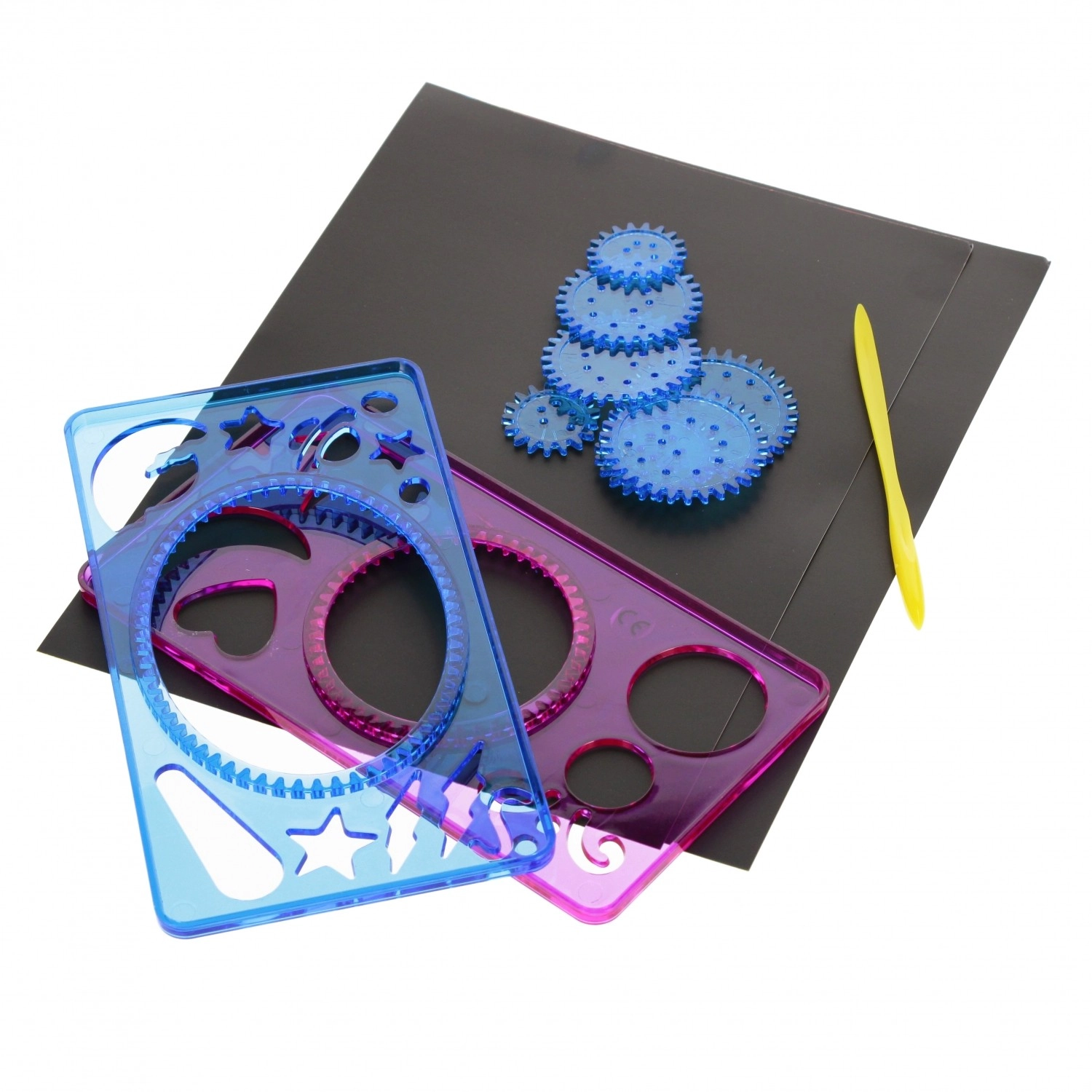 - 7× spirograaf-sjabloon, 1× pen/stylus, 4× vel papier