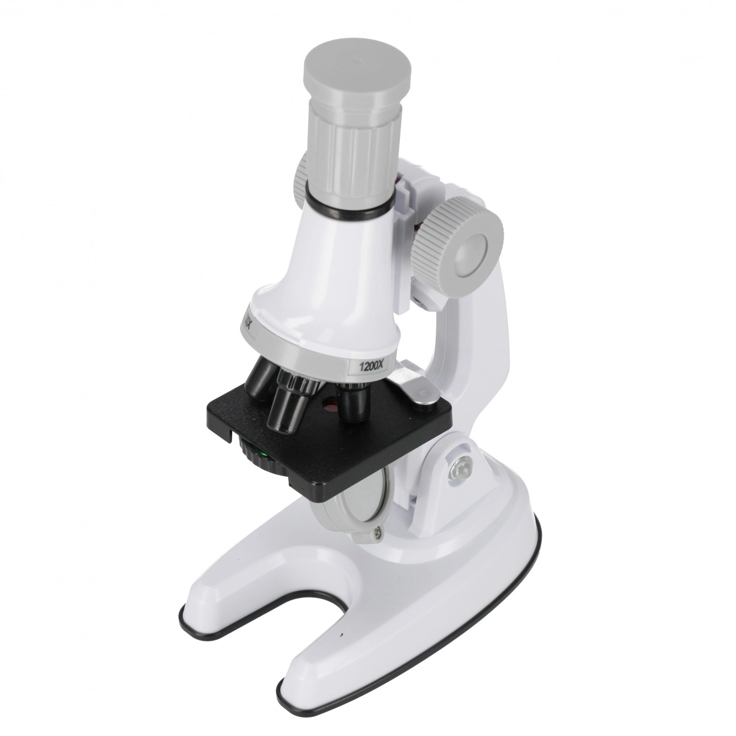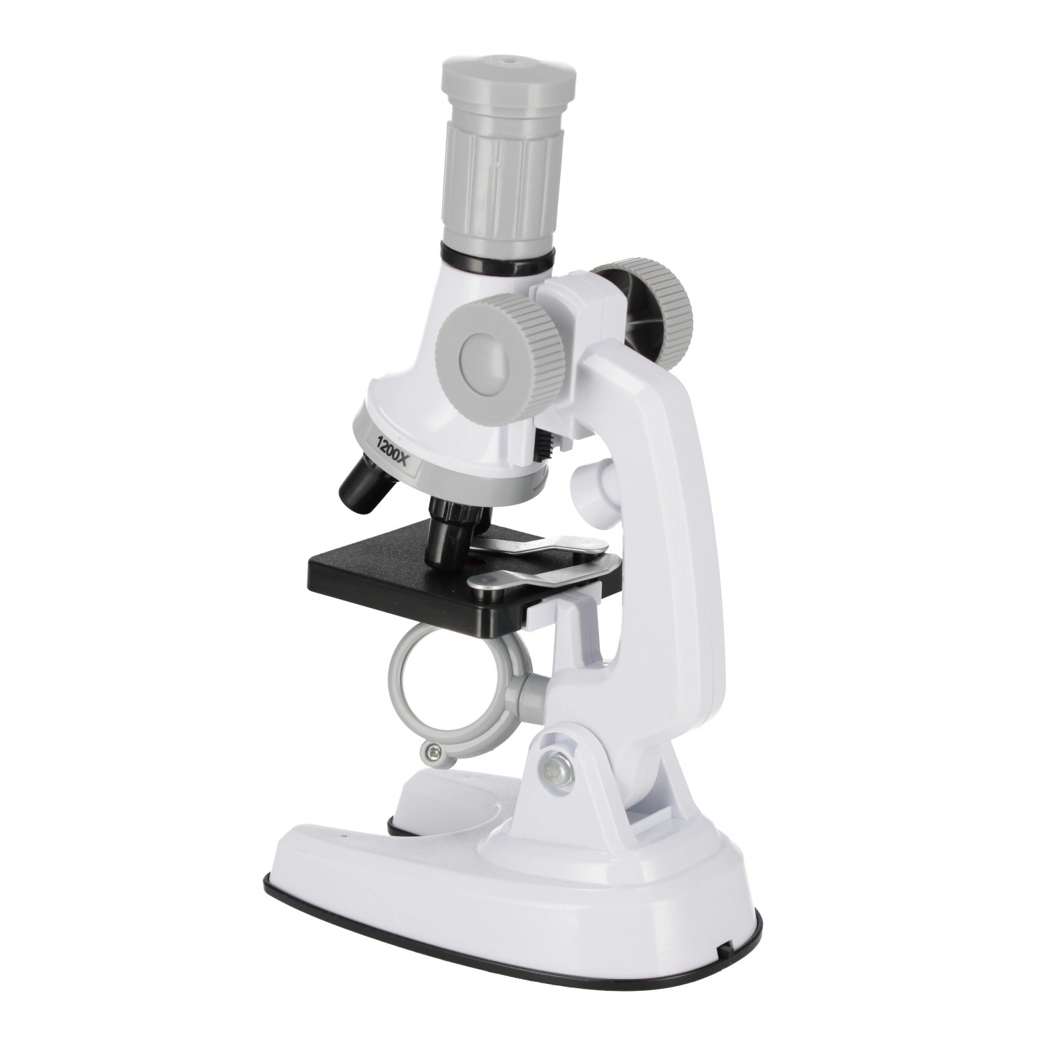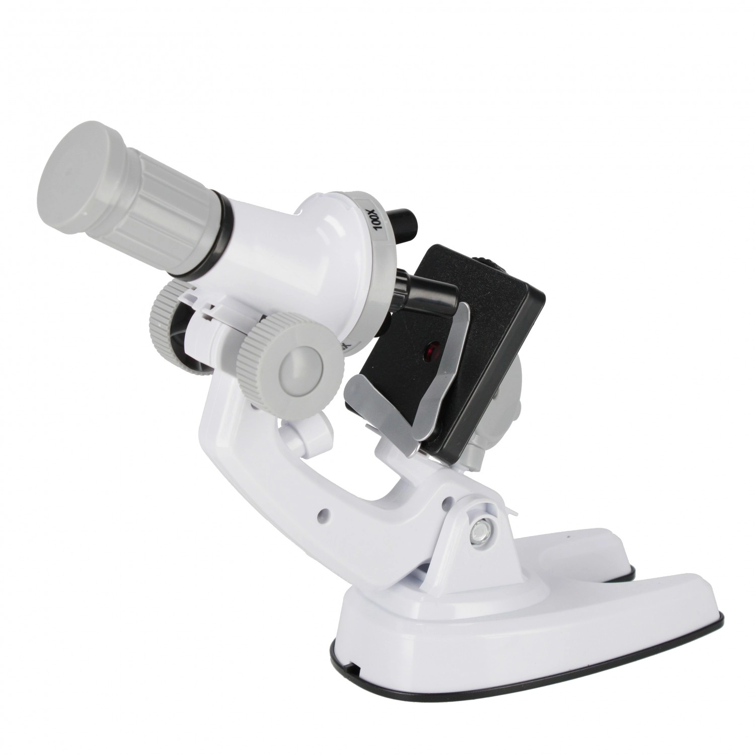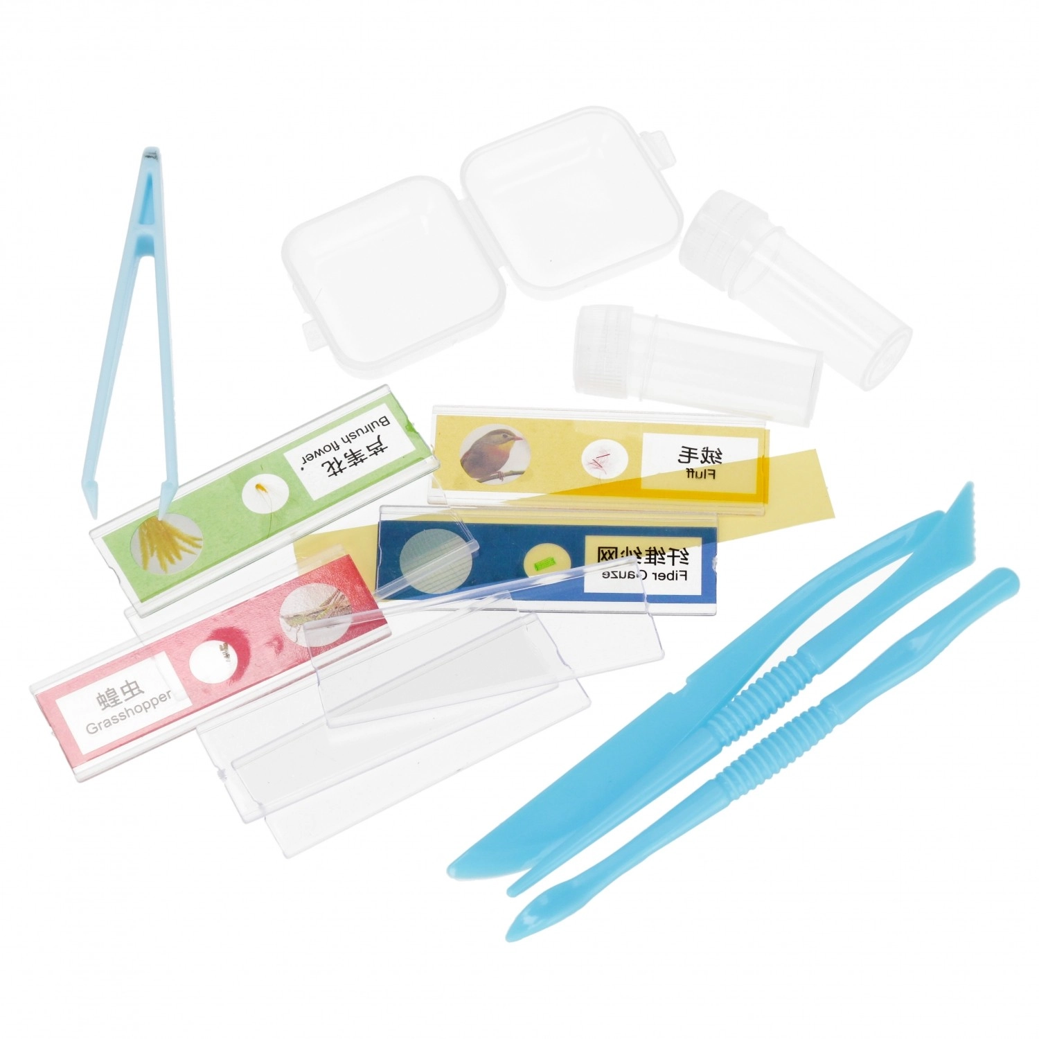 - Complete set: microscoop, 1× pincet, 3× messen/preparaatglaasjes, 2× reageerbuizen, 1× doosje, 4× onderzoekssjablonen met tekeningen, 4× lege sjablonen, handleiding