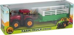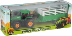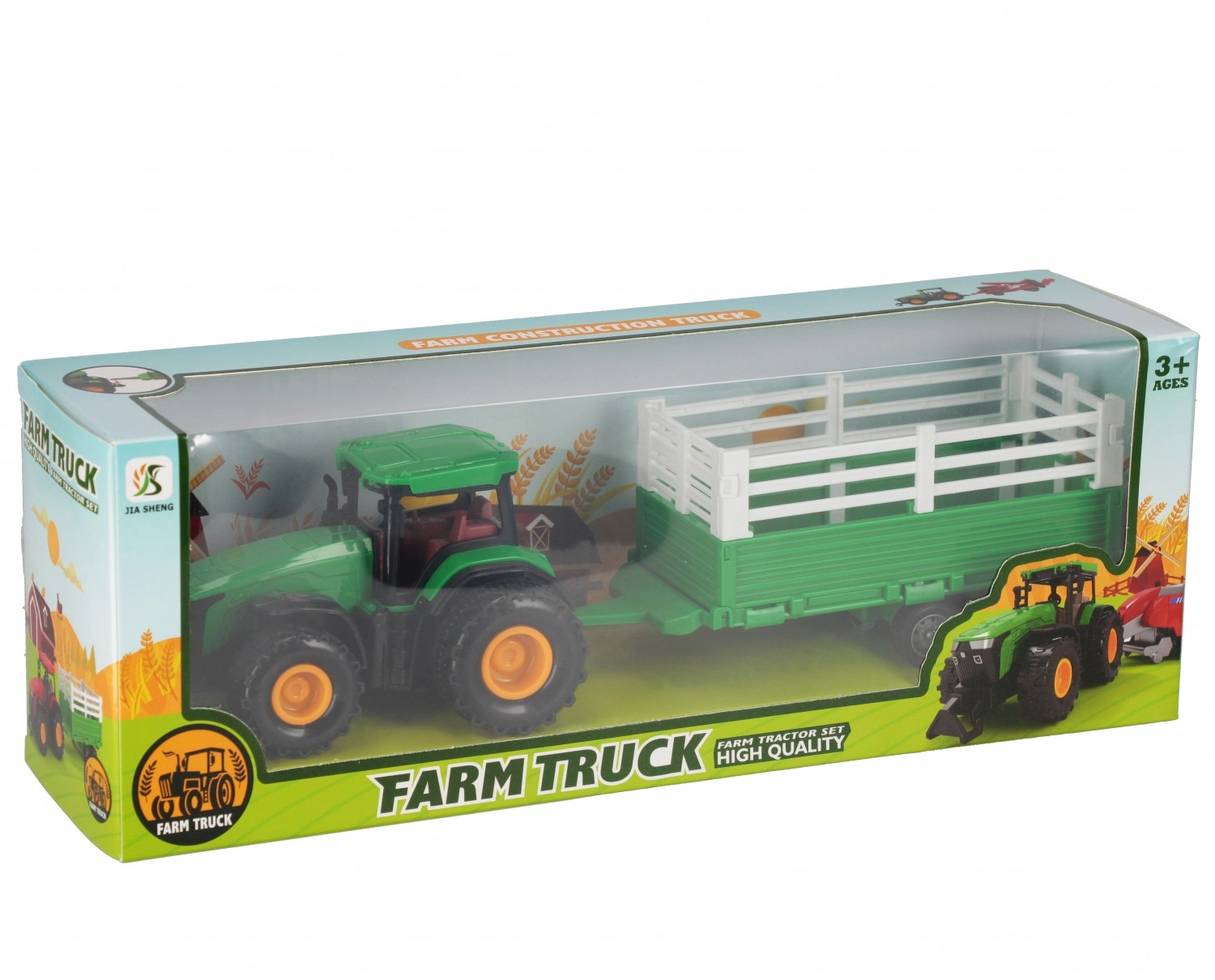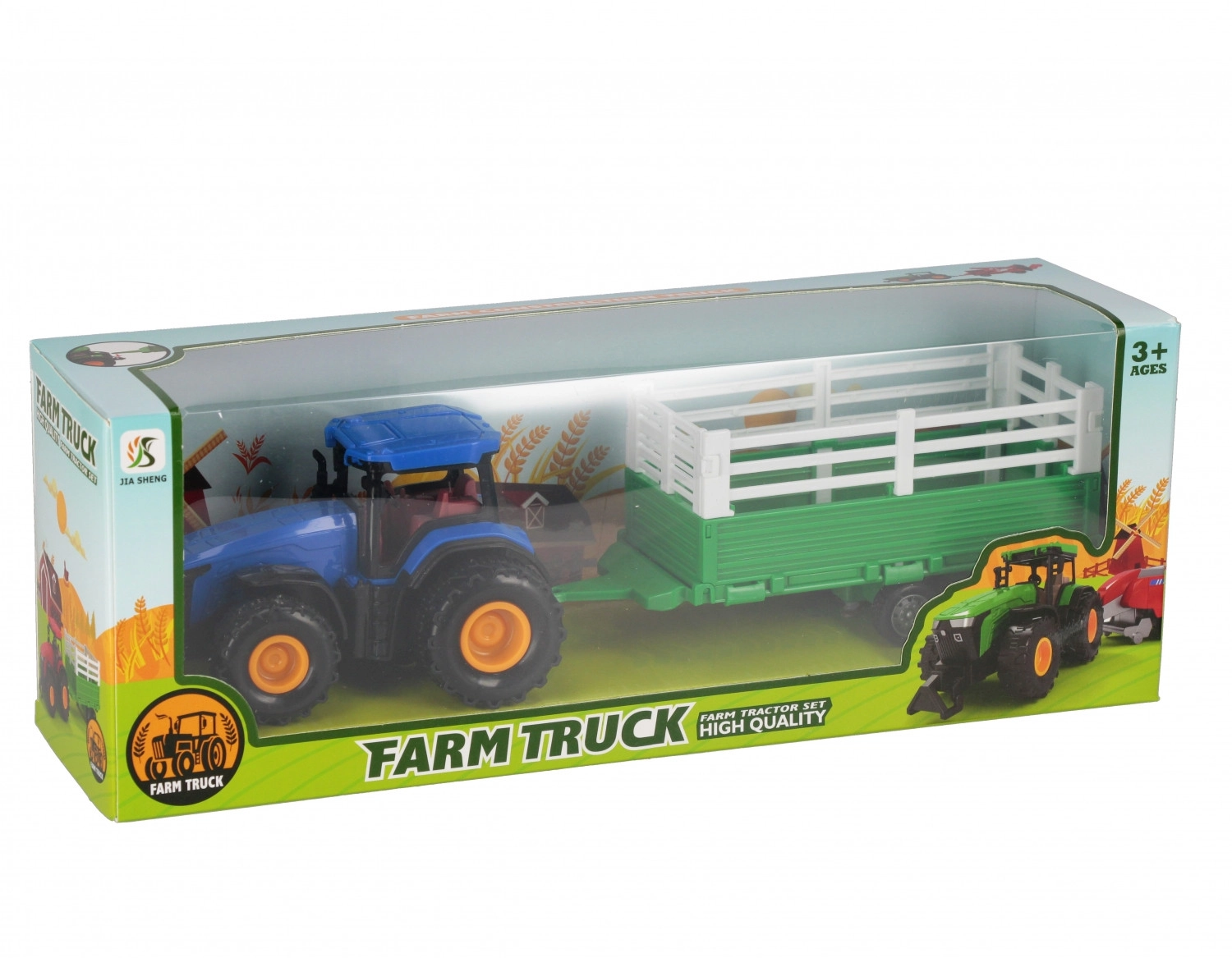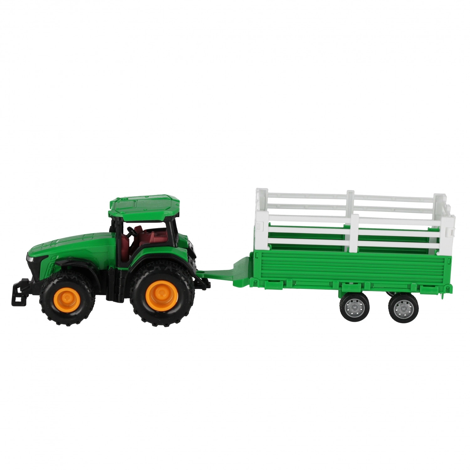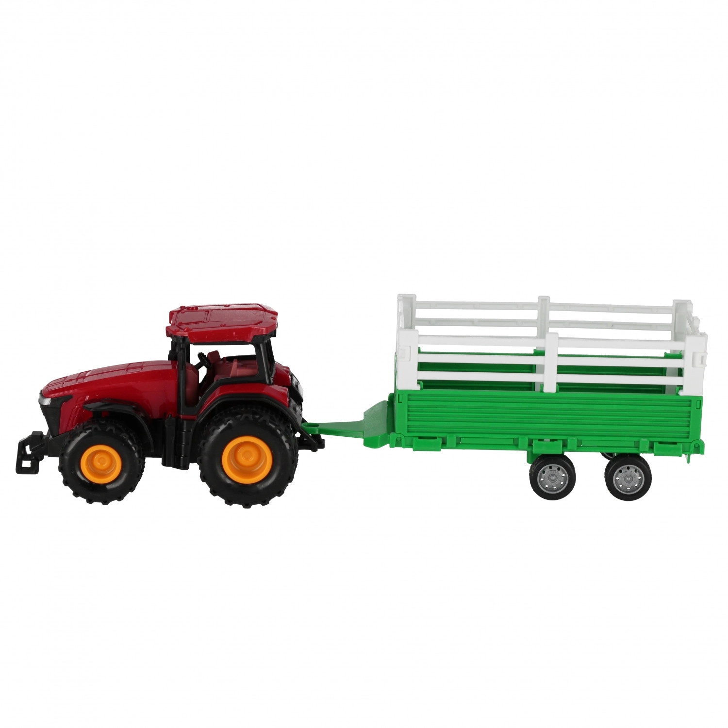 Leuke landbouwset voor kleine bestuurders – tractor met afneembare aanhanger en pull-back functie. Trek hem naar achteren en de tractor rijdt vanzelf weg. Realistische details, rollende wielen en een aanhanger voor het vervoeren van lading. Afmeting ca. 33 × 12 × 9 cm, geschikt voor kinderen vanaf 3 jaar.