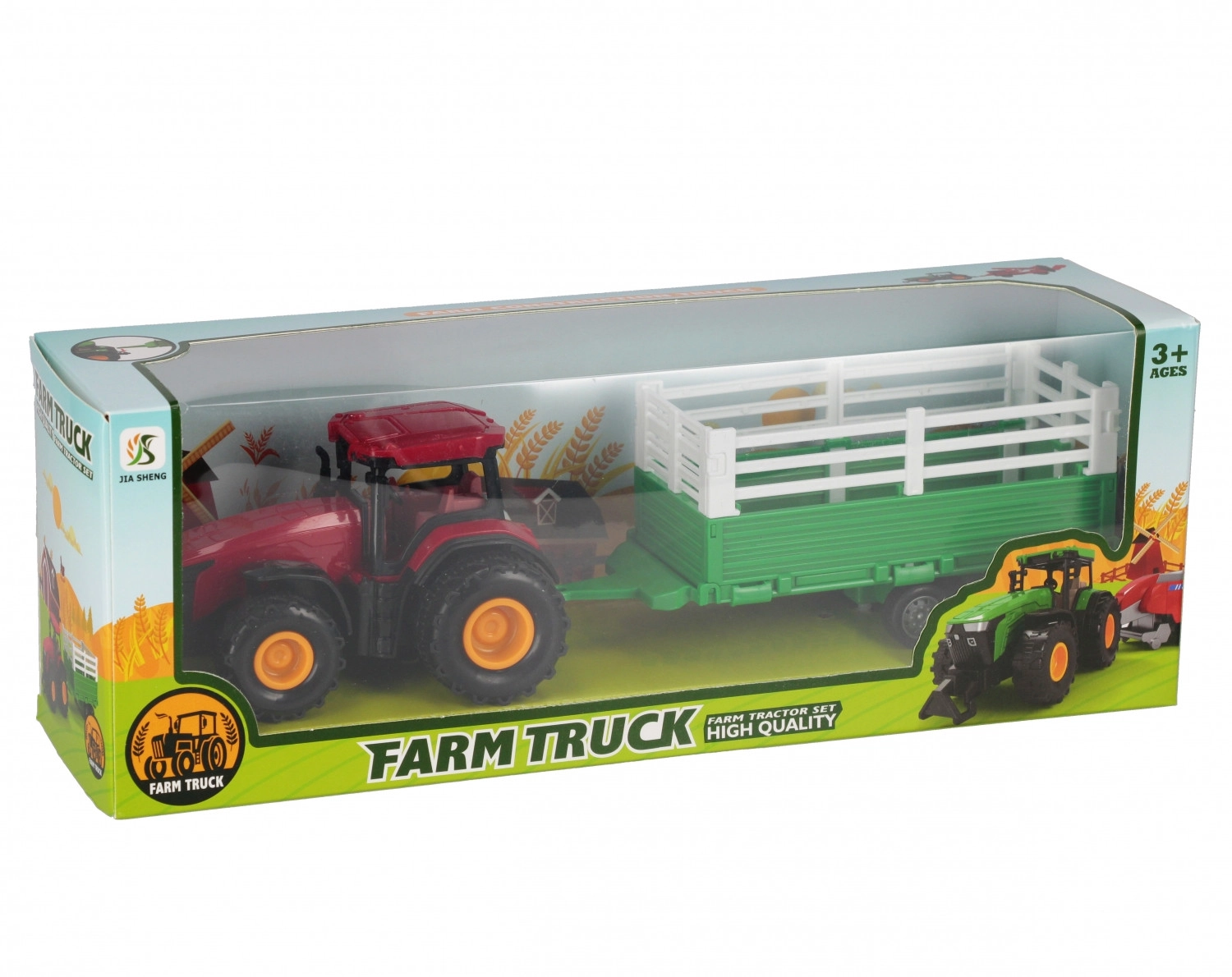 Ontdek het boerderijspeelplezier met een speelgoedset die de fantasie en fijne motoriek stimuleert. De tractor met afneembare aanhanger biedt een realistische uitvoering, vrij draaiende wielen en het populaire pull-back mechanisme – trek naar achteren, laat los en kijk hoe hij vooruit rijdt.