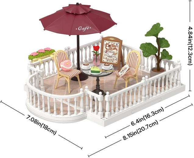 Breid je miniatuurwereld uit met de stijlvolle Chic Café terras en creëer een schattig caféhoekje of een zonnige relaxplek. De set is ontworpen voor eenvoudige koppeling met kamers uit de Rolife Super Creator-serie en brengt authentieke details mee – van een tafeltje met zoetigheden tot aan een parasol en bloemen.