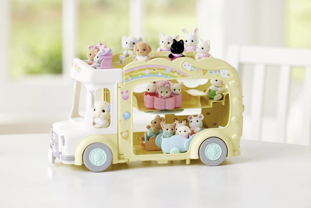 Ontdek de Kleurrijke bus SYLVANIAN FAMILIES – een multifunctionele driedekkerbus die na uitklappen verandert in een pretpark. Biedt plaats aan maximaal 28 kinderfiguurtjes en bevat een draaimolen, schommel, glijbaan en een karretje gemaakt van verplaatsbare stoelen. Stimuleert creatief spel, fantasie en fijne motoriek, is compatibel met andere SYLVANIAN FAMILIES-sets en is ideaal voor kinderen vanaf 3 jaar.