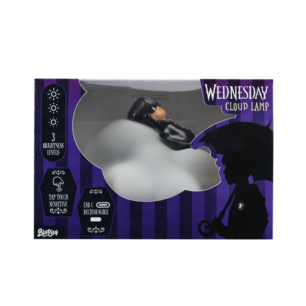 Stijlvolle bureaulamp in de vorm van een wolkje in het officieel gelicentieerde WEDNESDAY-design die elke fan zal aanspreken. Biedt zacht, rustgevend licht voor de kinderkamer, slaapkamer en werkhoek en dankzij de USB-voeding sluit je haar eenvoudig aan op een adapter, powerbank of laptop.