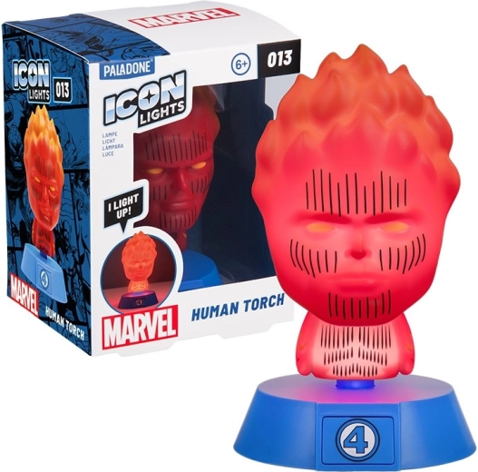 Stijlvolle nachtlamp met het motief van de FANTASTISCHE VIER – Human Torch die zacht, sfeervol licht brengt voor een ontspannen ambiance. Perfect voor op het nachtkastje, een plank of een bureau, en ideaal als cadeau voor stripfans. Werkt op 2× AAA-batterijen (niet inbegrepen).