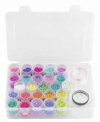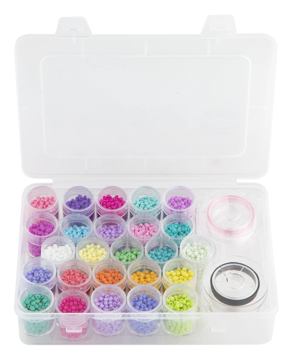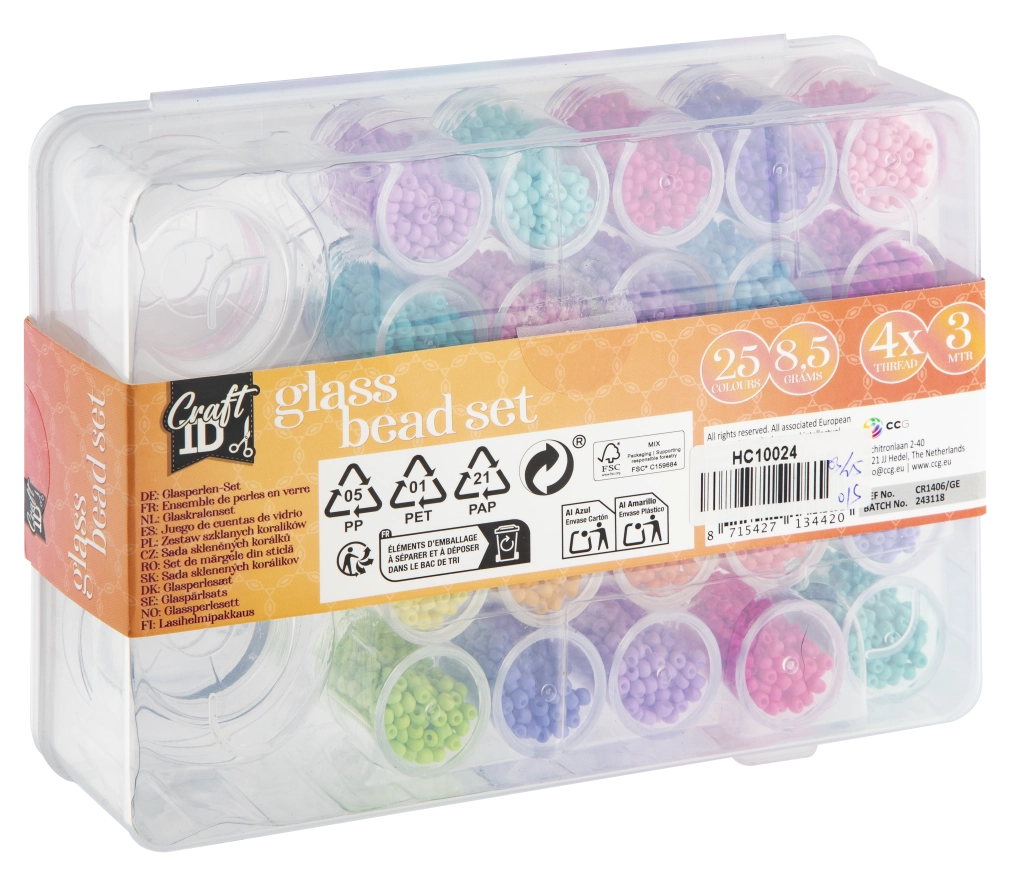Deze grote set glaskralen biedt een ruime keuze aan 25 kleuren voor al je creatieve projecten. Dankzij de transparante organizer met compartimenten heb je alle tinten overzichtelijk bij de hand en kun je snel kleuren combineren voor unieke designs.