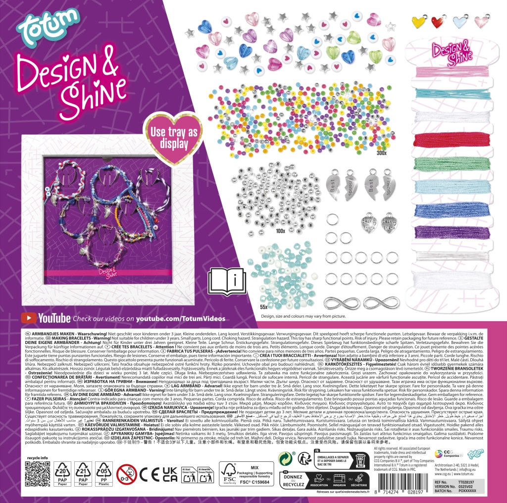 Maak je eigen unieke armbanden met de creatieve set TOTUM Design & Shine. Bevat alles wat je nodig hebt – gekleurde en glinsterende kralen, koordjes en draadmaterialen en stijlvolle bedels voor een perfecte afwerking. Ideaal voor het stimuleren van creativiteit, fijne motoriek en samen plezier maken met vrienden.