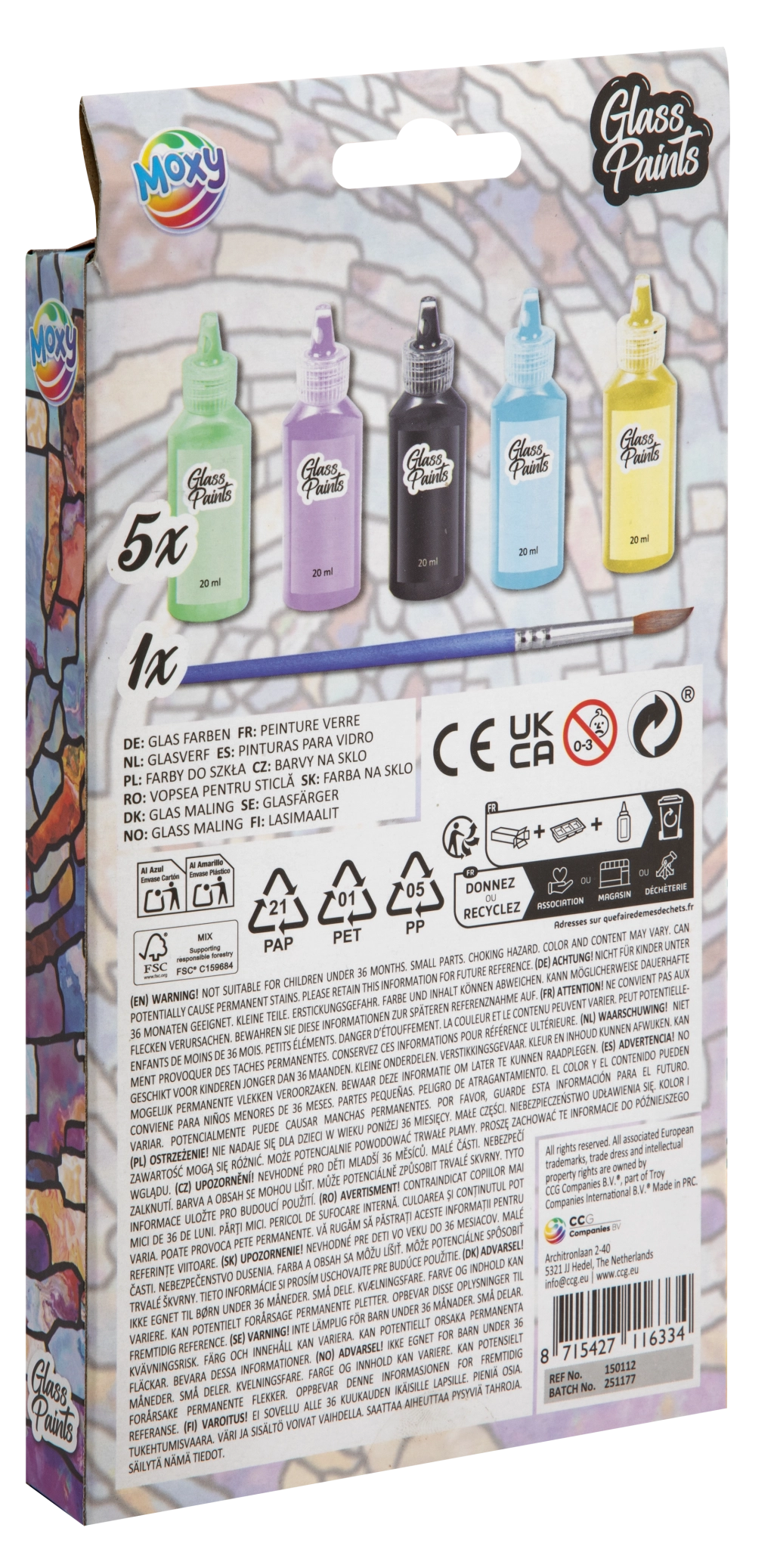 - Complete set: 5× glasverf (20 ml) + penseel