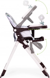 Breed, verstelbaar en tweelaags blad met uitneembare bovenste inzet is eenvoudig te reinigen. Geïntegreerd speelgoed vermaakt het kind tijdens het wachten op het eten en ondersteunt de motorische ontwikkeling.