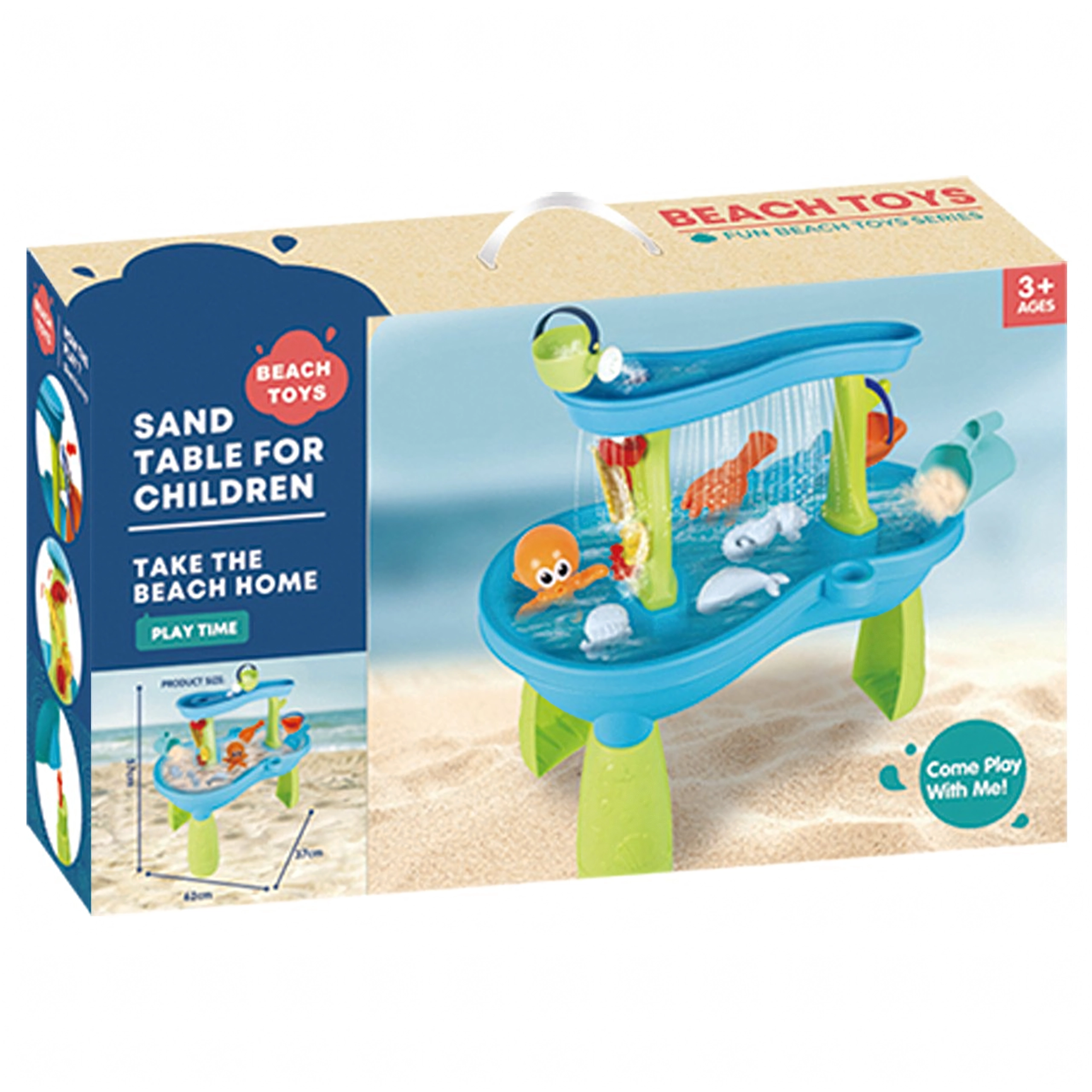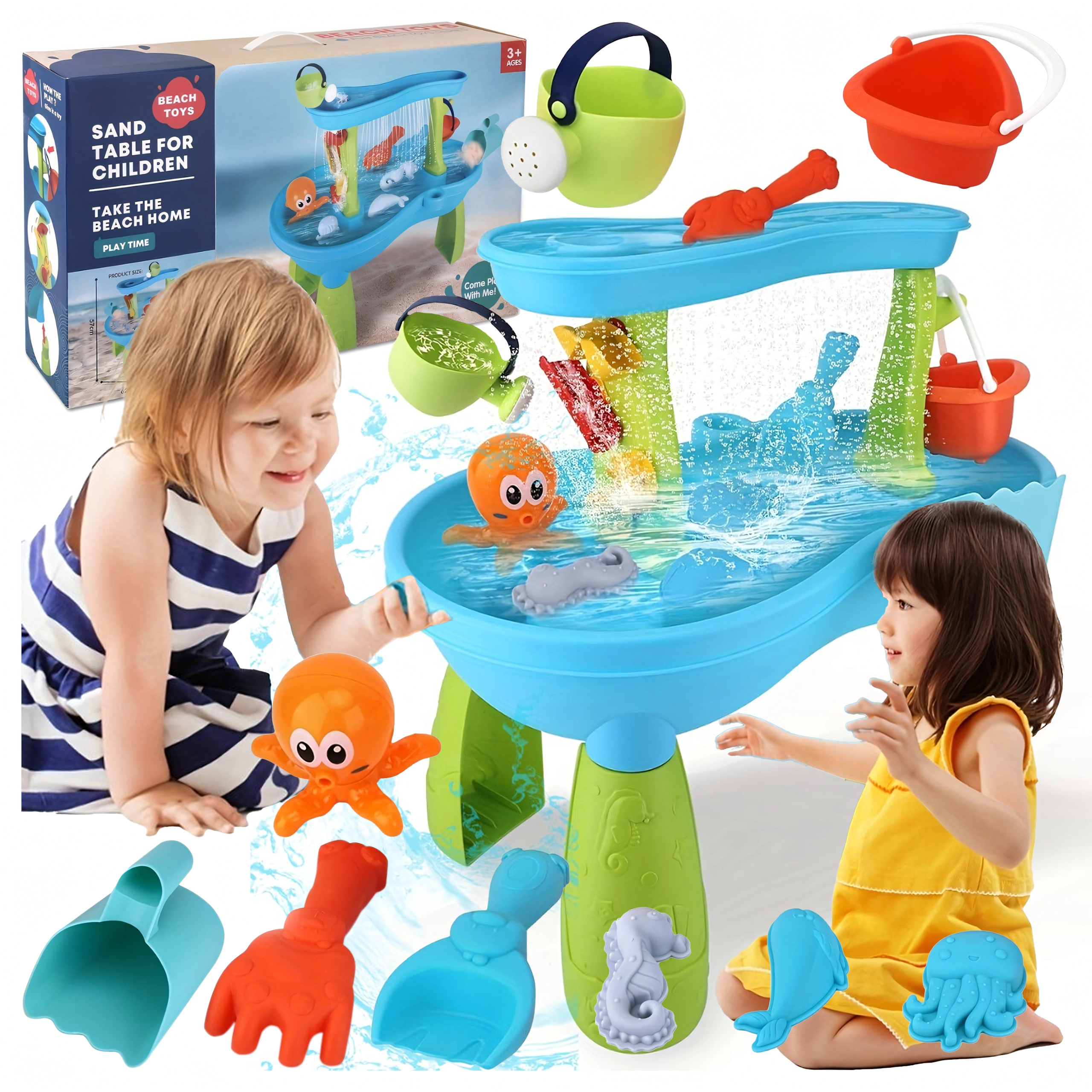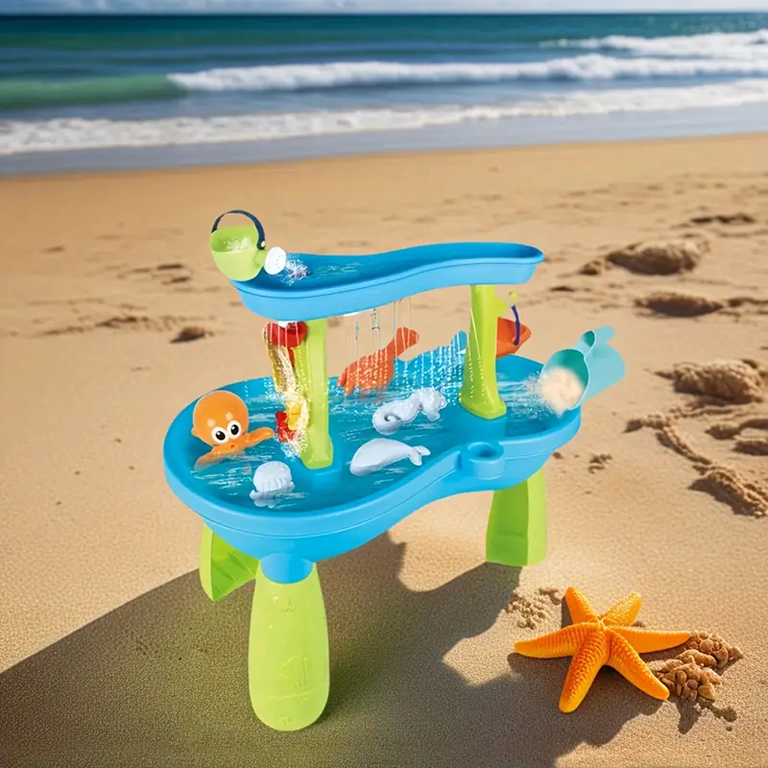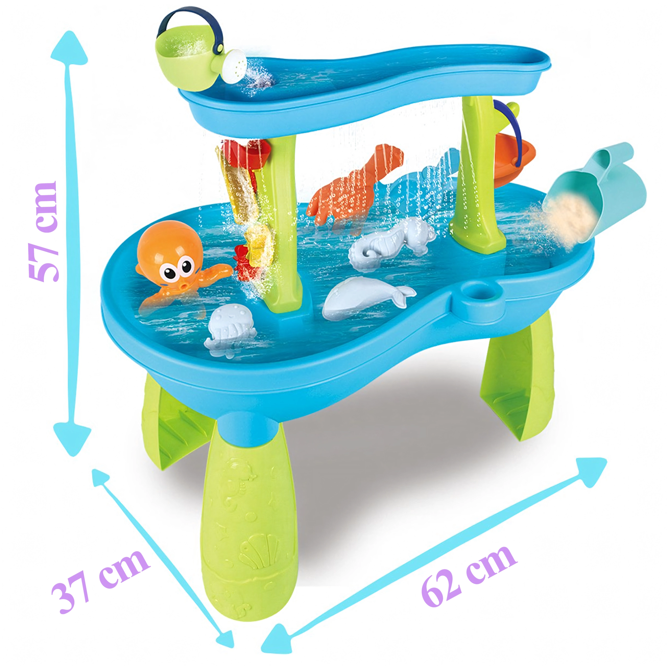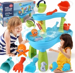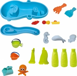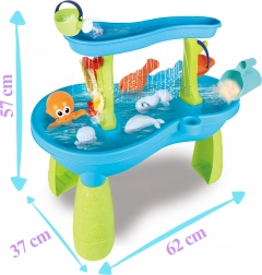 Inclusief een uitgebreide set accessoires: schepjes, emmers, gieter, vormpjes met zeediertjes, glijgootjes en wateroverlopen. Dankzij meerdere speelzones en slimme gootjes is het spel gevarieerd, bevordert het samenwerking tussen kinderen en stimuleert het hun verbeelding.