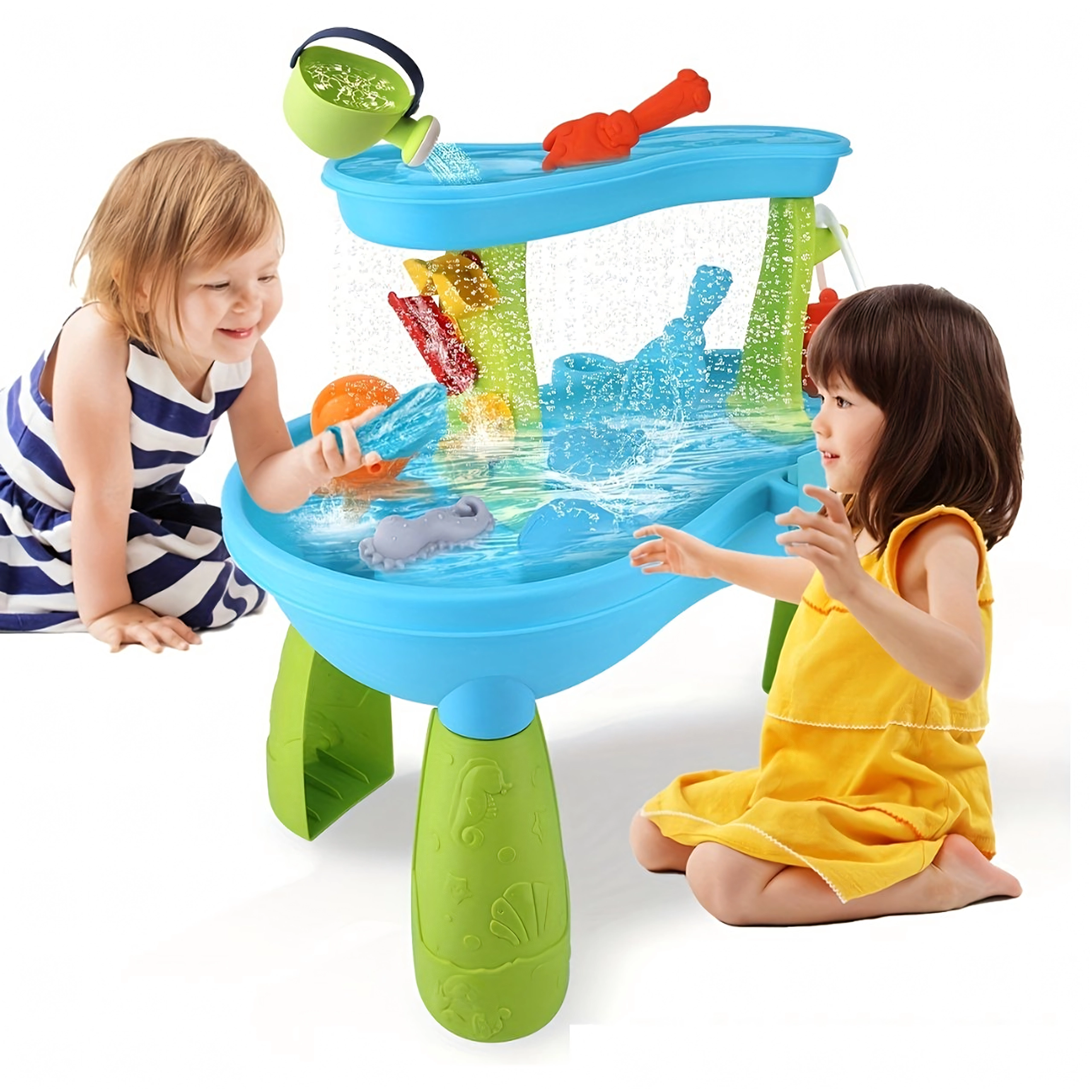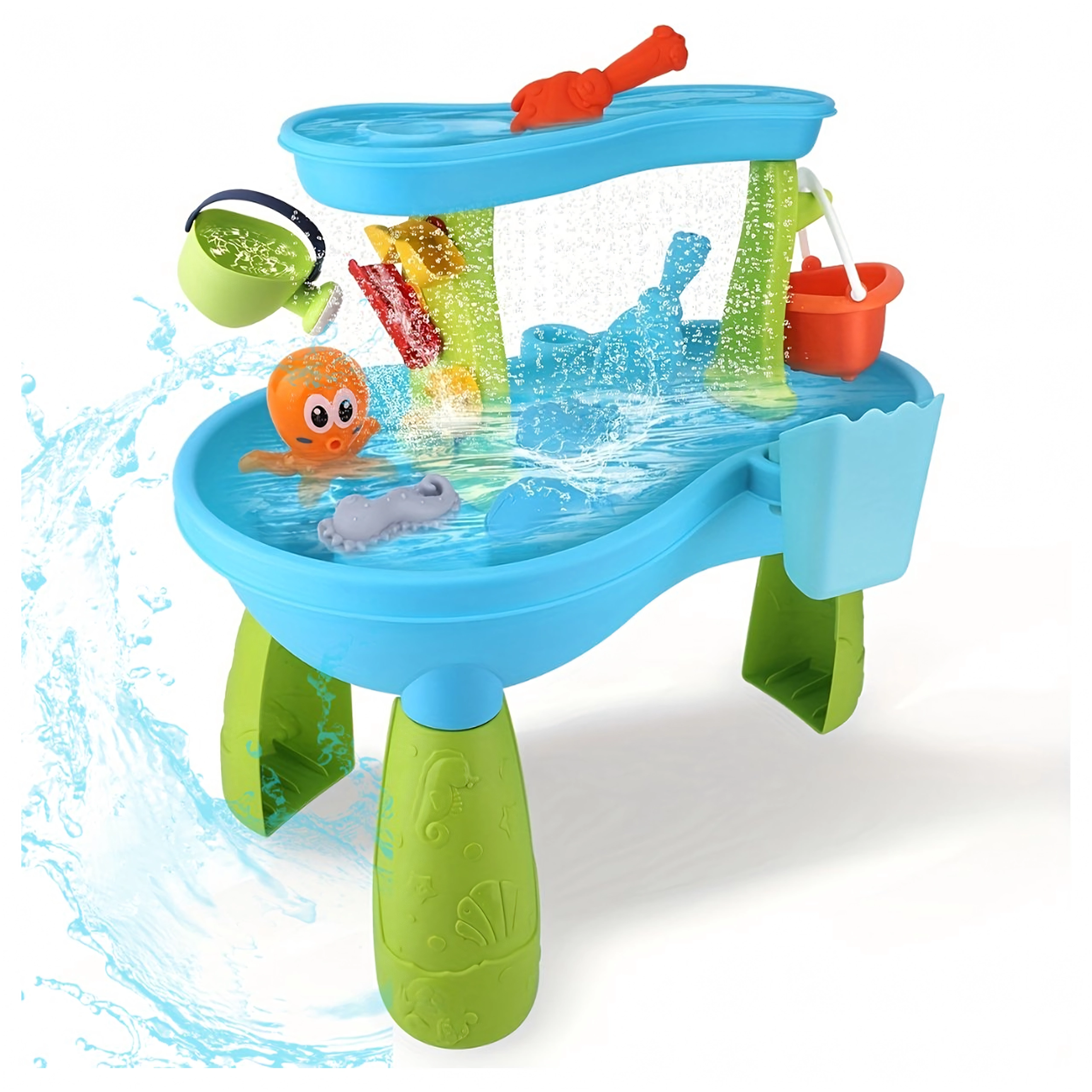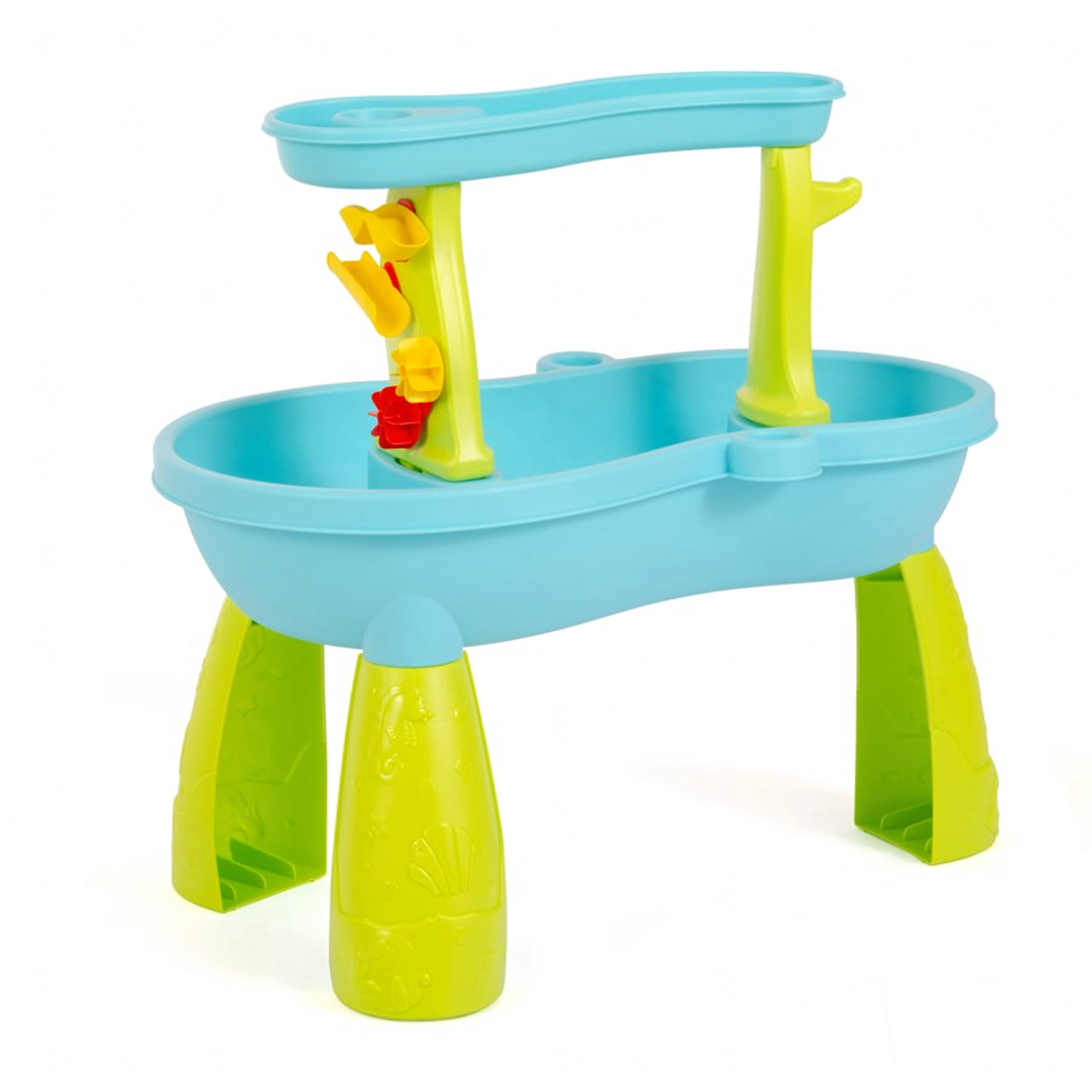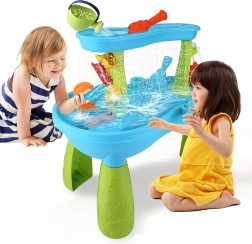 De leuke 2-in-1 water- en zandtafel biedt kinderen uren buitenspeelplezier. Bevat gekleurde accessoires, glijgootjes en waterradjes, zandvormpjes en -gereedschap en emmers en gietertjes. Stimuleert zintuiglijke waarneming, fijne motoriek en creatief spel met water en zand – ideaal voor tuin, terras en strand.