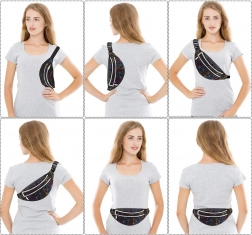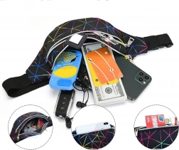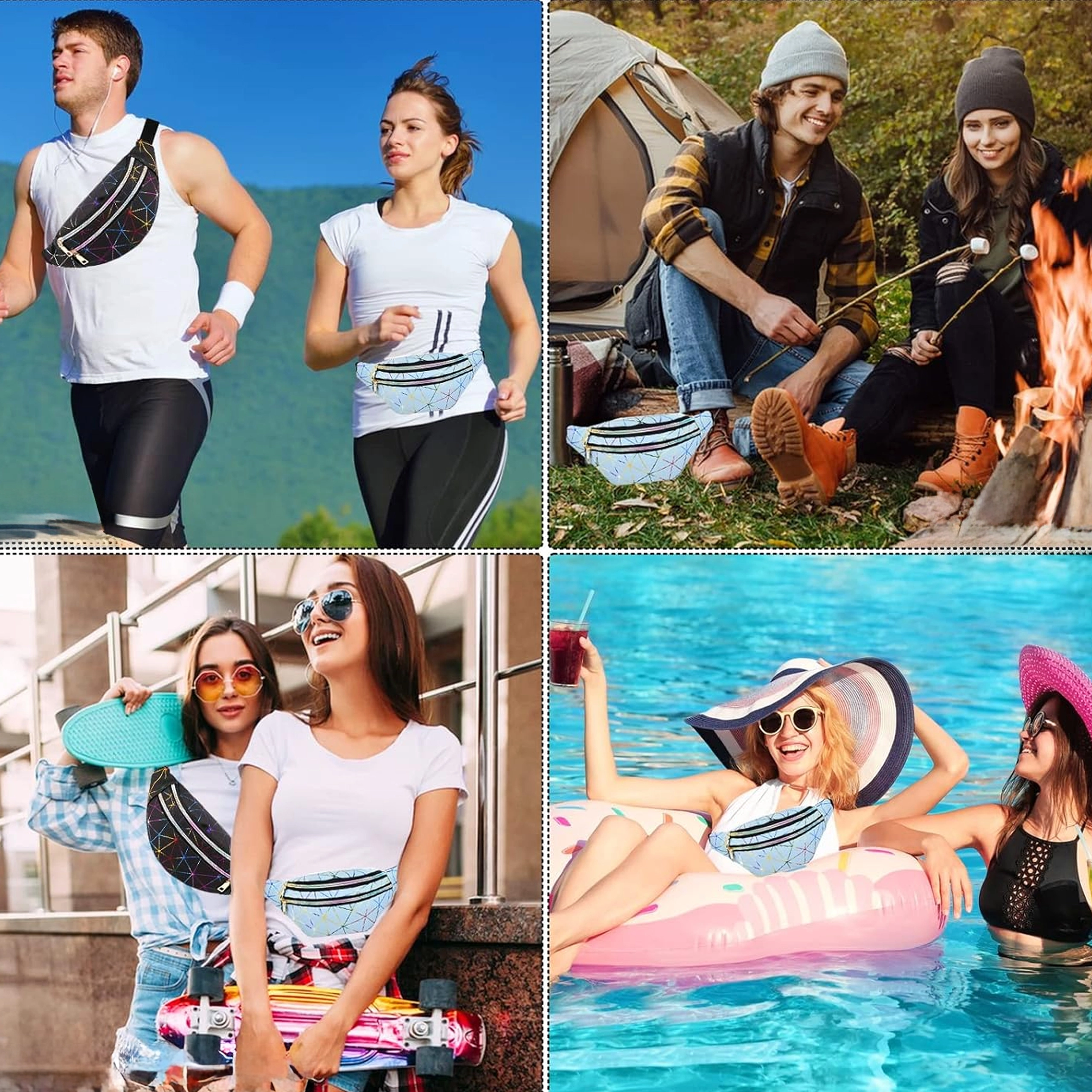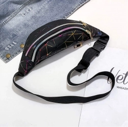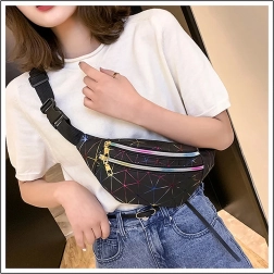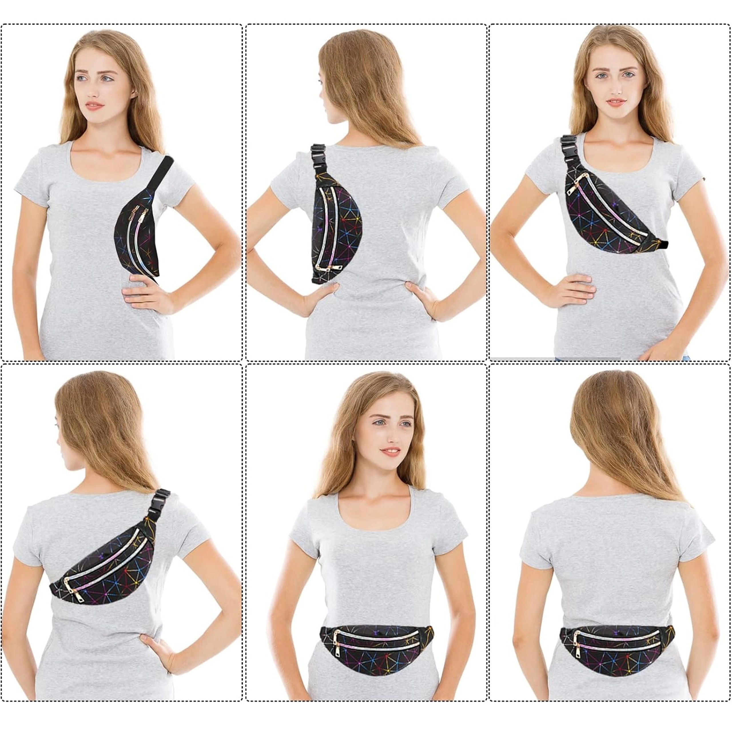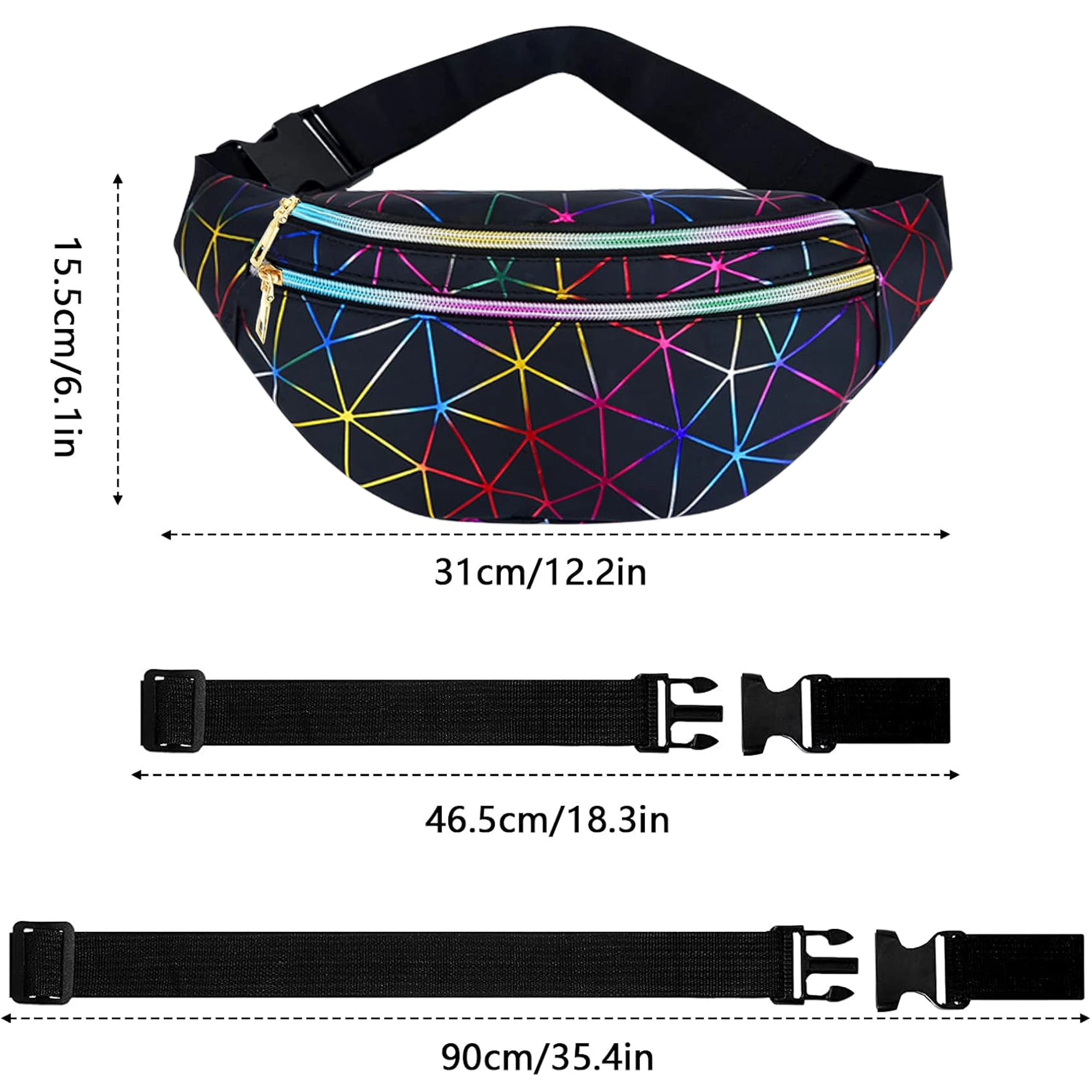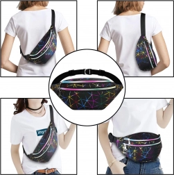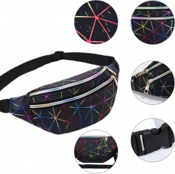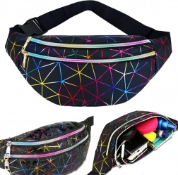 Stijlvolle unisex heuptas die functionaliteit en modern design combineert. Biedt 3 vakken met rits voor overzichtelijke opslag van telefoon, portemonnee en sleutels, een verstelbare riem om in de taille of crossbody te dragen, en duurzaam materiaal met een holografisch geometrisch effect.