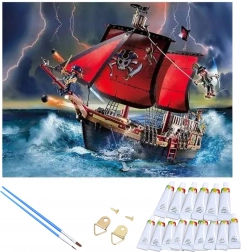 Ontdek ontspanning en creativiteit met de set schilderen op nummers in het formaat 40 × 50 cm met opgespannen doek op frame. Dankzij de voorgedrukte genummerde vakjes, meegeleverde acrylverf en penseelset maak je eenvoudig een indrukwekkend motief van een piratenschip dat je na voltooiing direct aan de muur kunt hangen.