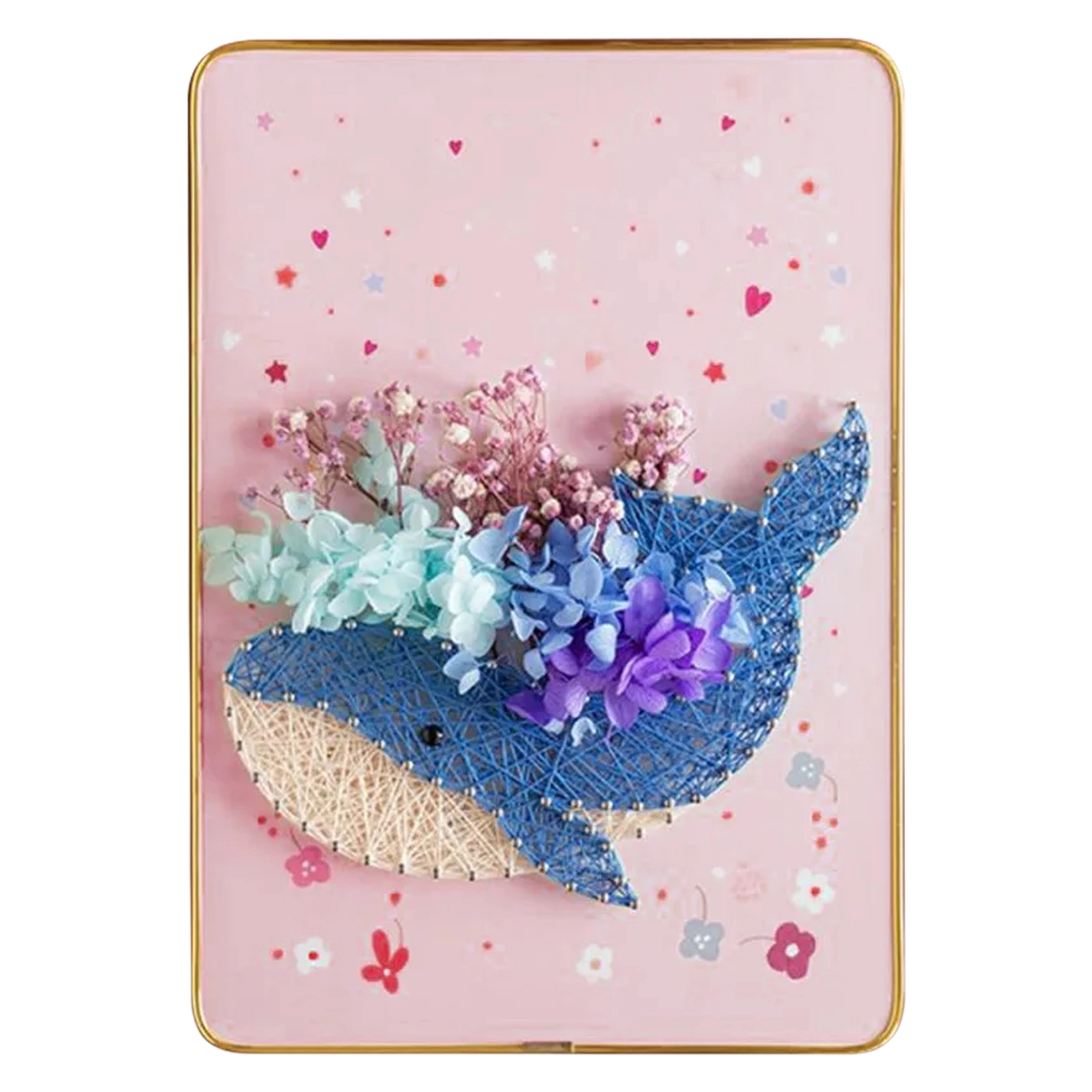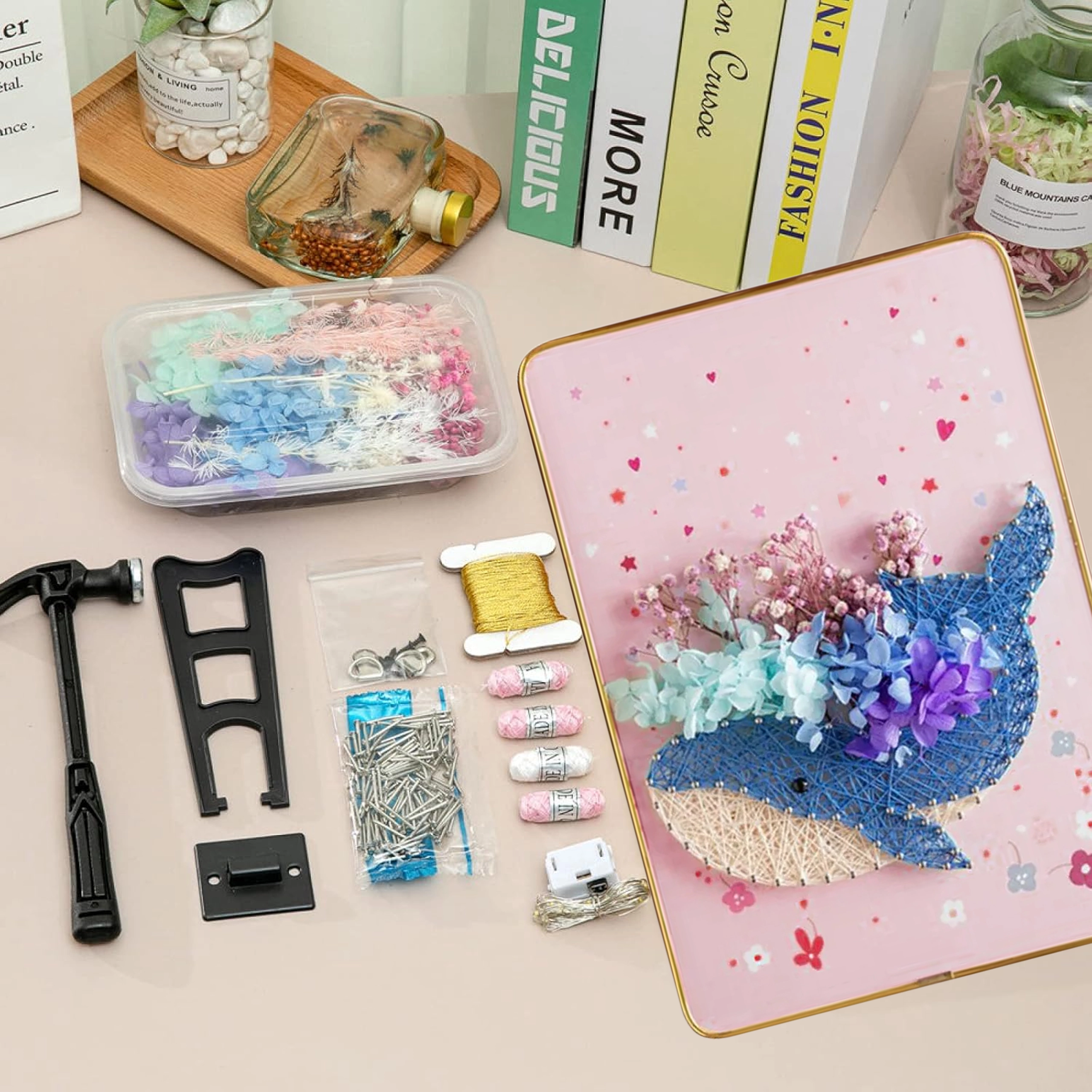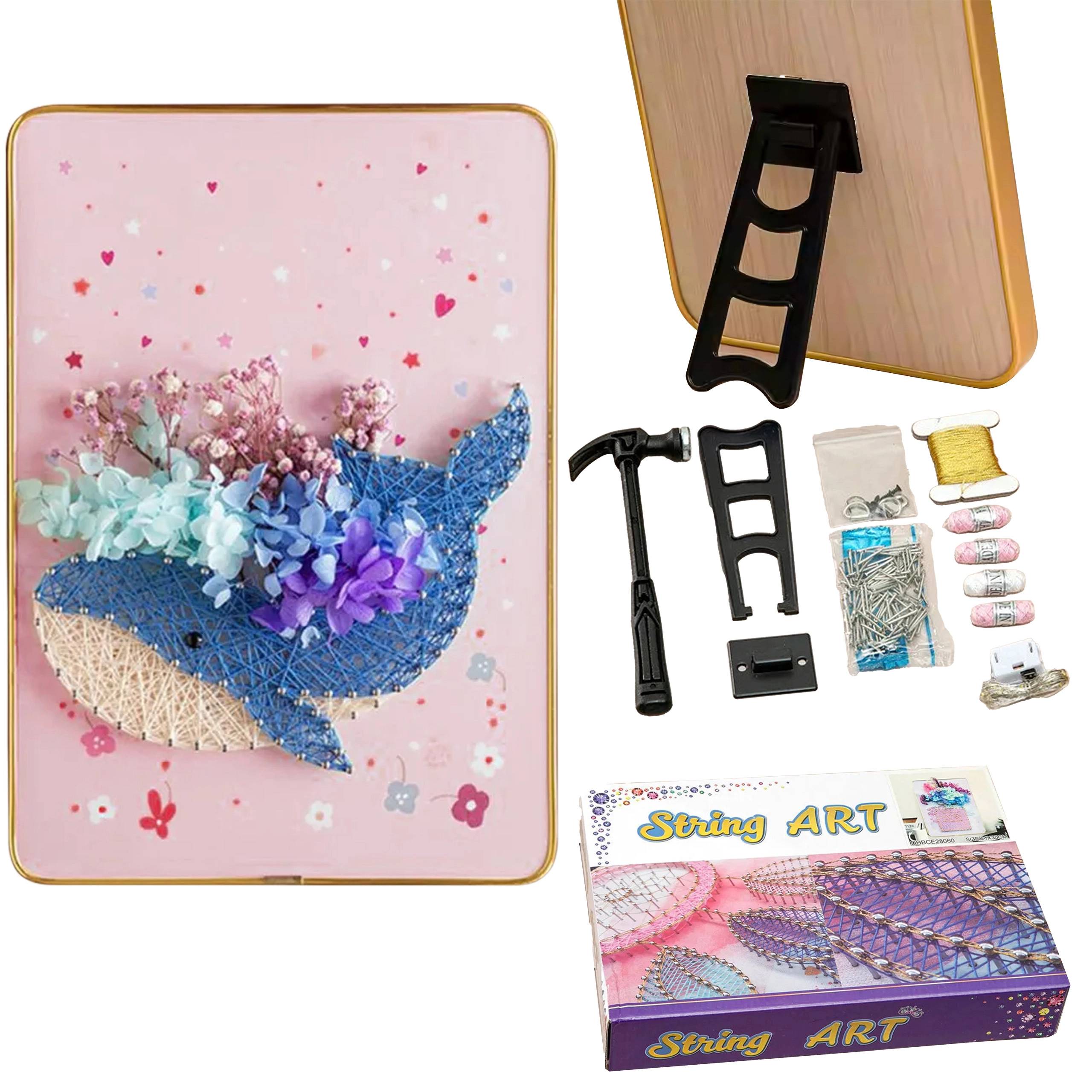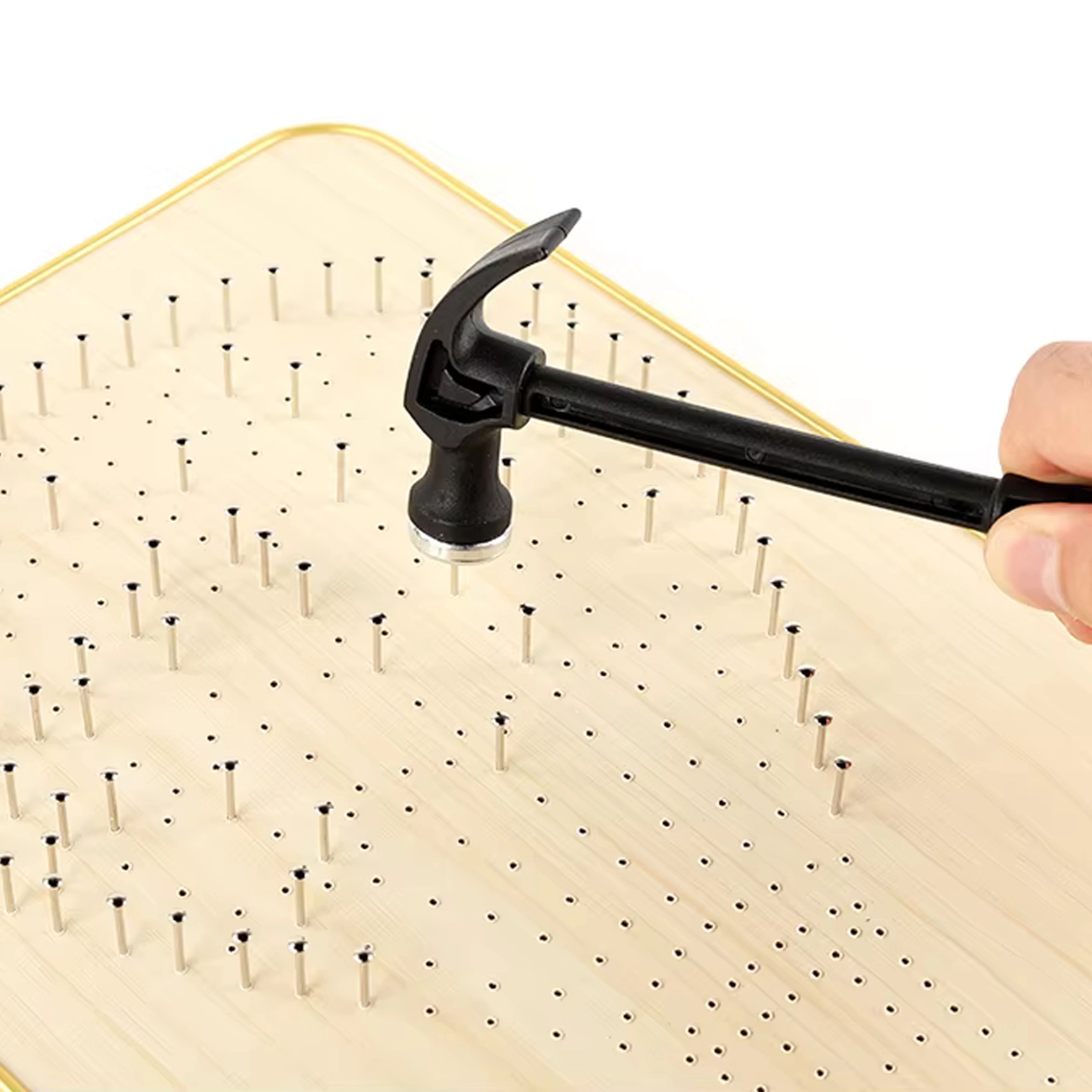 De complete doe-het-zelfset bevat een ondergrond in frame, spijkertjes, draden en klein gereedschap. Begin meteen na het uitpakken – zonder extra materialen te hoeven zoeken.
