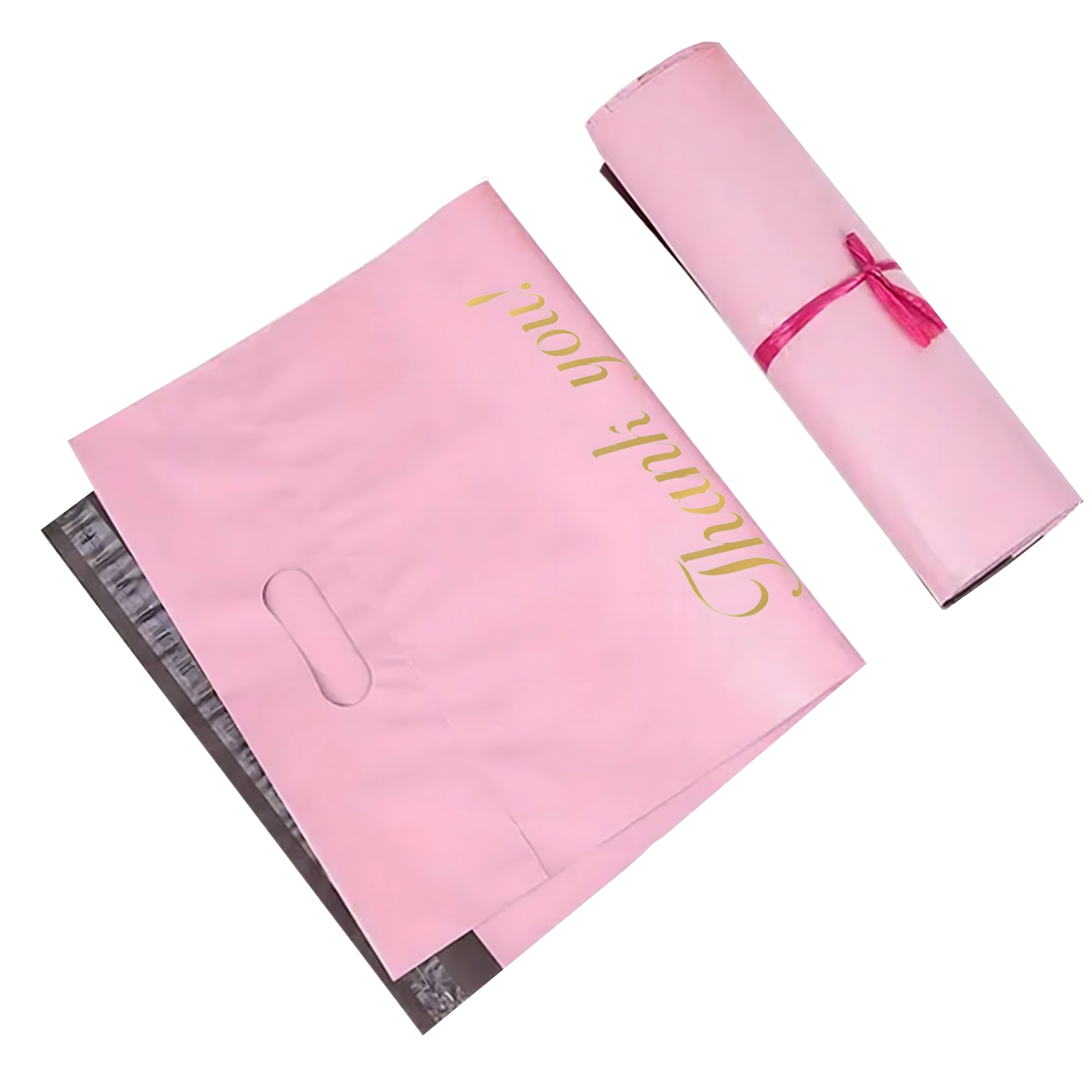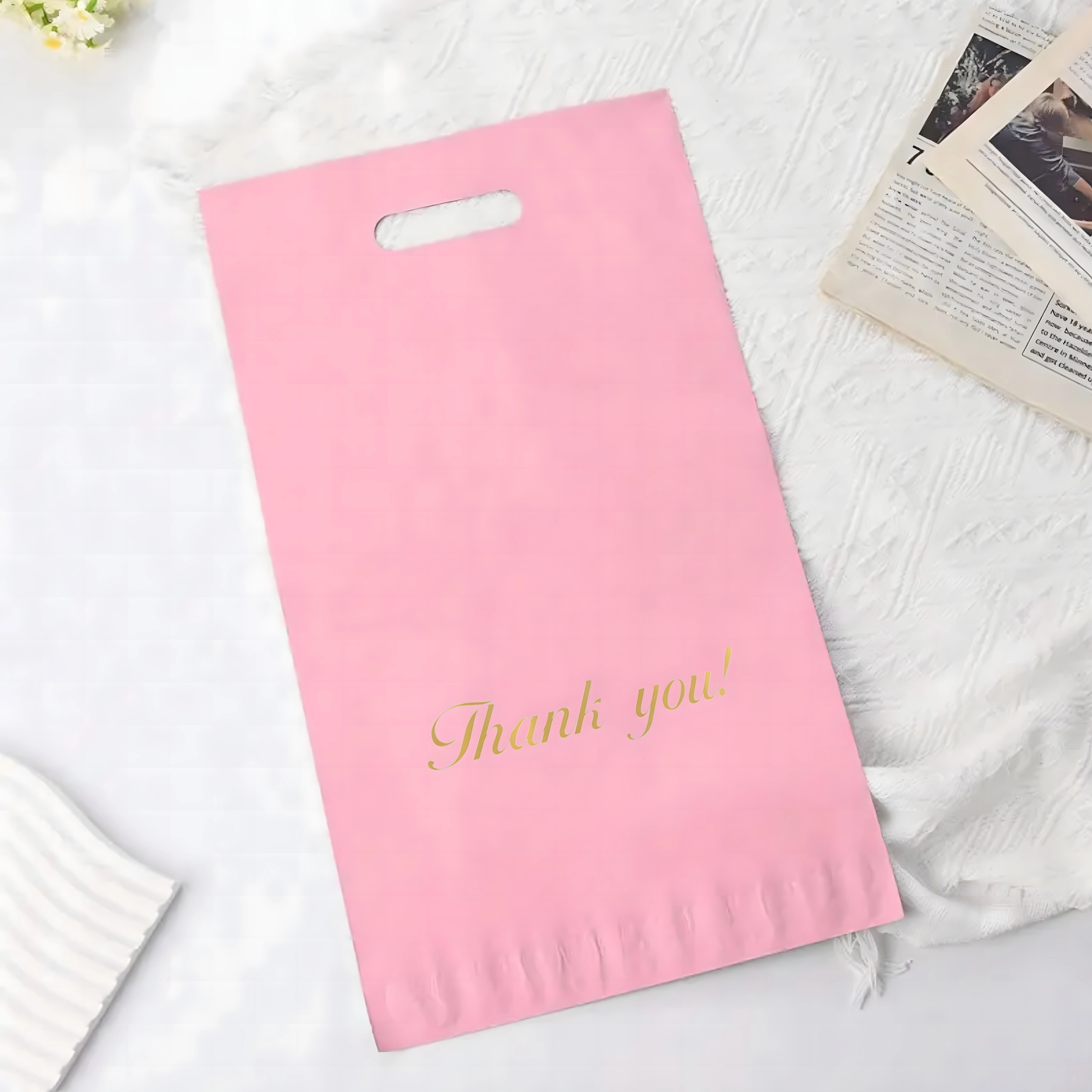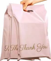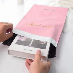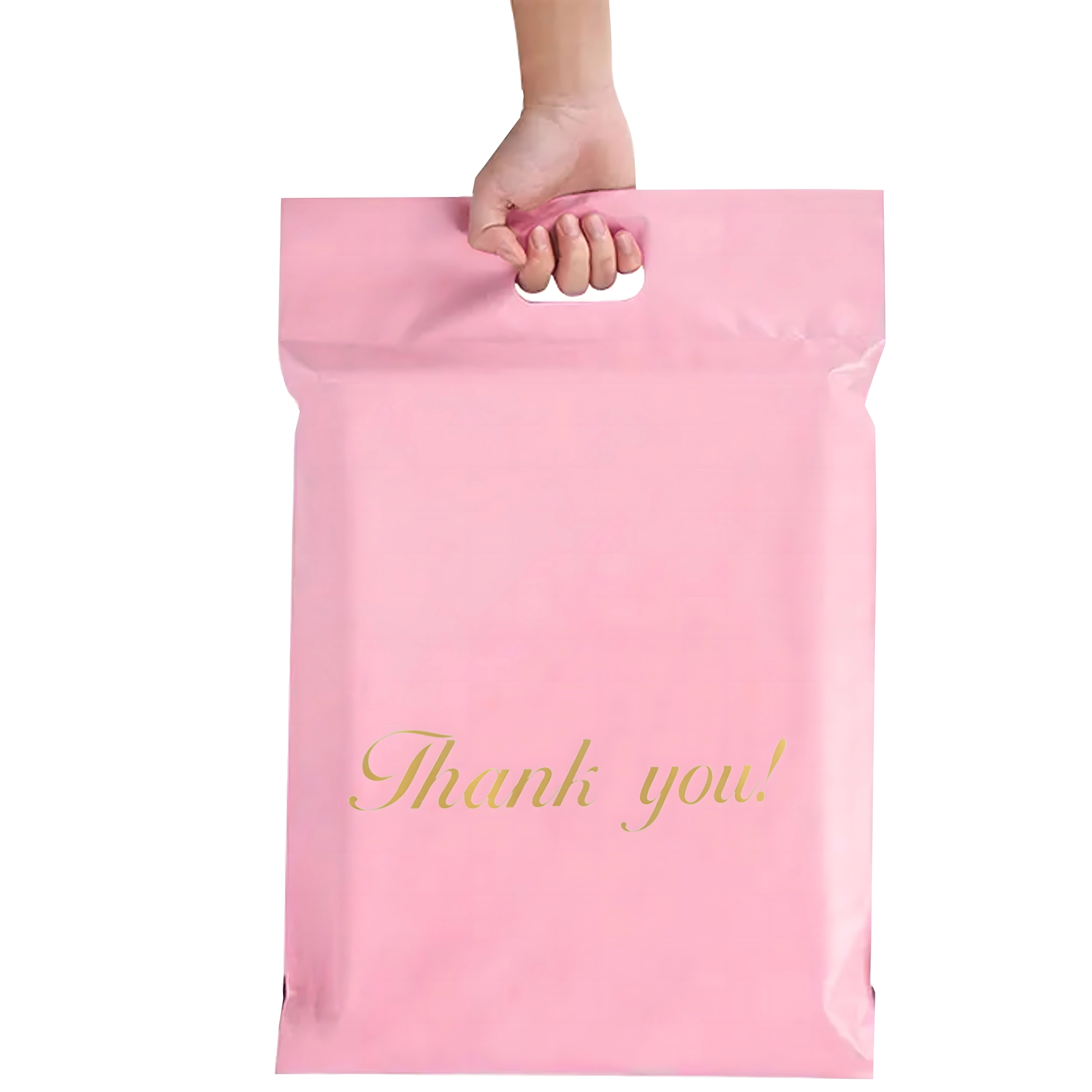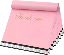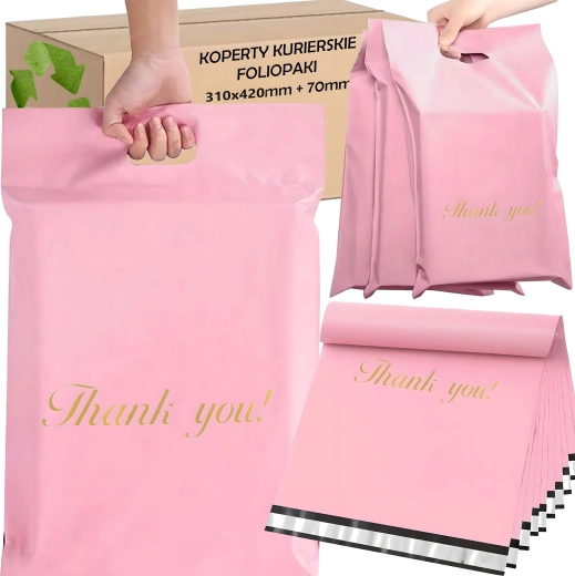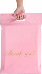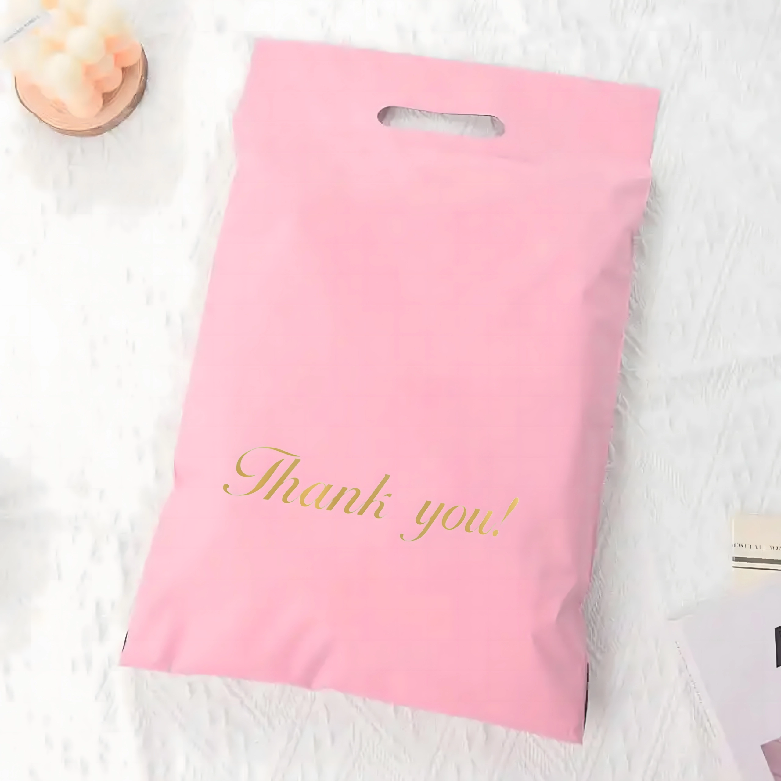 Praktische roze polyzakken met gestanste handgreep voor makkelijk dragen zorgen voor veilige, waterdichte en snelle verpakking van zendingen. Zelfklevende strip voor betrouwbare sluiting, scheurweerstand en een elegante tekst “Thank you!” voor een stijlvolle presentatie van het pakket.