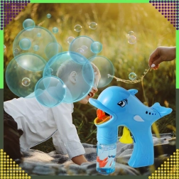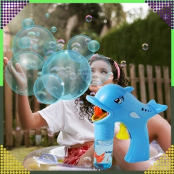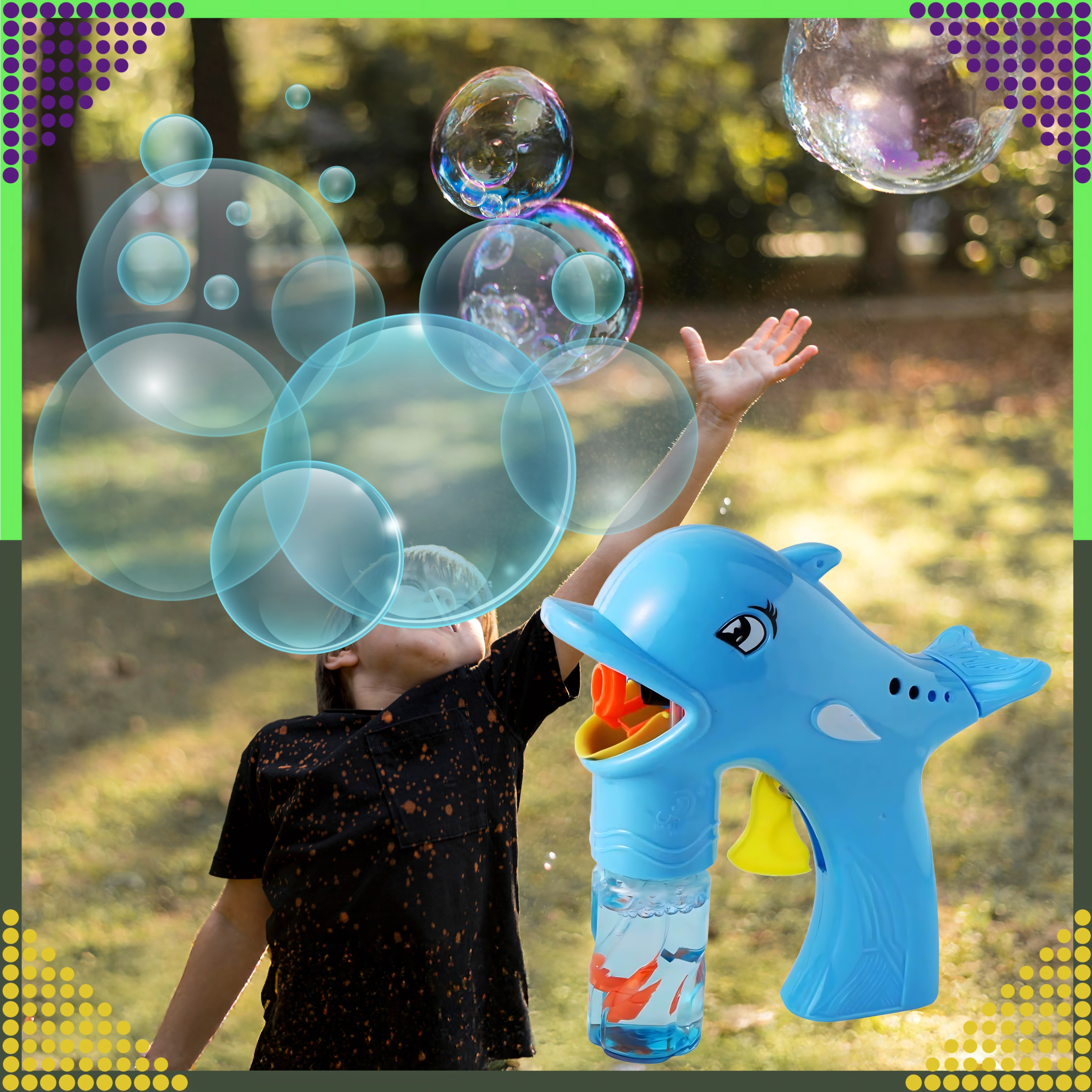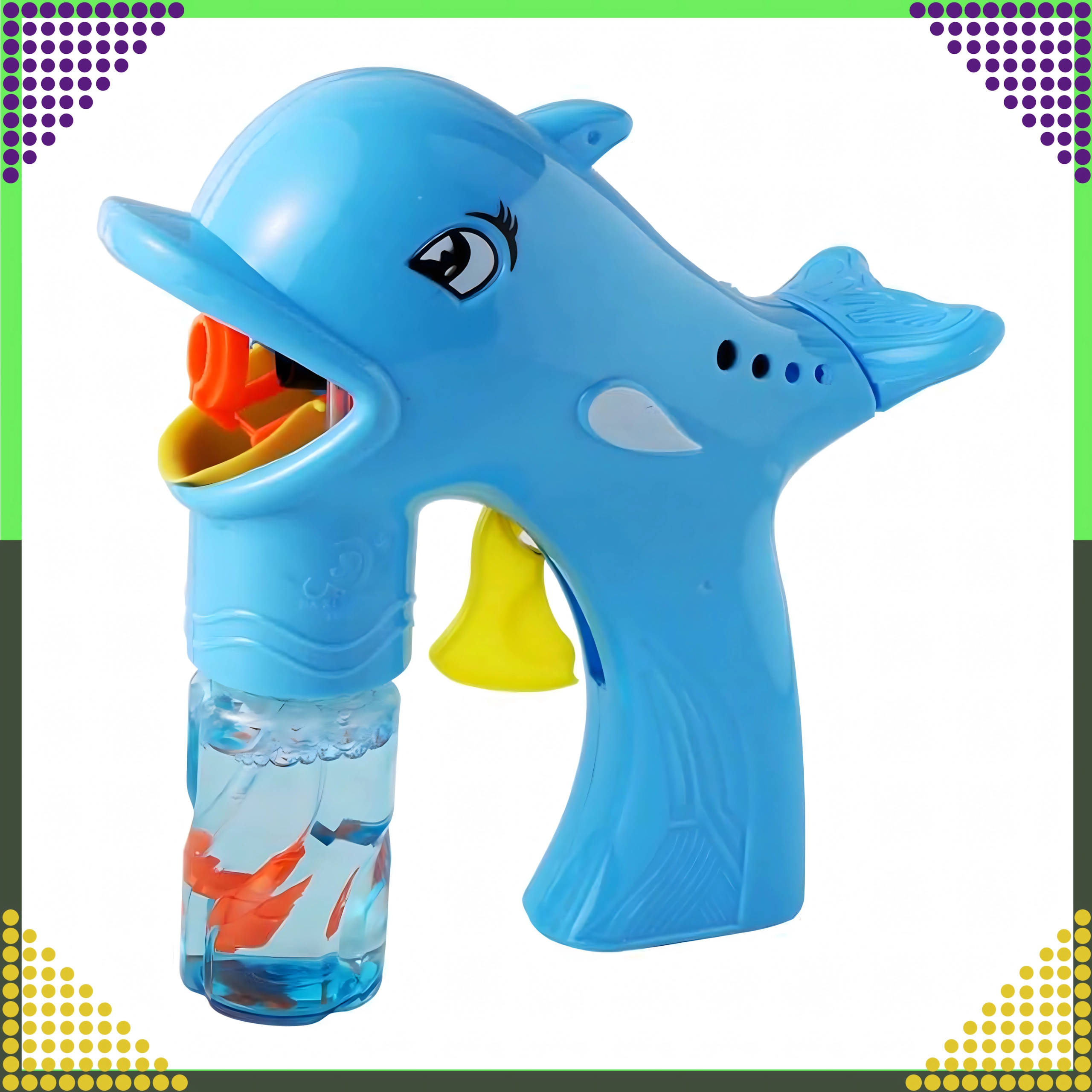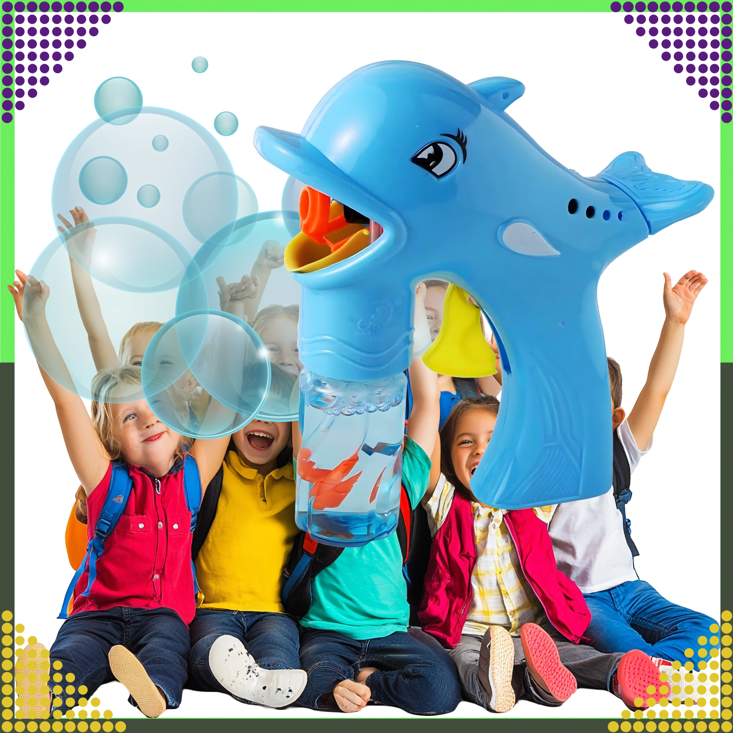 Maak elke middag van kinderen vrolijk met bellenpret! Het bellenblaaspistool in dolfijnvorm spuwt na het bevestigen van het flesje met oplossing tientallen tot honderden bellen in slechts enkele seconden. Gewoon de vulling indraaien, op de trekker drukken en genieten van een regenboogshow in de buitenlucht of binnen.