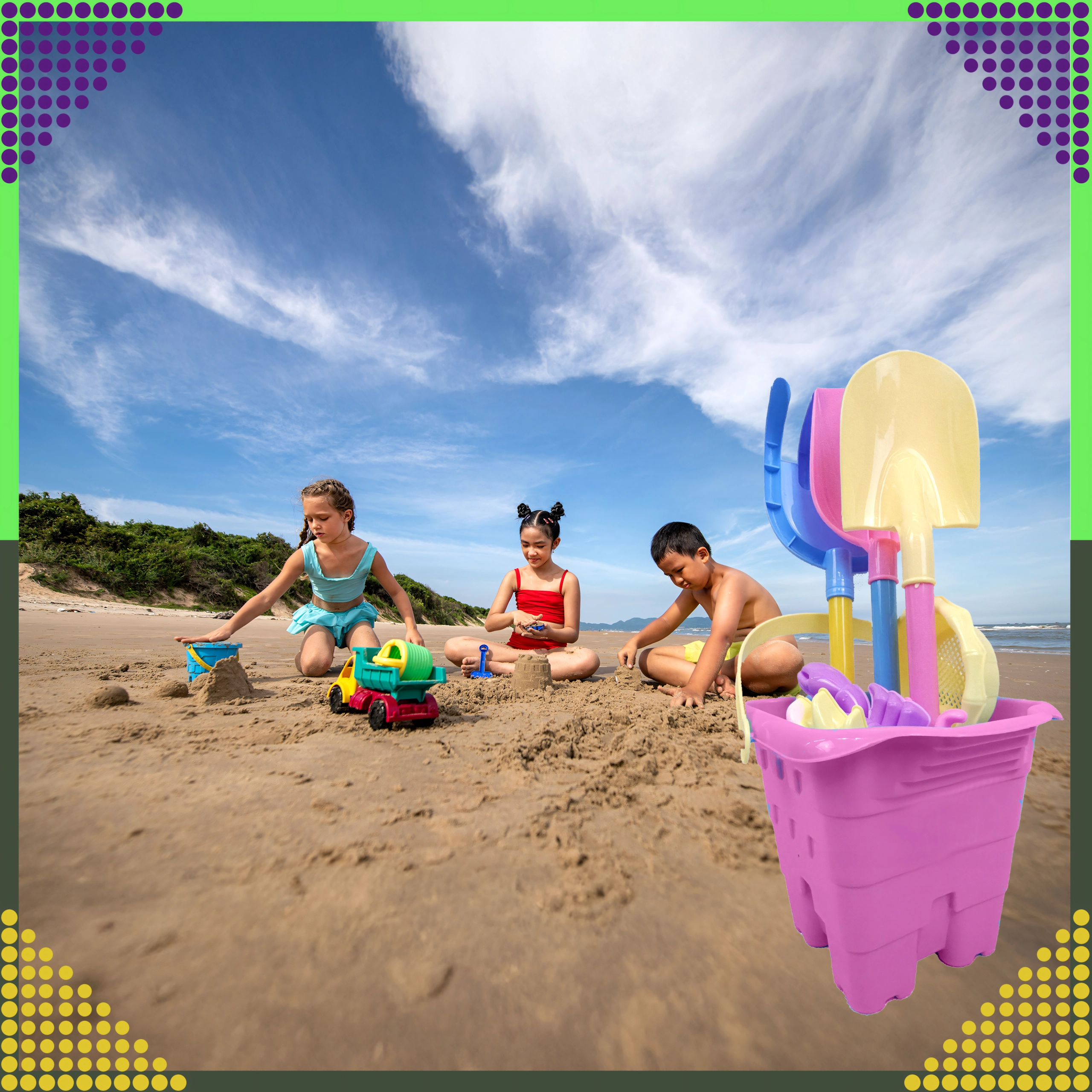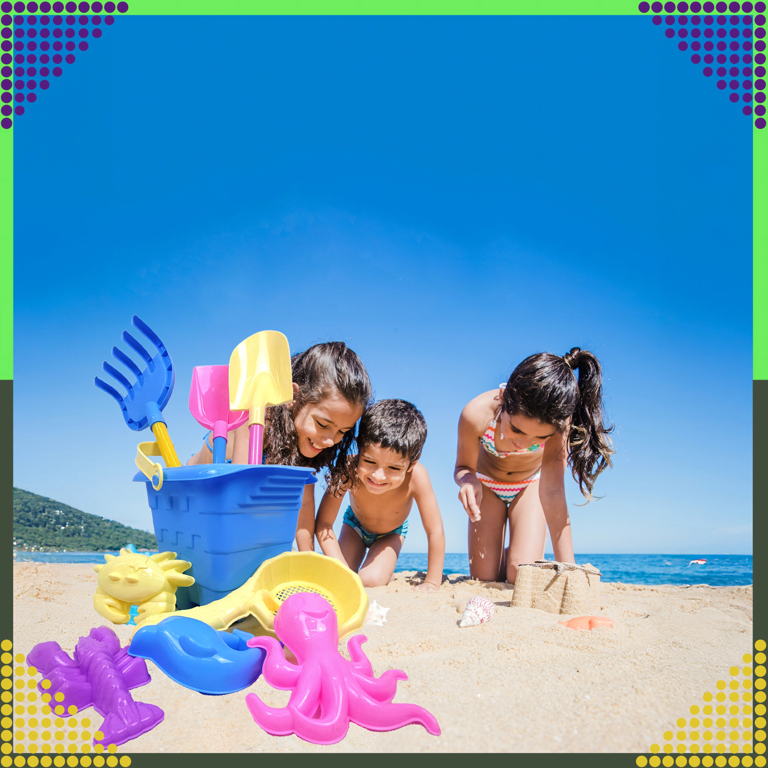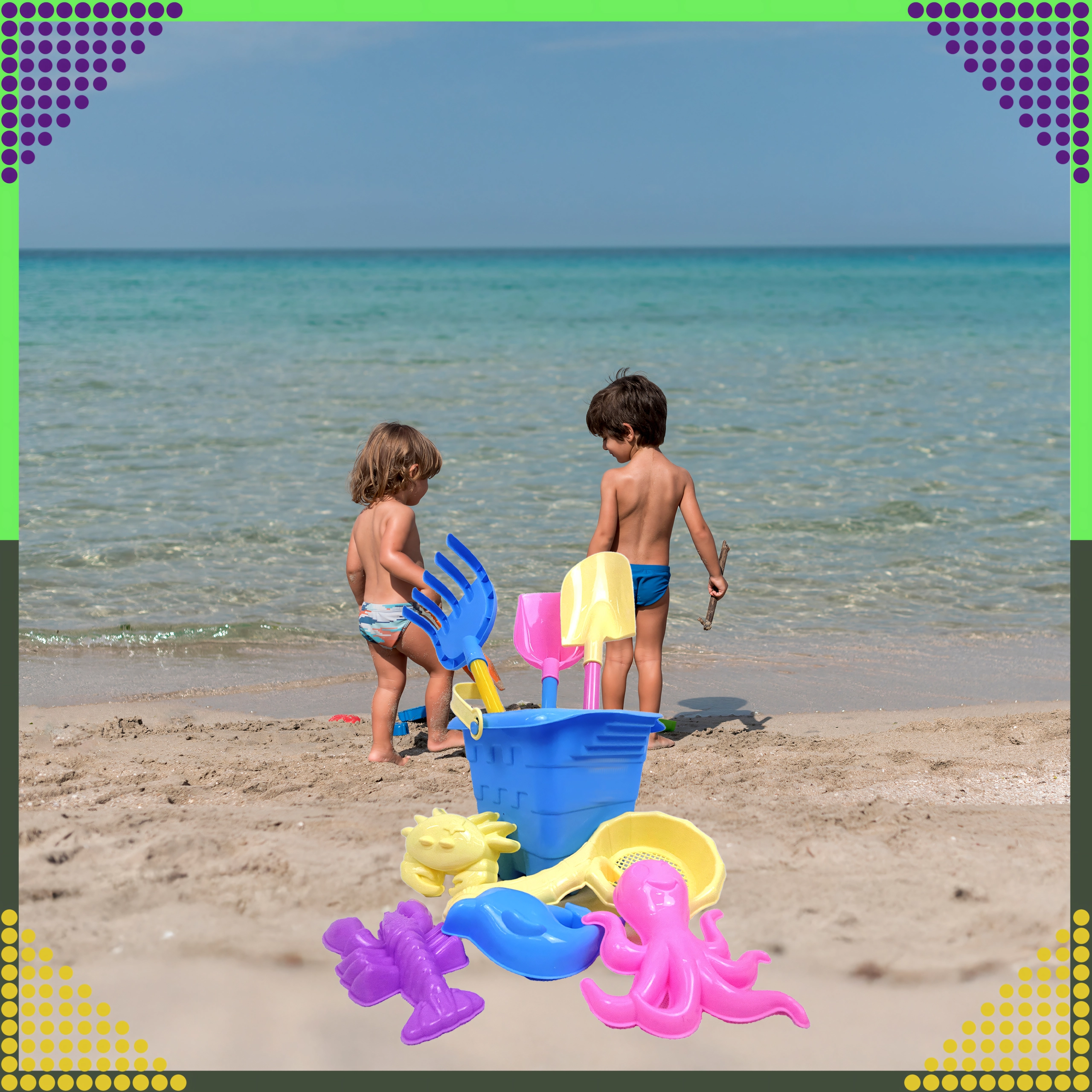Vrolijke set strandspeelgoed met emmer, vormpjes en schep zorgt voor creatief plezier voor kinderen op het strand, in de tuin en in de zandbak. Stimuleert de fantasie en zintuiglijke ontwikkeling, biedt 9 praktische onderdelen in levendige kleuren en is eenvoudig te reinigen voor dagelijks gebruik.