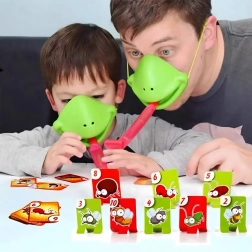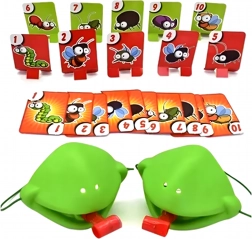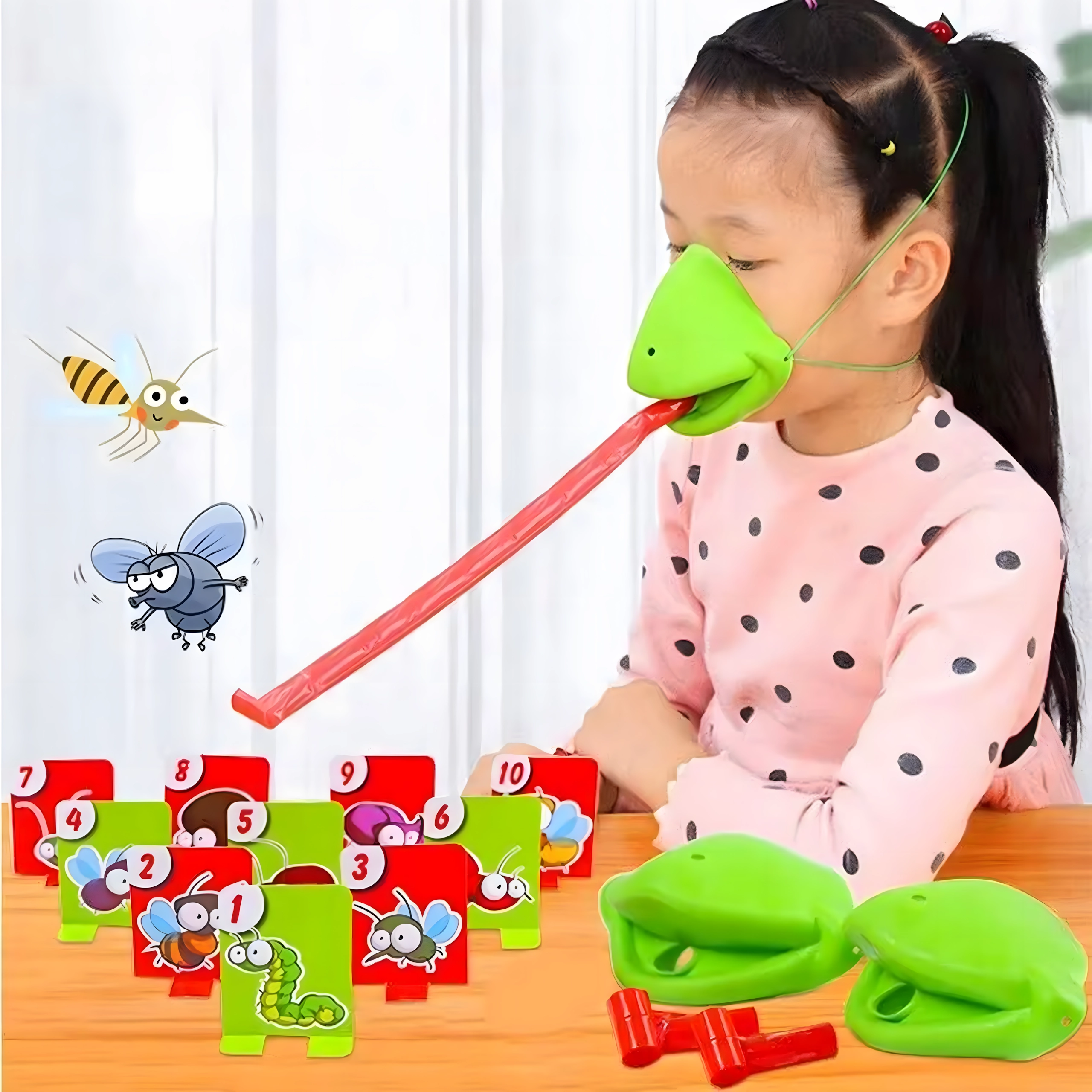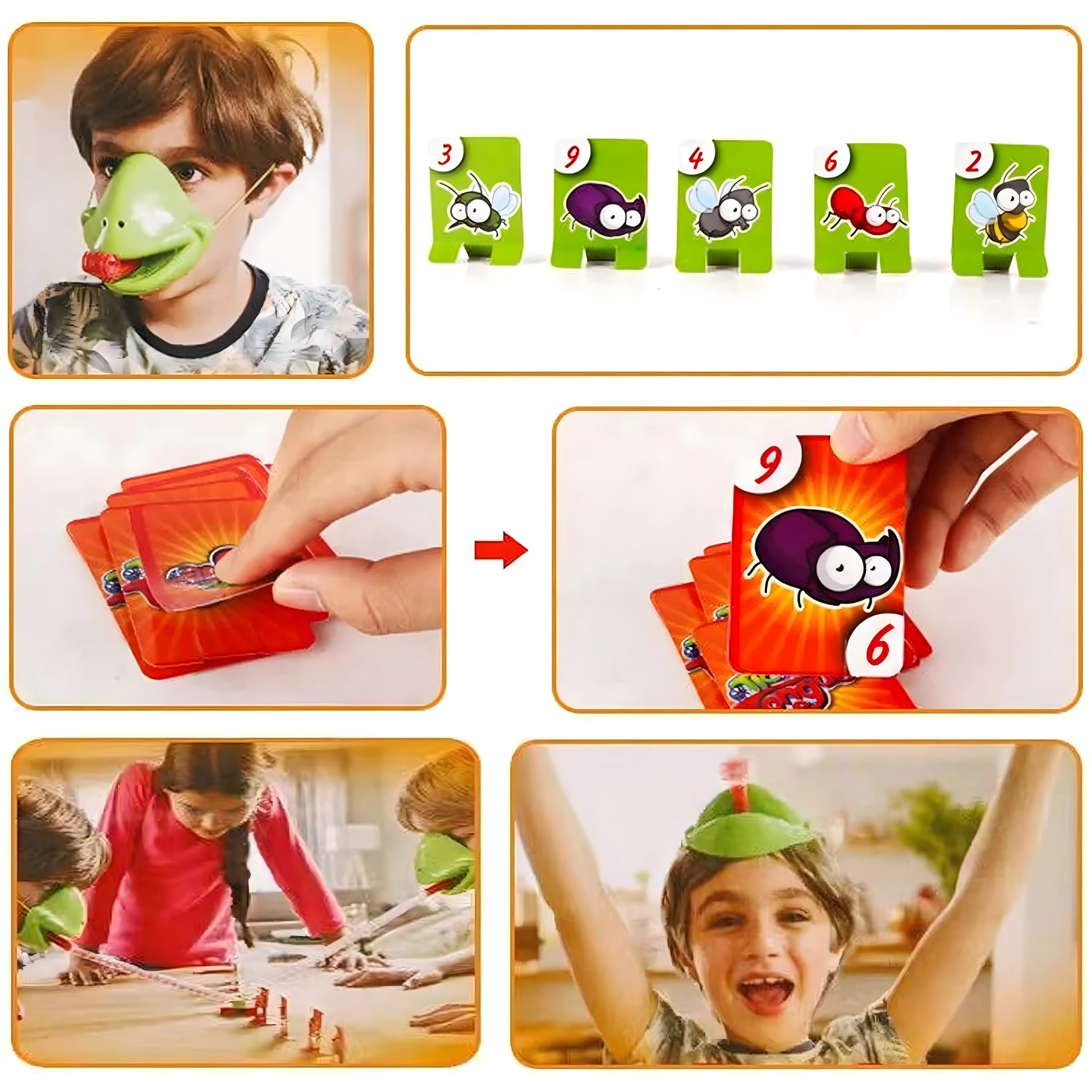 Verander in een kikker en ga op insectenjacht! Zet het masker op, mik en schiet met je tong op de doelkaarten – wie het juiste plaatje of nummer het snelst vangt, scoort punten. Het spel is makkelijk te begrijpen, in een oogwenk klaar om te spelen en enthousiastmakend voor jong en oud.