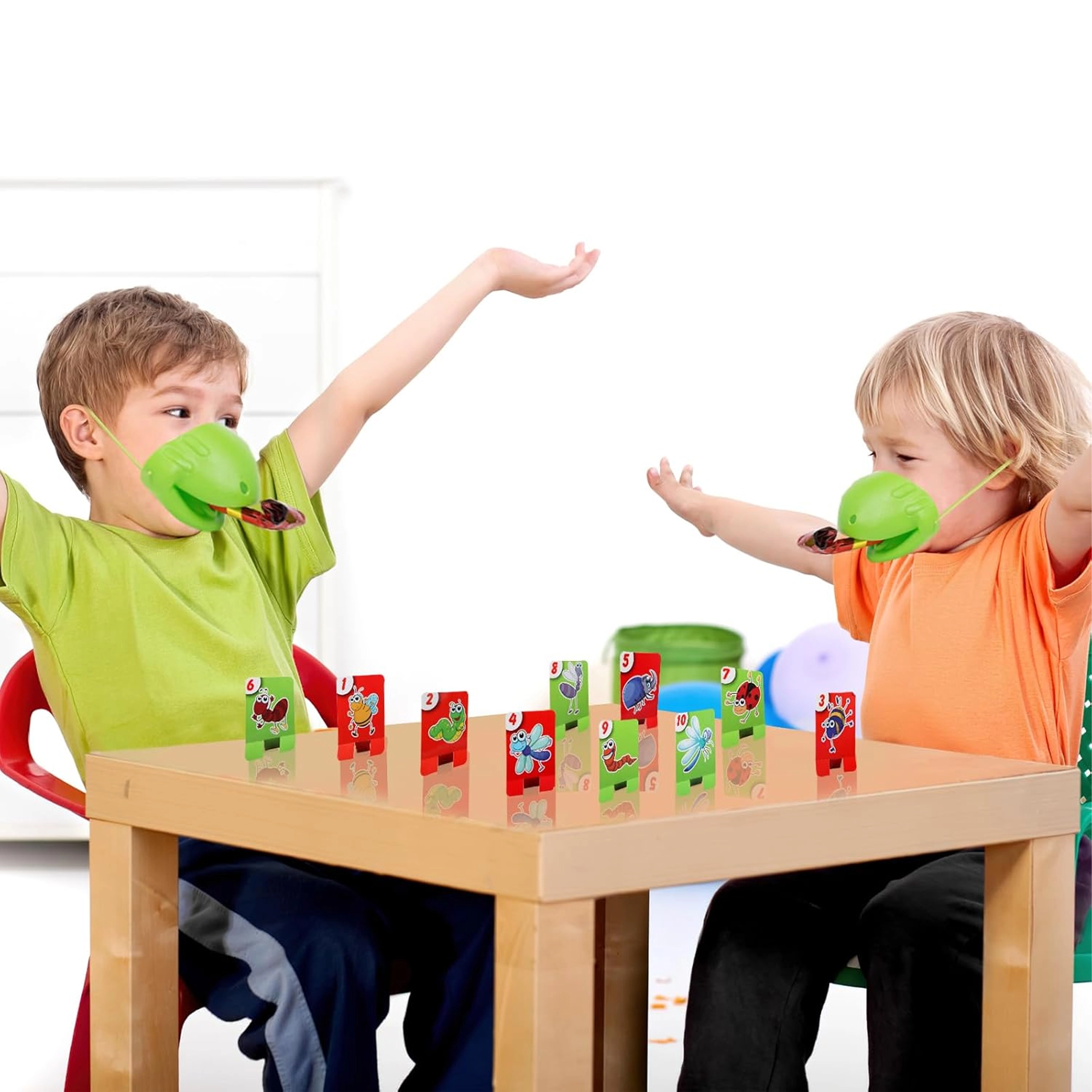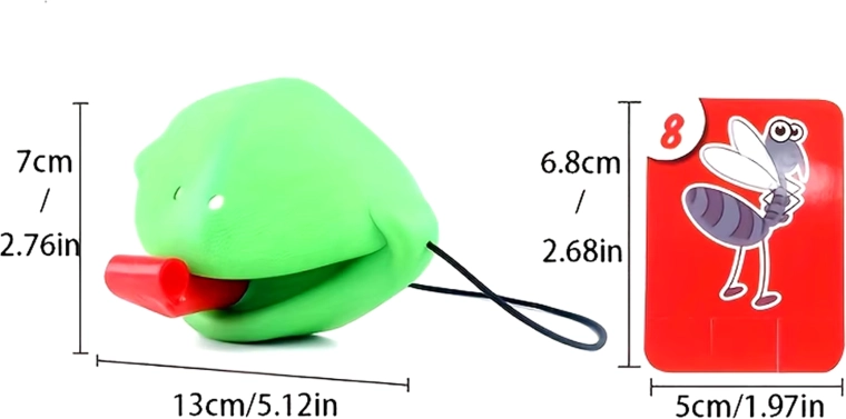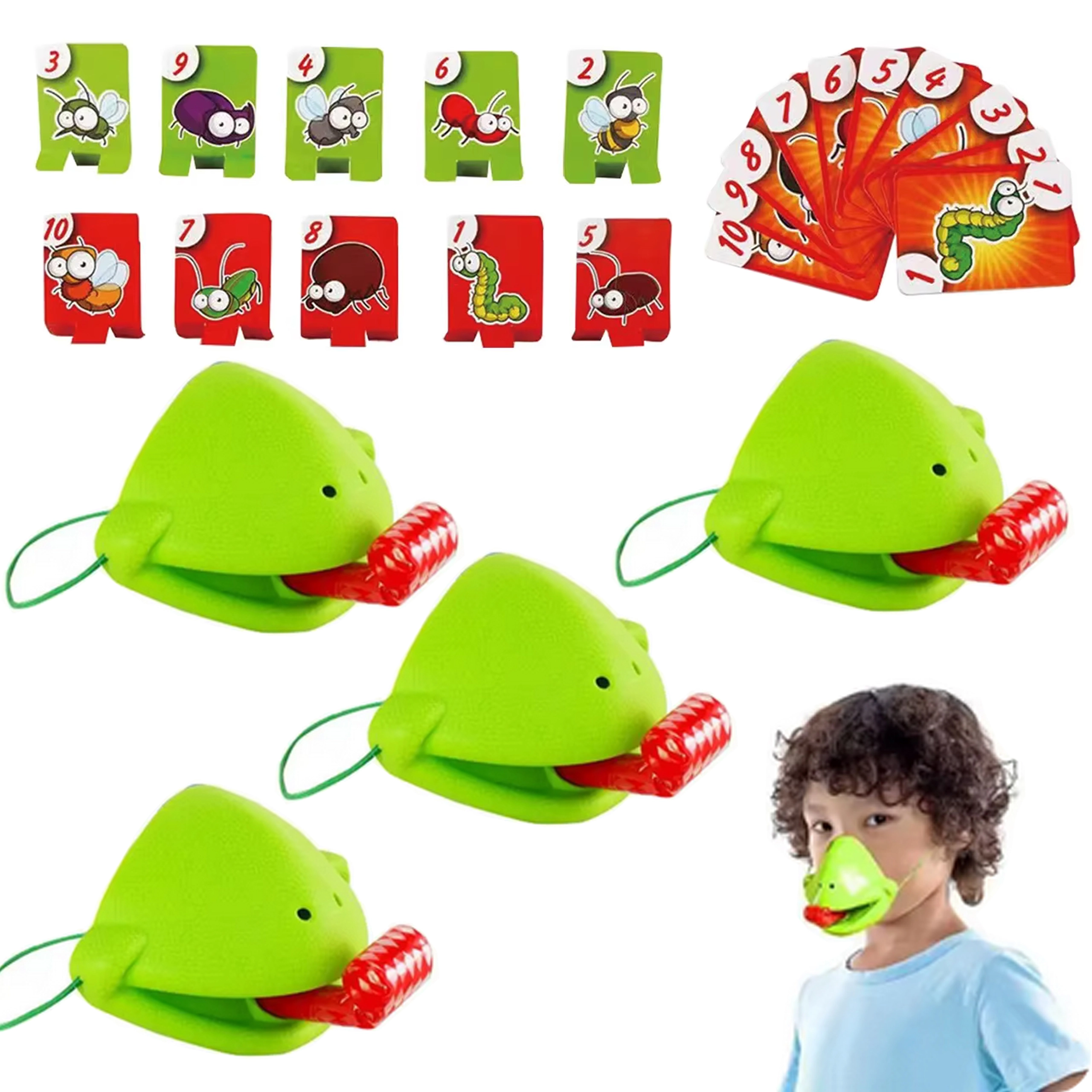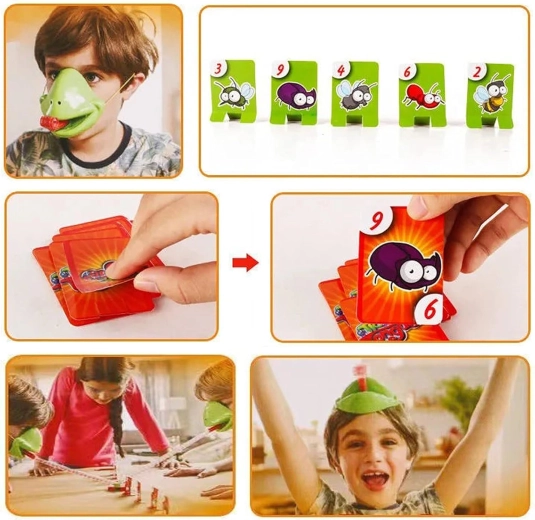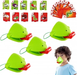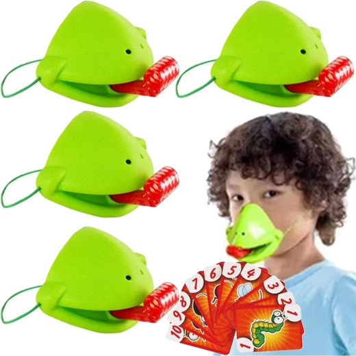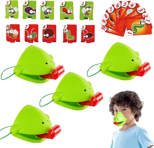 De set bevat alles voor 4 spelers: lichte kikkermaskers met elastische band en “tong”, plus kleurrijke kaartjes. Het spel stimuleert snelle reacties, oog-handcoördinatie en concentratie. Ideaal voor familieavonden, kinderfeestjes en vrije momenten thuis.