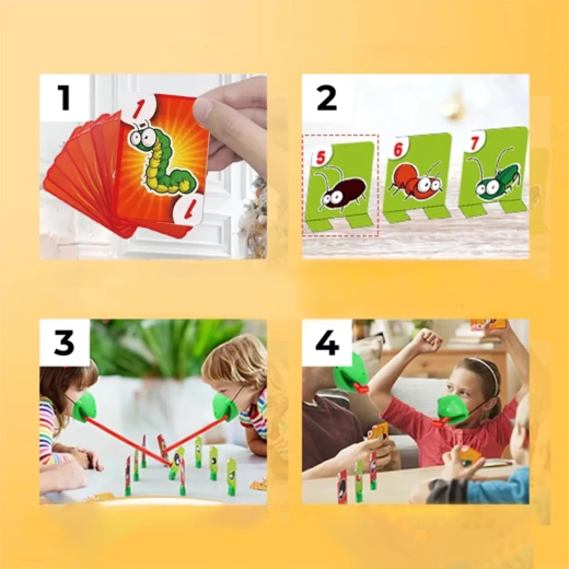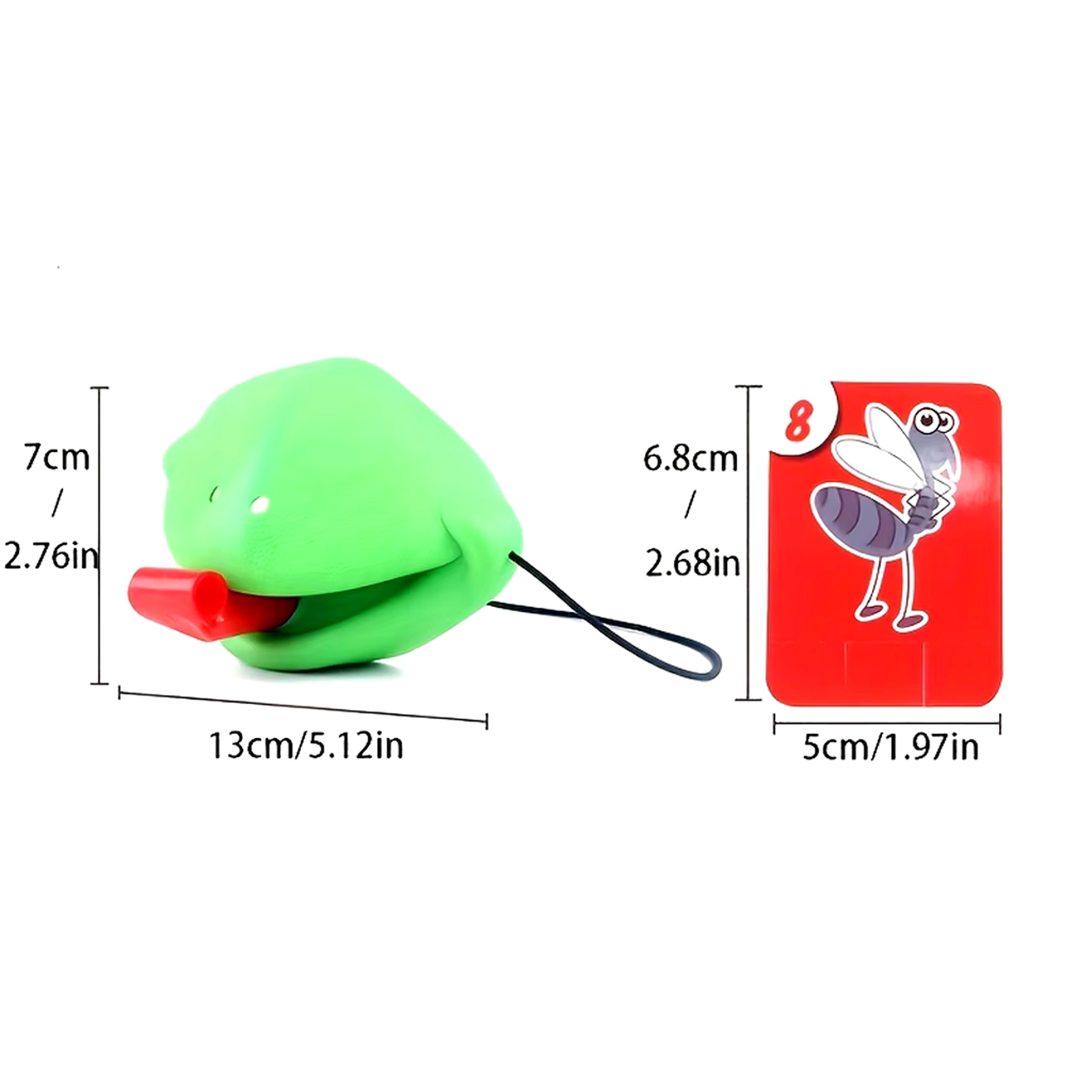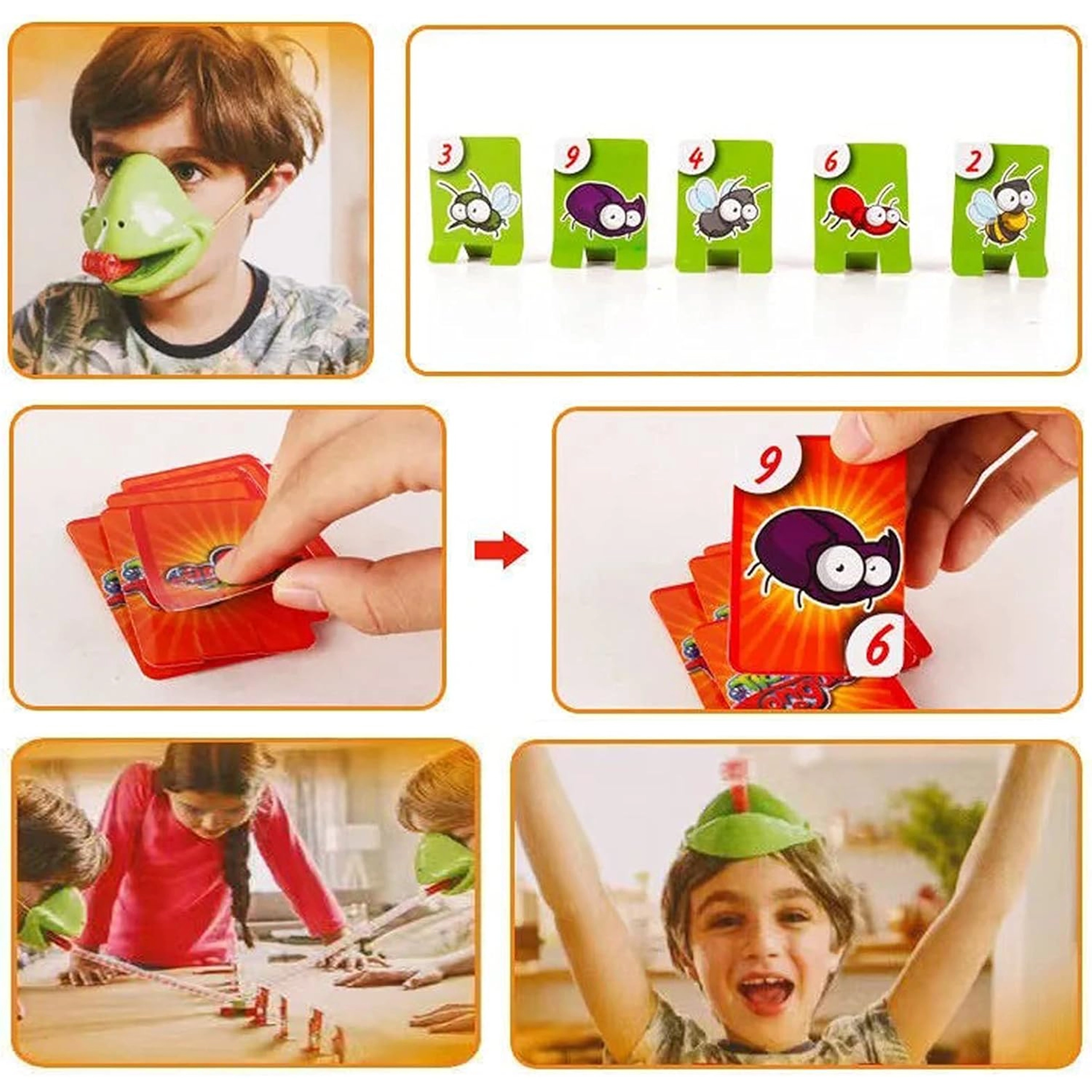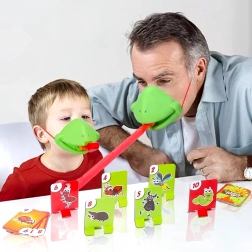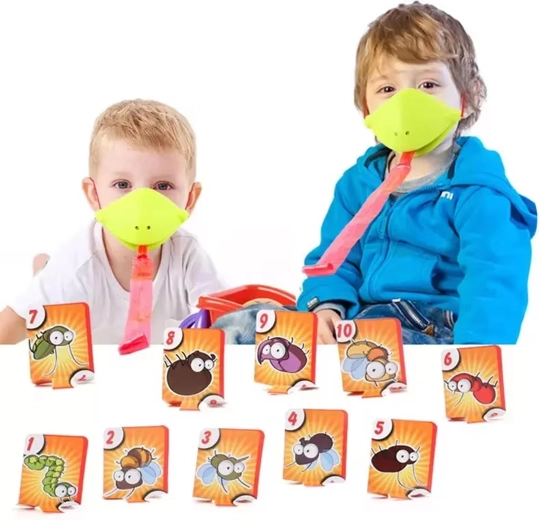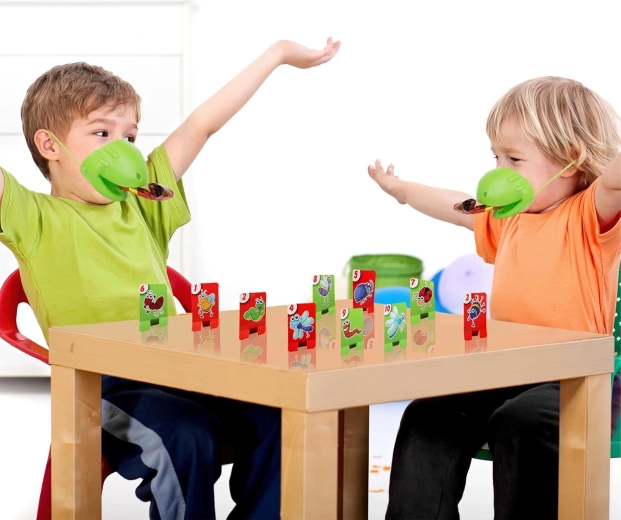 De set bevat alles voor 4 spelers: lichte kikkermaskers met elastische band en “tong”, plus kleurrijke kaartjes. Het spel stimuleert snelle reacties, oog-handcoördinatie en concentratie. Ideaal voor familieavonden, kinderfeestjes en vrije momenten thuis.