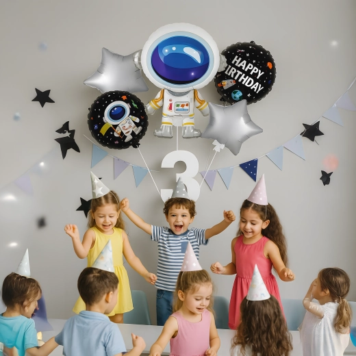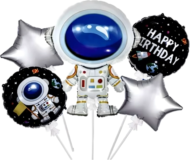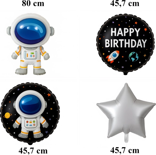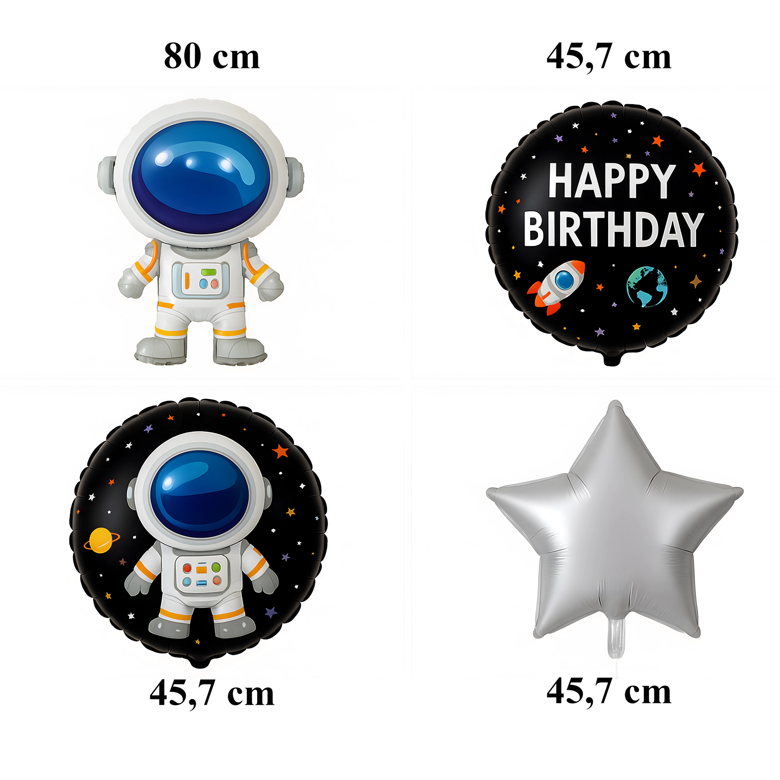 Stijlvolle set folieballonnen met een ruimtethema met een astronaut en sterretjes, ideaal voor verjaardagen, themafeesten en als decoratie voor de kinderkamer. Ook perfect voor een fotobooth en onvergetelijke feestjes.