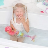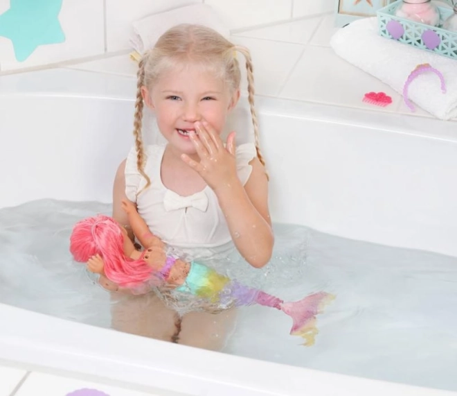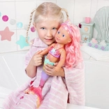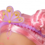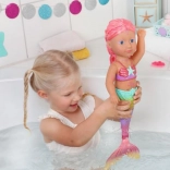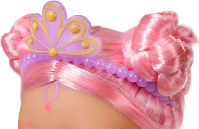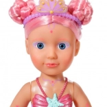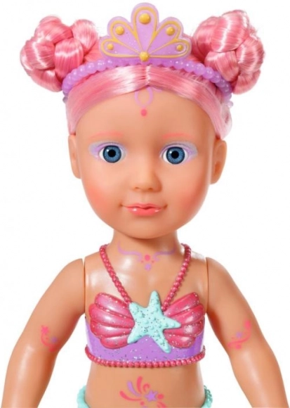 BABY born Kleine zeemeerminprinses is een onweerstaanbare pop met lange roze haren versierd met een paarse diadeem. De vin van de pop is prachtig kleurrijk, glinsterend en beweegt bij contact met water, wat een magische sfeer creëert. Ze draagt zwemkleding met een schelpmotief dat perfect past bij de staartvin.