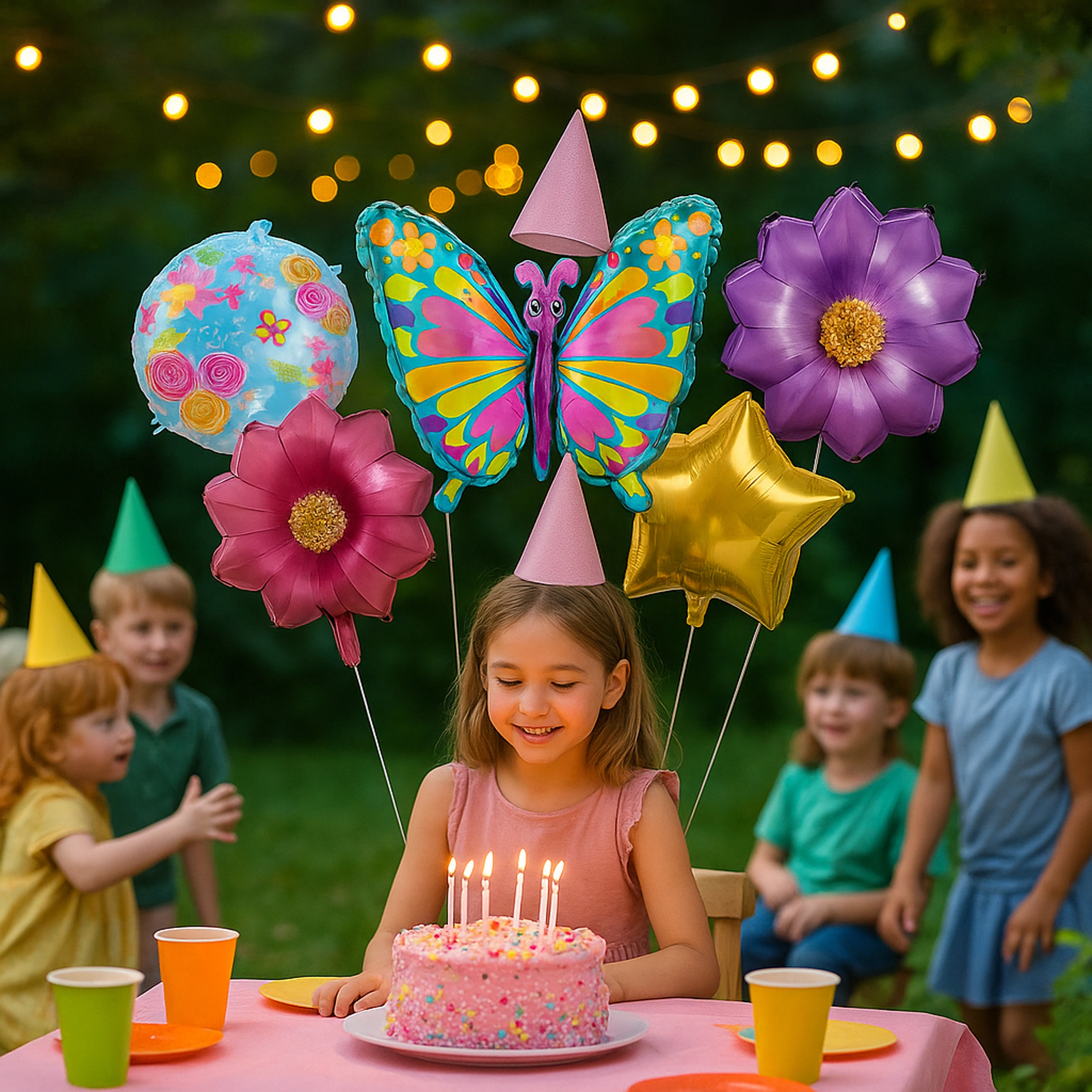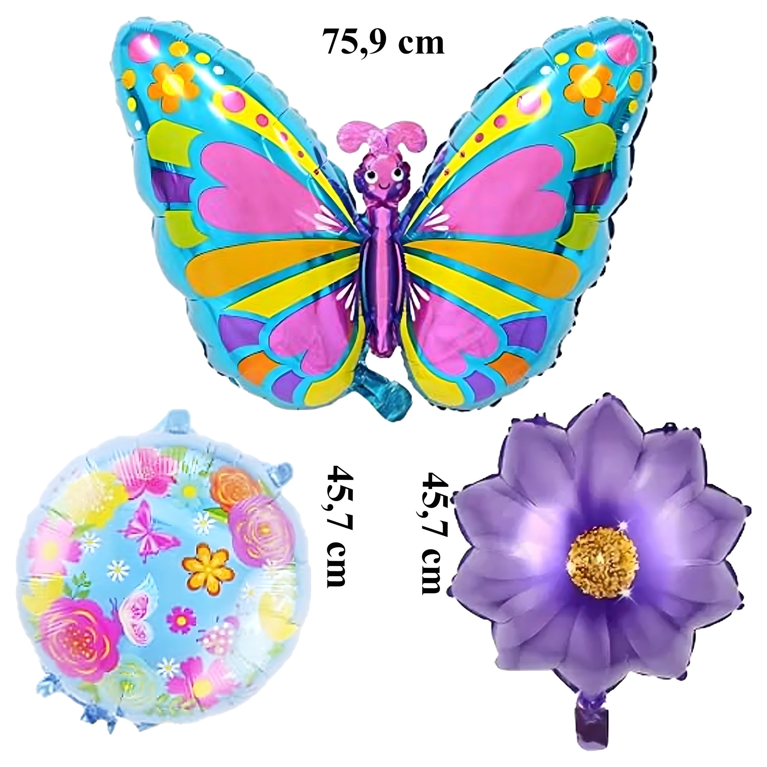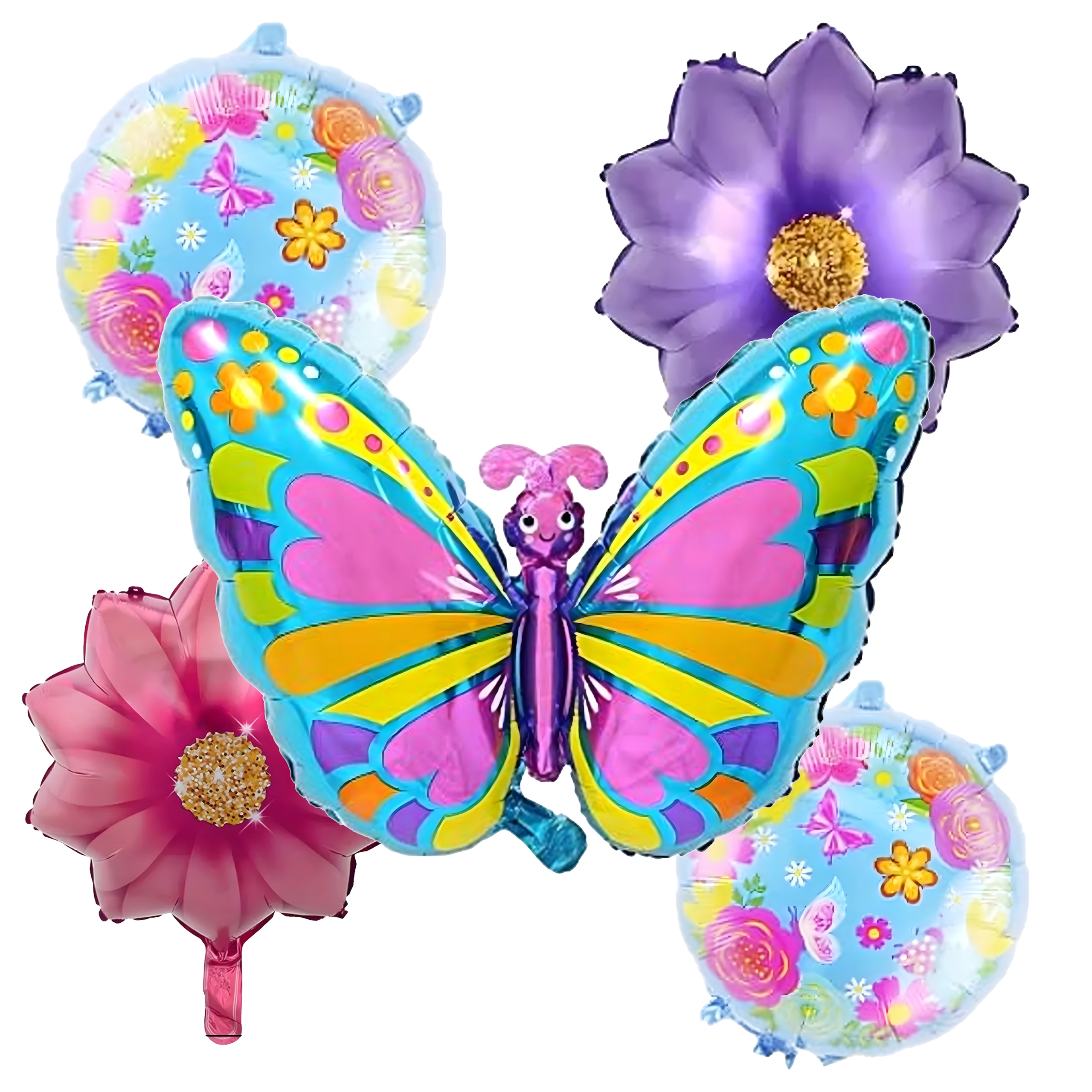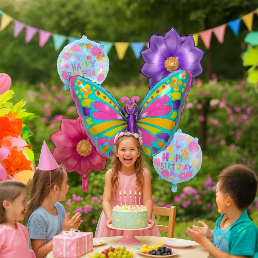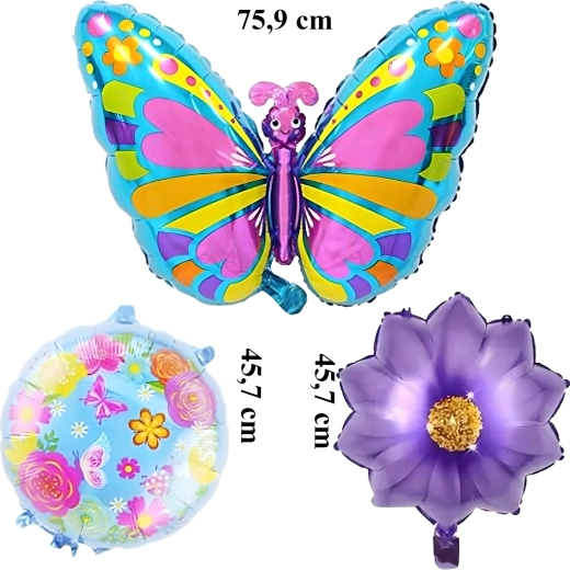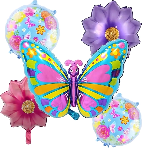 Deze ballonnenset tovert direct een sprookjesachtige sfeer tevoorschijn. De blikvanger is een grote vlinderballon (ca. 75,9 cm), aangevuld met 2 bloemenballonnen en 2 ronde ballonnen met print (ca. 45,7 cm). Ideaal voor verjaardagsfeesten, themafeesten en fotobooths.