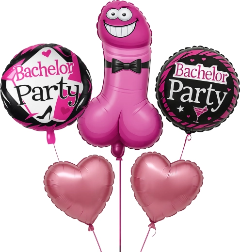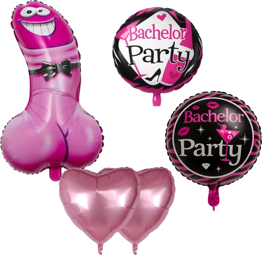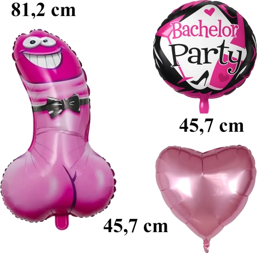 Vrolijke set ballonnen voor een dames-vrijgezellenfeest die zorgt voor een geweldige sfeer op elk feestje. Bevat een grote ballon in de vorm van een “lid” (ca. 81,2 cm), 2 harten en 2 bedrukte ballonnen. Ideaal als decoratie voor de fotobooth en voor onvergetelijke foto’s van de bruid en het Bride-to-Be team.