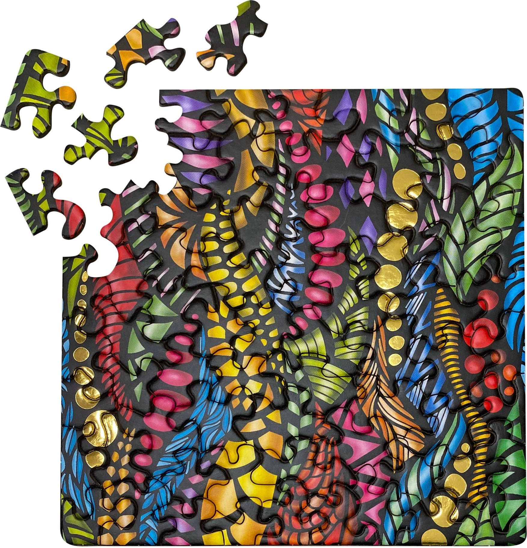 De vierkante puzzel Curiosi Q Gold in patroon I biedt een unieke visuele ervaring dankzij het glanzende gouweffect, dat na het leggen prachtig uitkomt. Met 72 stukjes en ongewone vormen is het leggen speels maar tegelijk aangenaam uitdagend.