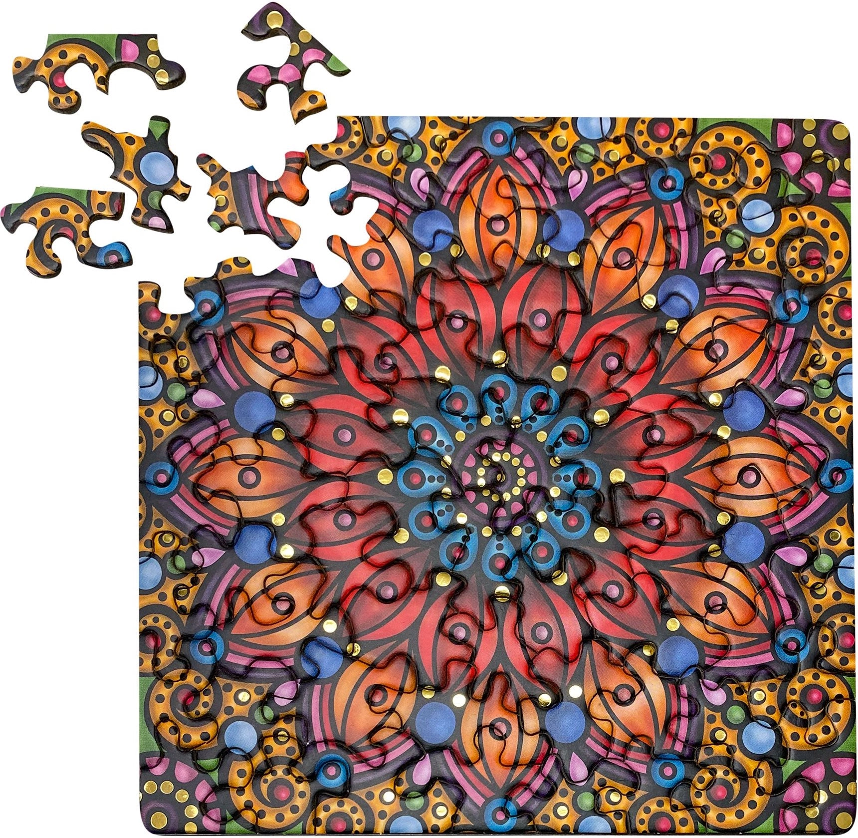 Deze vierkante puzzel is perfect voor iedereen die van uitdagingen in een klein formaat houdt. Dankzij de onconventionele vormen van de stukjes is het leggen leuk en visueel aantrekkelijk, terwijl de gouden glans het eindresultaat een luxueuze touch geeft.
