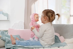 Ontdek de magie van zorgzaam rollenspel met BABY born Hannah – kom spelen. Dankzij het zachte lijfje voelt ze prettig aan, ligt ze fijn in de armen en nodigt ze uit tot knuffelen. Kinderen zullen genieten van de eenvoudige interactie – de pop maakt lieve babygeluidjes, bij het voeden met het flesje klinken schattige drinkgeluidjes en bij het in slaap vallen spint ze zacht en sluit ze haar ogen.