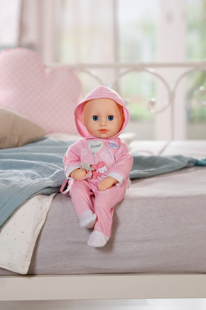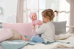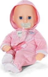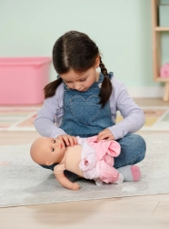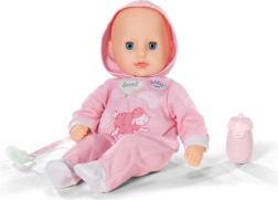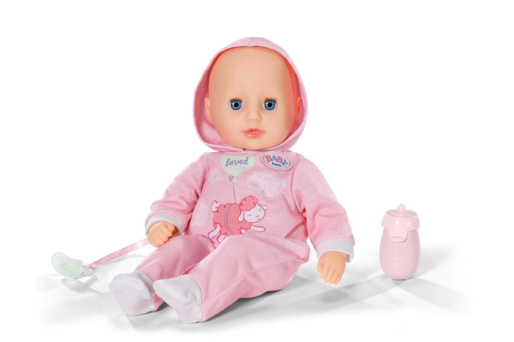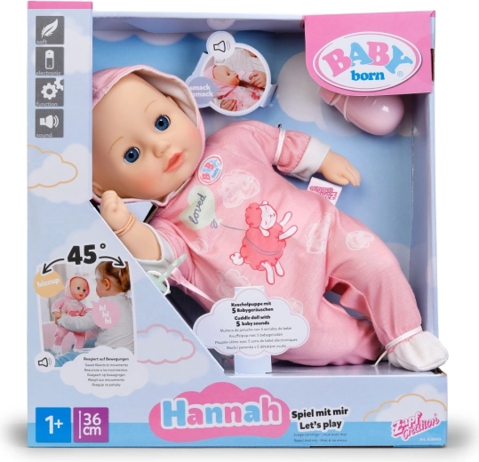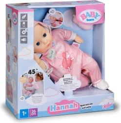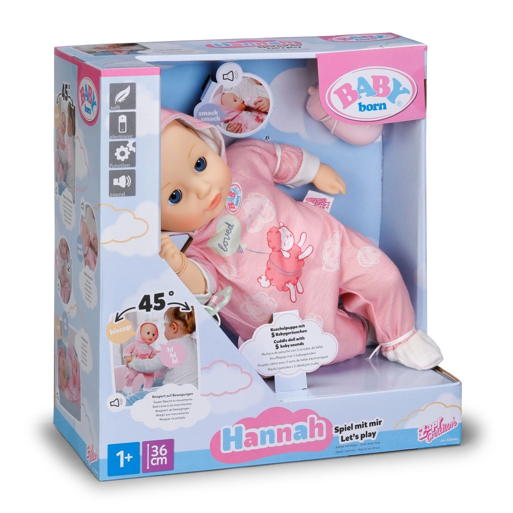 De schattige pop BABY born Hannah van 36 cm is de ideale vriendin voor dagelijks spelen en knuffelen. Ze heeft een zacht stoffen lijfje, realistische babygeluidjes, kan uit het flesje drinken met drinkgeluidjes, sluit haar ogen en maakt bij het in slaap vallen zachte, rustgevende geluiden. In de verpakking zitten een speen en een flesje.