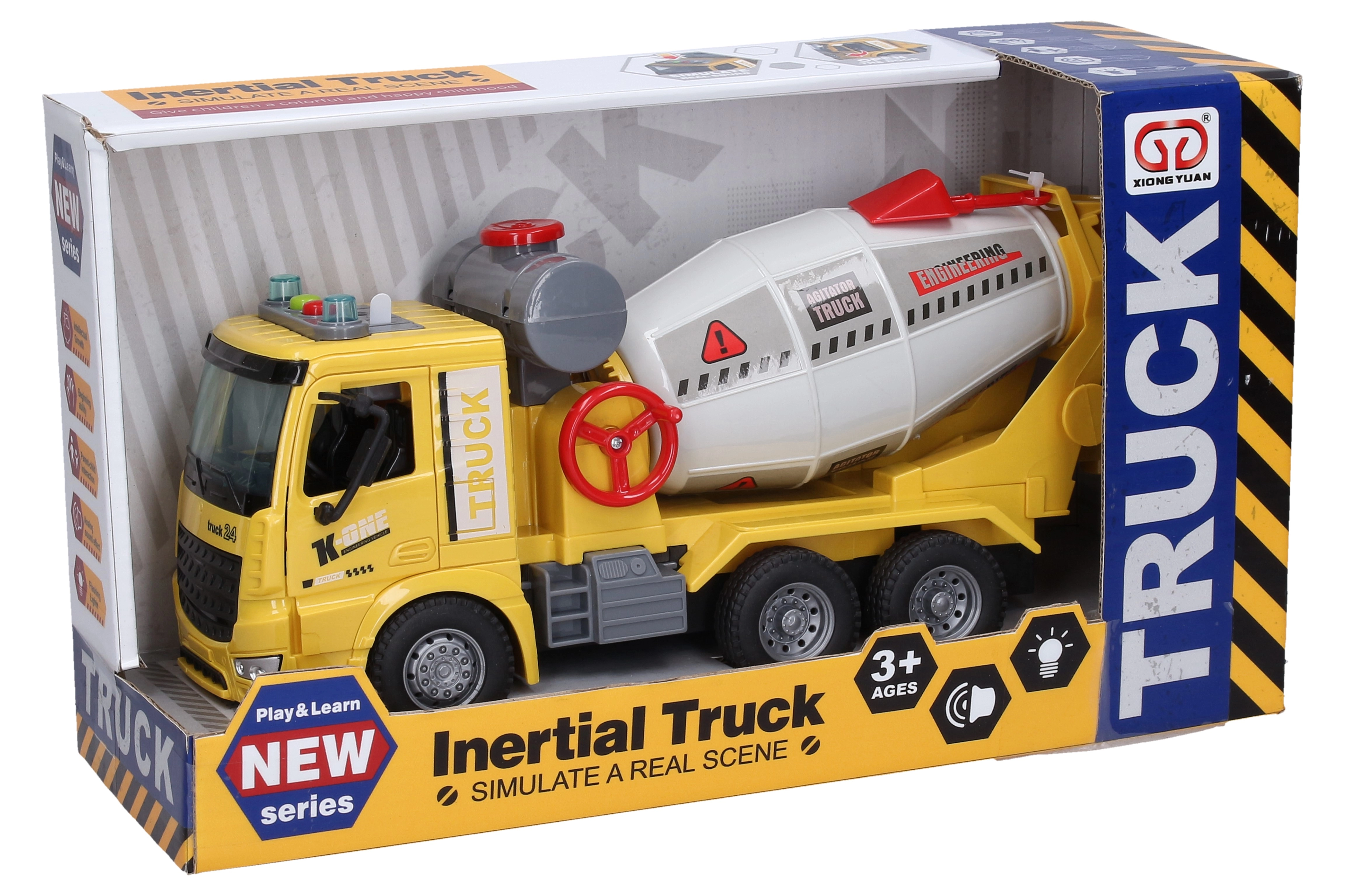 Realistische bouwbetonmixer voor kleine bouwers, boordevol plezier dankzij het vliegwiel voor snelle ritten, licht- en geluidseffecten en eenvoudige bediening via knoppen op het dak. Batterijen zijn inbegrepen, zodat kinderen meteen na het uitpakken kunnen spelen.