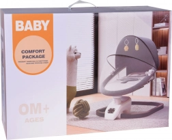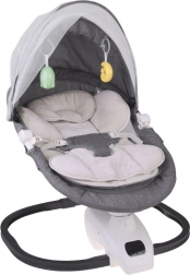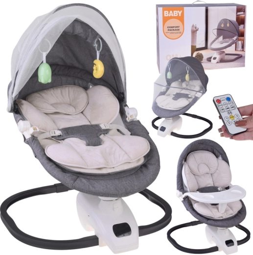 Het geïntegreerde paneel met muziek en de afstandsbediening laten je de schommelintensiteit, het volume instellen, slaapliedjes kiezen en de timer gebruiken (bijv. 8/15/30 min). De verstelbare kap met speeltjes schermt tegen licht, het fijne muggennet beschermt tegen insecten. De bekleding is eenvoudig afneembaar en wasbaar, de constructie is stabiel en veilig.