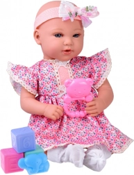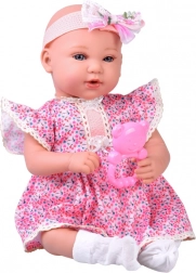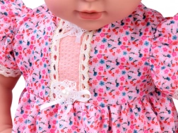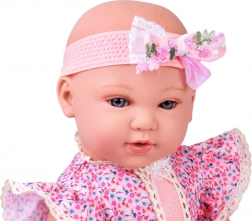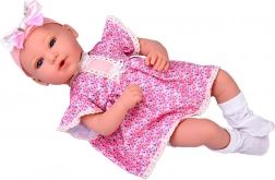 Een schattige interactieve babypop van 46 cm betovert met haar realistisch gezichtje, lange wimpers en zacht buikje. Ze heeft gewrichte ledematen voor eenvoudig poseren, draagt een fijn lila jurkje met kant en bevat een geluidsmodule voor nog echter speelplezier. In de set vind je ook pastelkleurige accessoires voor afwisselend rollenspel en verzorging.