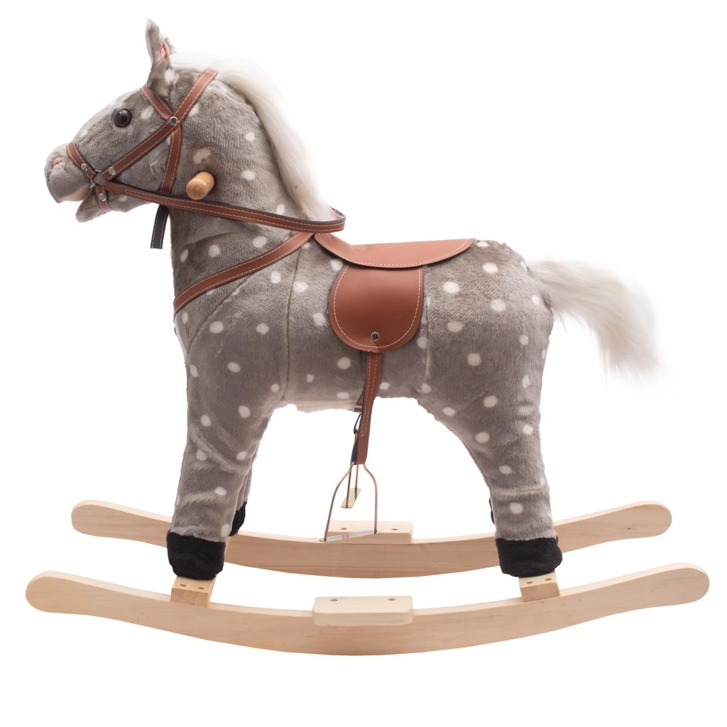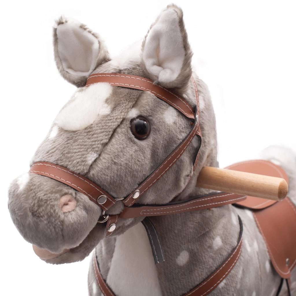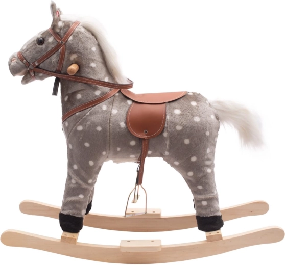 Het PlayTo schommelpaard in een elegante grijs-witte gevlekte uitvoering is een uitstekende keuze voor dagelijks speelplezier. Dankzij de zachte pluche voelt het prettig aan, terwijl de robuuste houten latten en de gevormde zitting zorgen voor comfortabel en veilig schommelen. De interactieve oortjes starten het bekende liedje Prší, prší in Tsjechische of Slowaakse versie en het paardje beweegt daarbij zijn mondje.