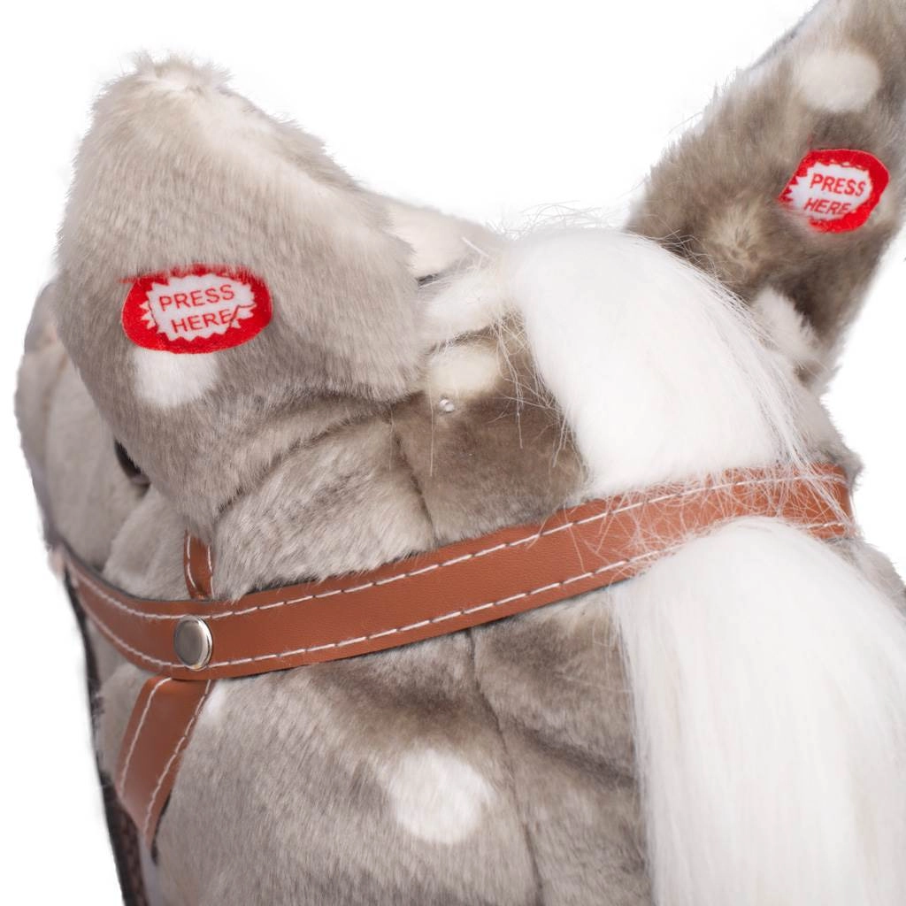 Bij het indrukken van het oor beweegt het paardje zijn mondje en speelt het het liedje Prší, prší in het Tsjechisch of Slowaaks. Geweldig voor plezier en ontwikkeling van het gehoor.