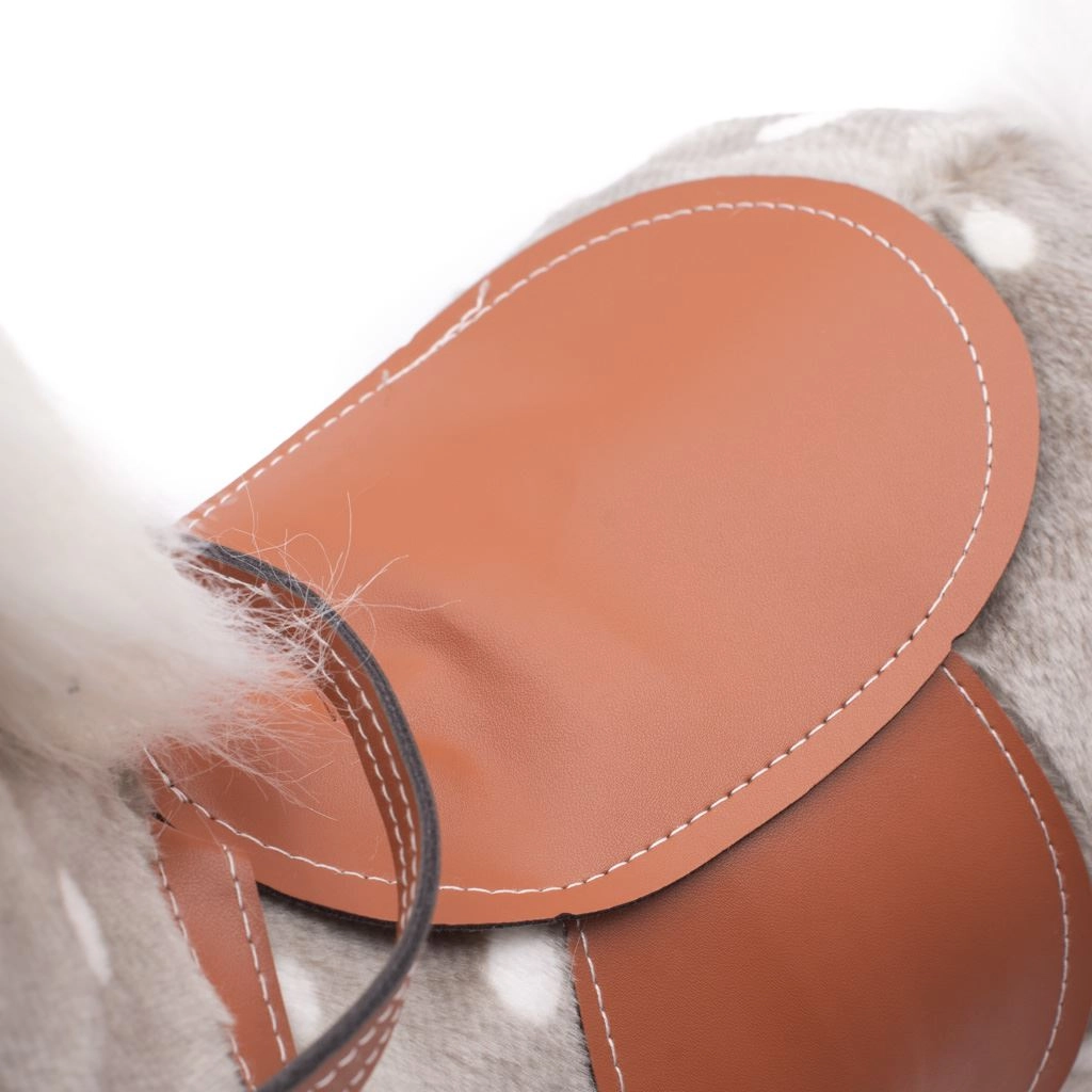 - Comfort en stijl – zachte pluche, bruin zadel en teugels, subtiele vlektekening.