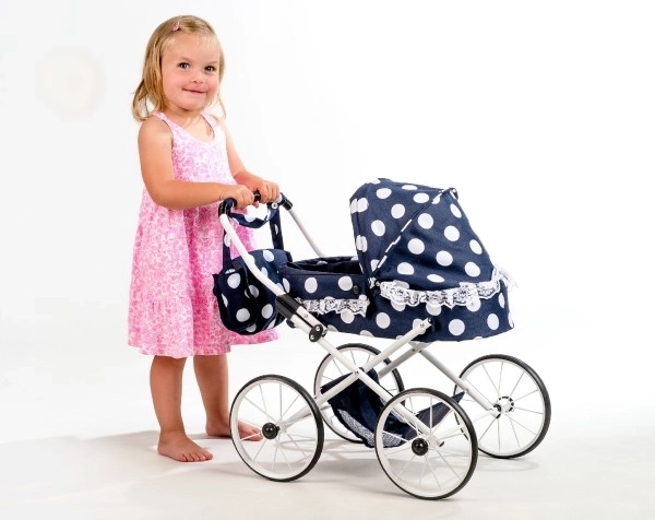 Stijlvolle poppenwagen in retro design die elke kleine mama zal verrassen. Hij biedt een zwart design met stippen en elegant kant, een verstelbare duwbeugel van 55 cm voor comfortabel rijden en een inklapbare kap voor eenvoudige bediening. Inclusief een tasje over de duwbeugel en een praktische ondermand voor kleine spulletjes.