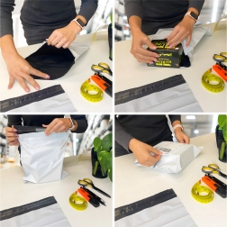Plaats het product, verwijder de beschermfolie, sluit en plak het label. Ideaal voor efficiënte orderverwerking in webshops.