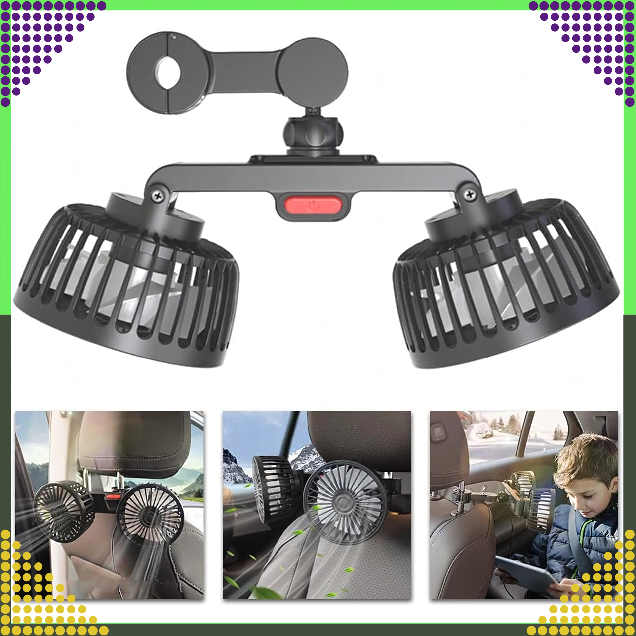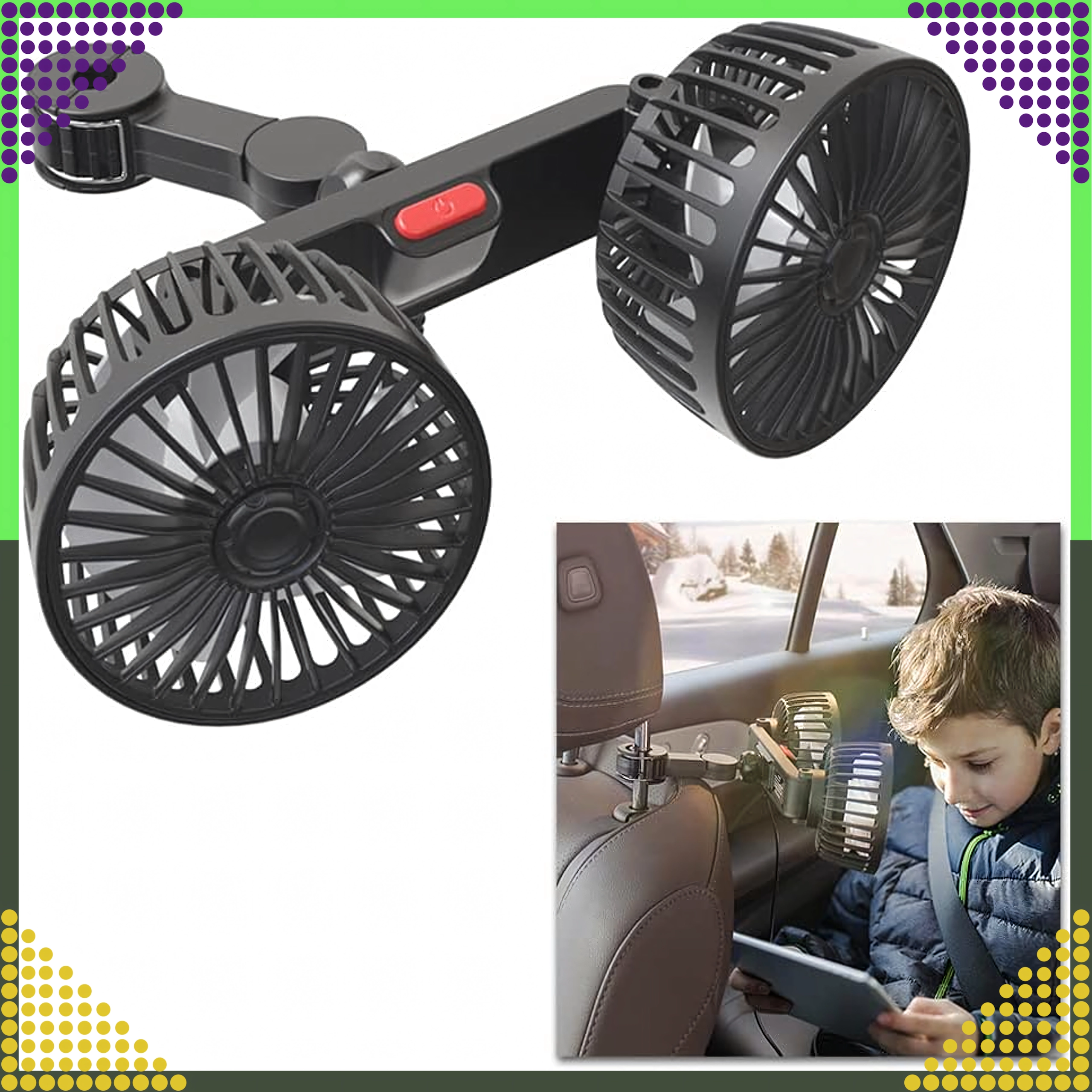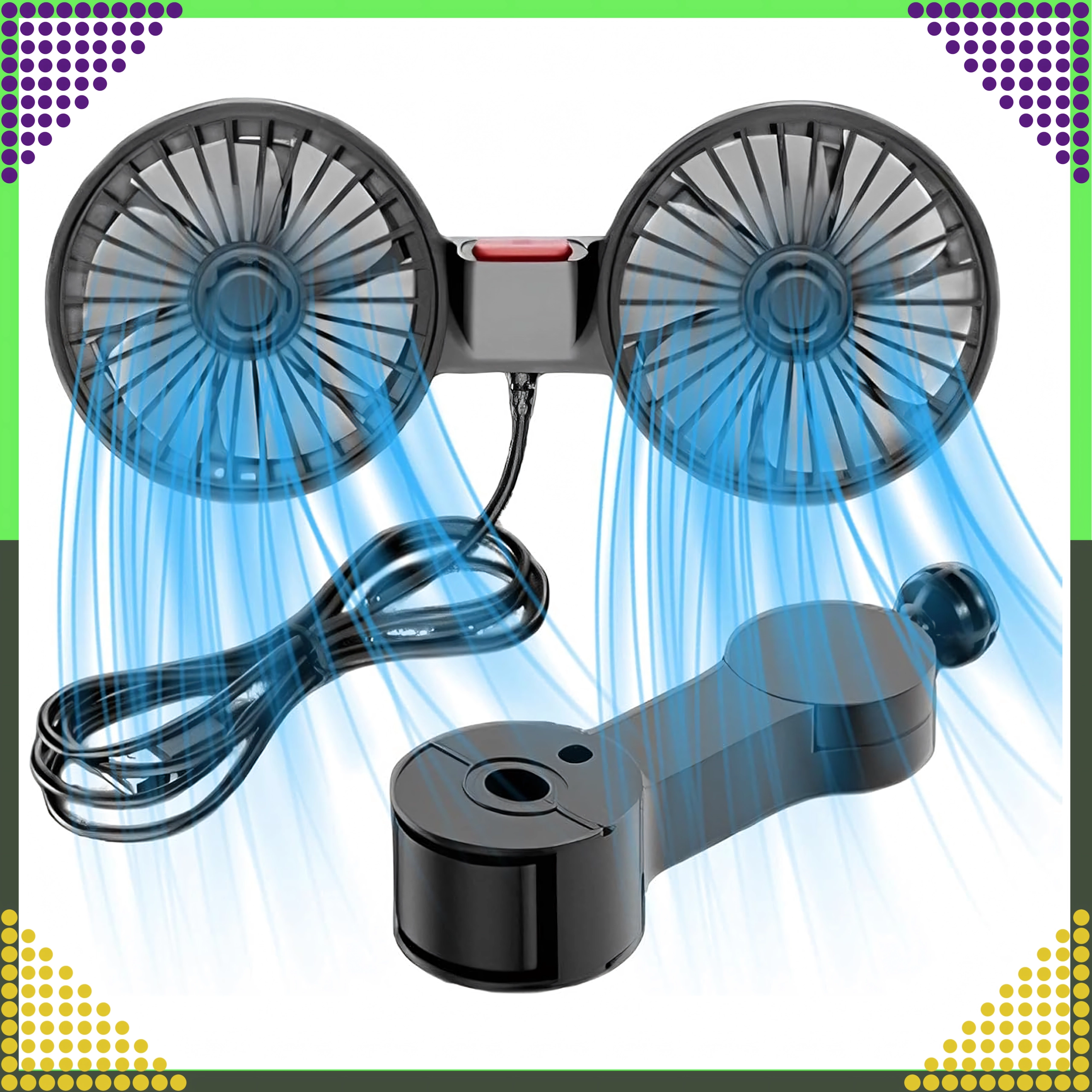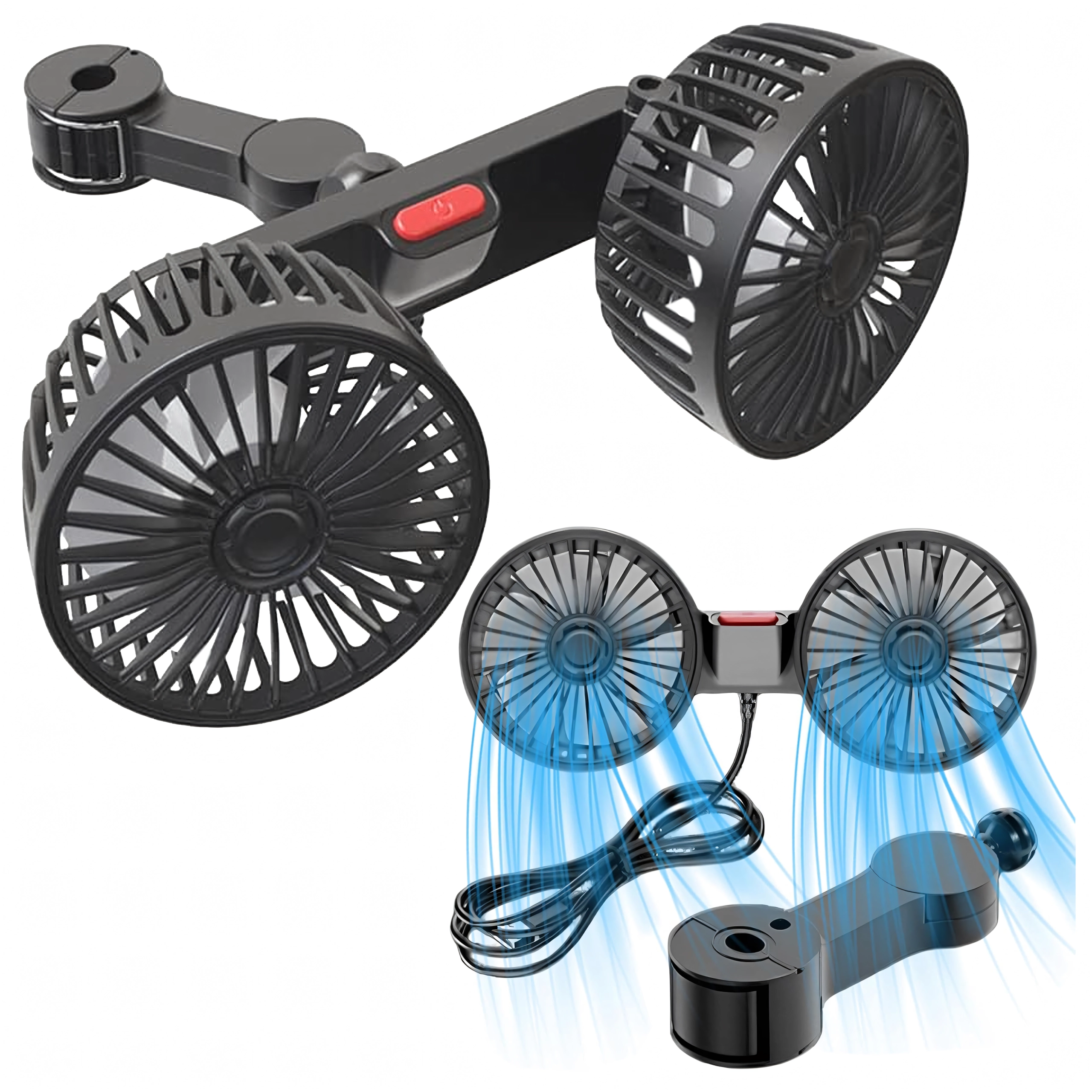 Compacte dubbele ventilator voor de hoofdsteun met krachtige luchtstroom en stille koeling voor de achterbank. Dankzij de 360° draaibare koppen richt je de lucht precies waar nodig. Werkt op 12/24 V in de auto of 5 V via USB, ideaal voor auto, camper, kinderwagen of kamperen.