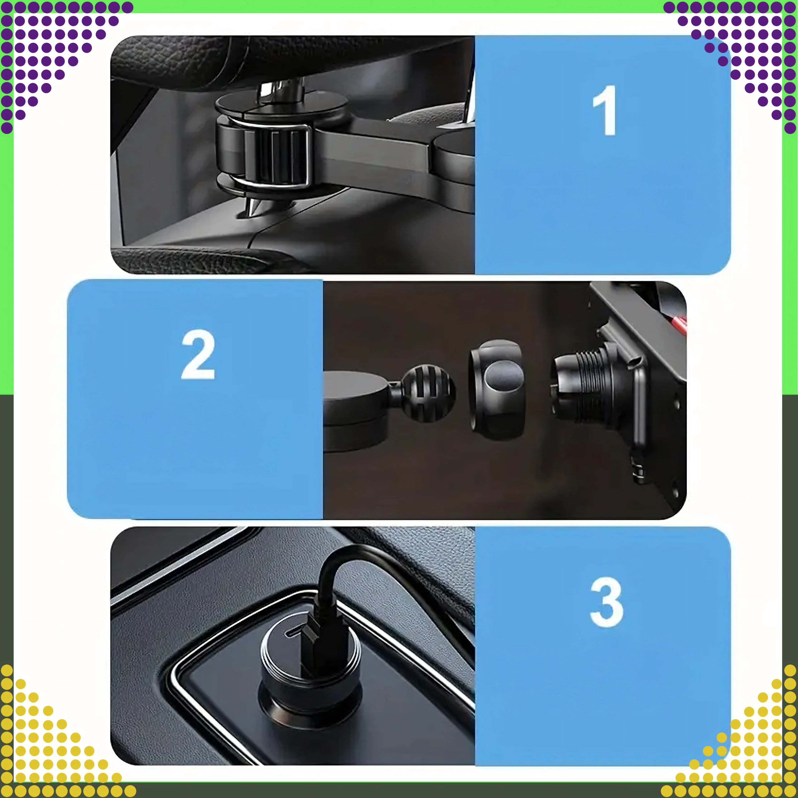 Dankzij de voeding via 12/24 V én USB 5 V is het apparaat veelzijdig – sluit hem aan in de auto, op een powerbank, laptop of adapter. Eenvoudige installatie met een klem op de stangen van de hoofdsteun; geen boren of gereedschap nodig.