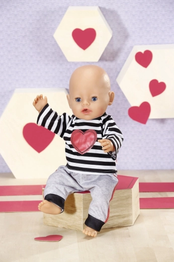 De stijlvolle Dolly Moda set biedt comfort en flair voor dagelijks speelplezier. Dankzij de universele pasvorm past hij perfect op poppen van 39–46 cm, inclusief BABY born en Baby Annabell. De set bevat een gestreepte sweatshirt met lange mouwen en een groot rood hart en comfortabele grijze joggingbroek met contrasterende boorden en rode zijstrepen. Universele maat, hoogwaardige afwerking en stimulans voor creativiteit en rollenspel maken deze set tot een geweldige accessoire voor elke pop.