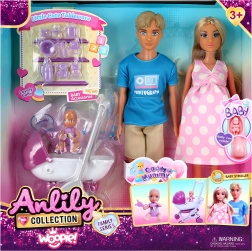 - Zwanger mama met uitneembare baby, papa, baby, kinderwagen, accessoires (fles, kom, speen, luiers, kam, bordje)