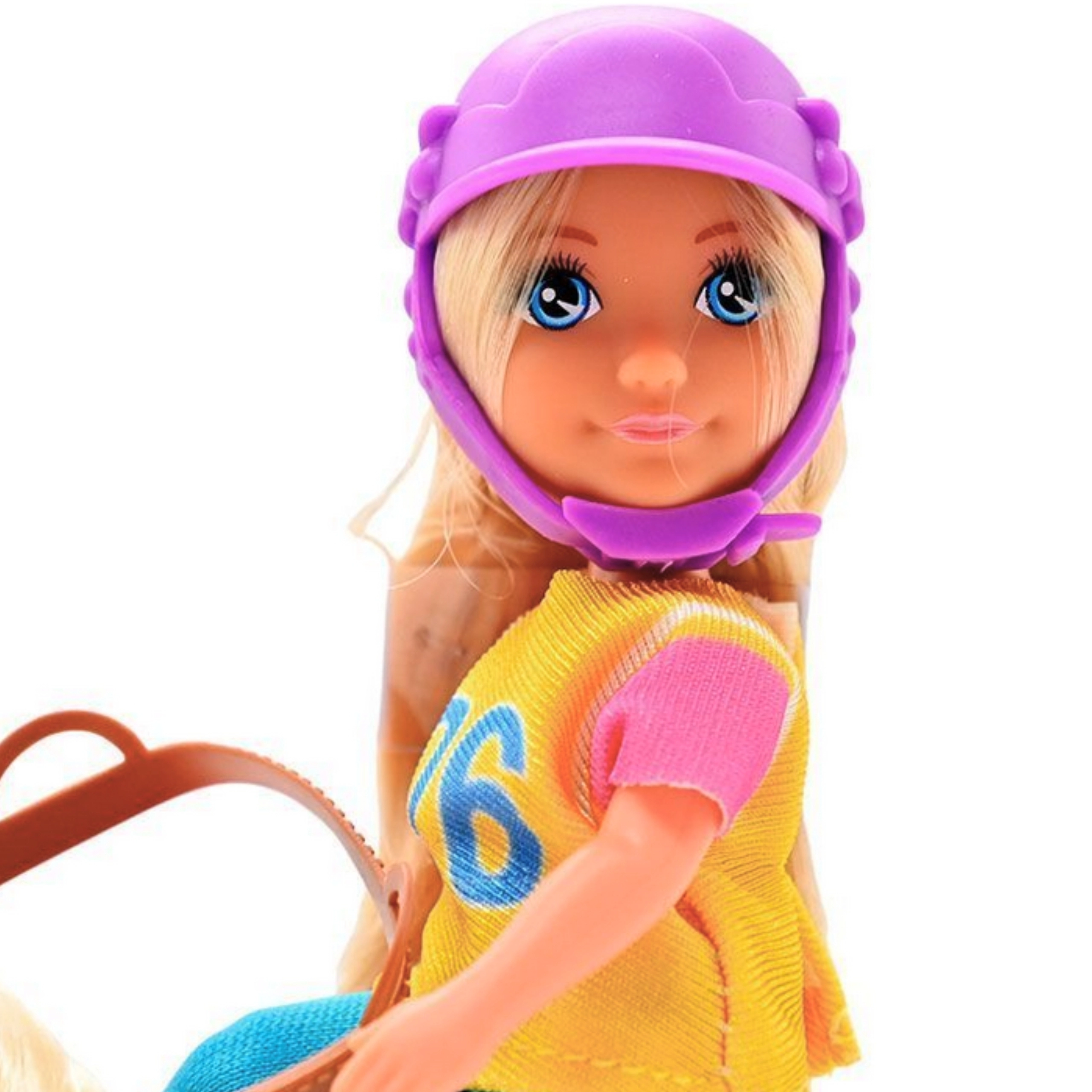 - Stijlvolle look – paarse helm, roze en gele details, lichtbruine pony