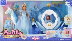Een betoverende set voor kleine sprookjesliefhebbers met alles voor koninklijk plezier: een prinses in een sprankelende blauwe jurk met kroontje, een majestueus wit paard en een grote koets met transparante elementen die tijdens het spelen licht geeft. Het lange blonde haar van de pop en de gedetailleerde accessoires stimuleren fantasie en het vertellen van verhalen.