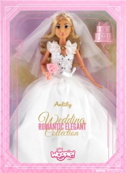Duik in de wereld van elegantie en romantiek met bruids pop Lily. De mooie bruid in een witte tule rok met versierd korset en een fijne sluier verrast door de precieze afwerking van details. In haar hand houdt ze een schattig boeket rozen en haar lange, lichte haar nodigt uit om te kammen en te stylen.