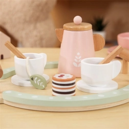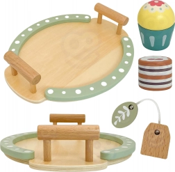 - Inhoud van de set: dienblad, theepot met deksel, suikerpot, 2 kopjes met lepeltjes, schoteltjes/bordjes, theezakje, houten taartje en koekje.
