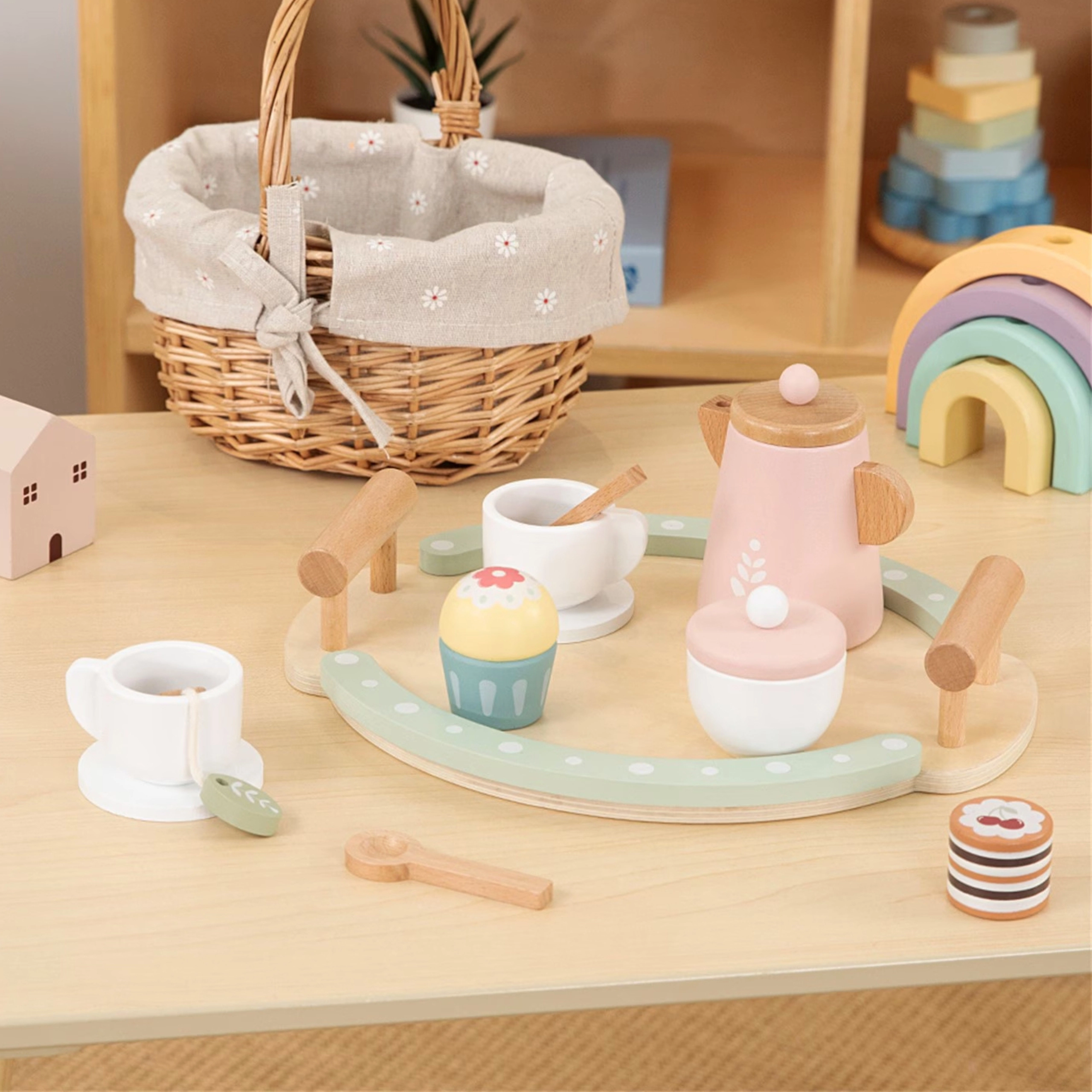 Nodig kinderen uit voor een middagthee met de elegante houten set WOOPIE GREEN. In pastelkleuren roze en mint biedt het een complete uitrusting om een feest of café na te spelen. Gemaakt van duurzaam hout met veilige afwerkingen voor langdurig, creatief en veilig spel. Stimuleert de verbeelding, creativiteit, fijne motoriek en samenwerking bij kinderen vanaf 3 jaar.