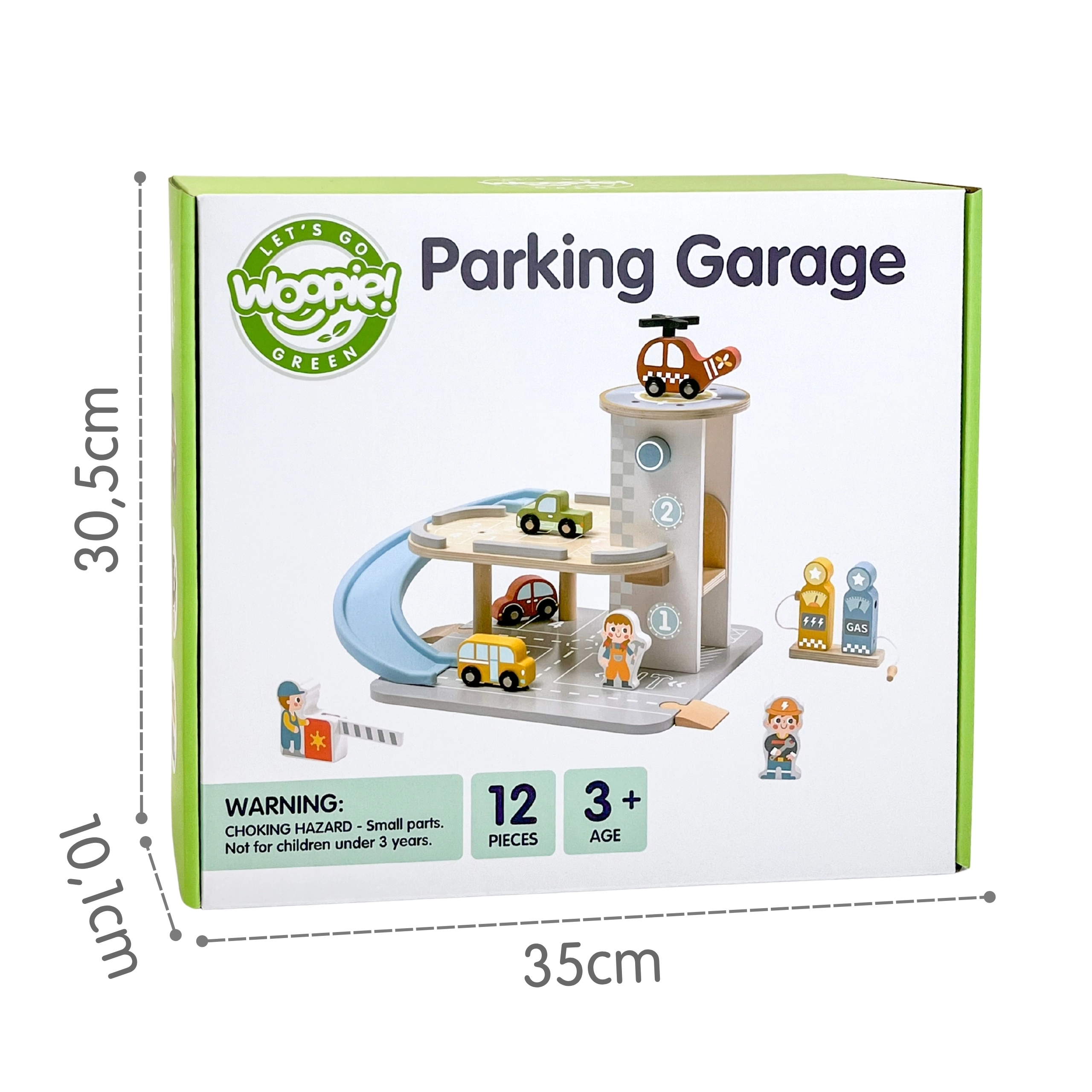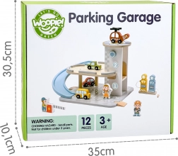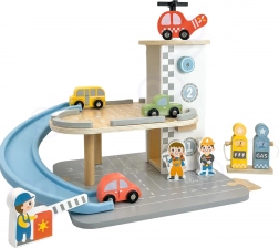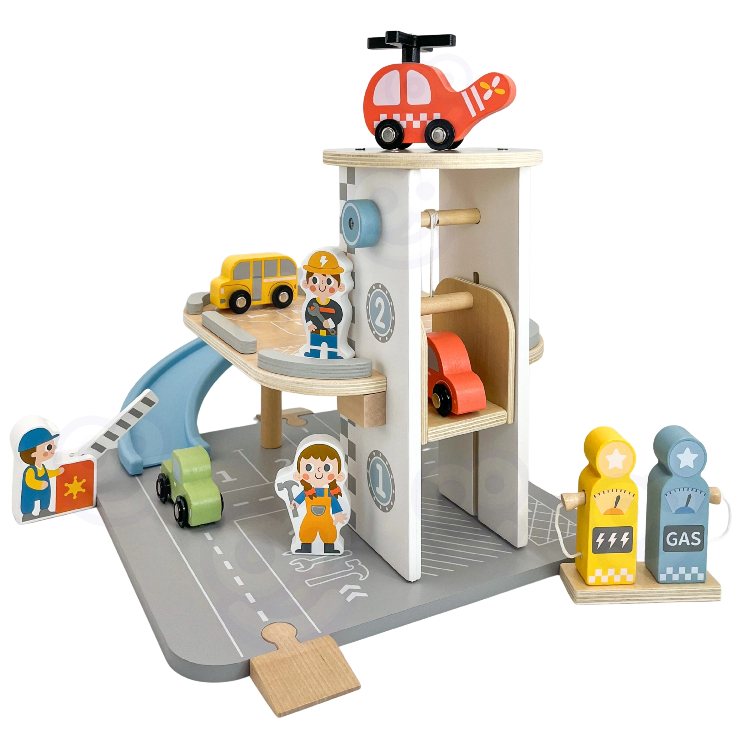 De 2-in-1 houten parkeergarage combineert een garage met twee niveaus en een tankstation, zodat kinderen kunnen spelen met rijden, parkeren en tanken. De autootjes zoeven over de blauwe spiraalhelling, de helikopter met draaiende rotor landt op het dak-heliplatform en de bedieningsfiguurtjes zorgen voor het verkeer. De hoogwaardige afwerking van hout en de stabiele basis zorgen voor veilig spel vanaf 3 jaar.